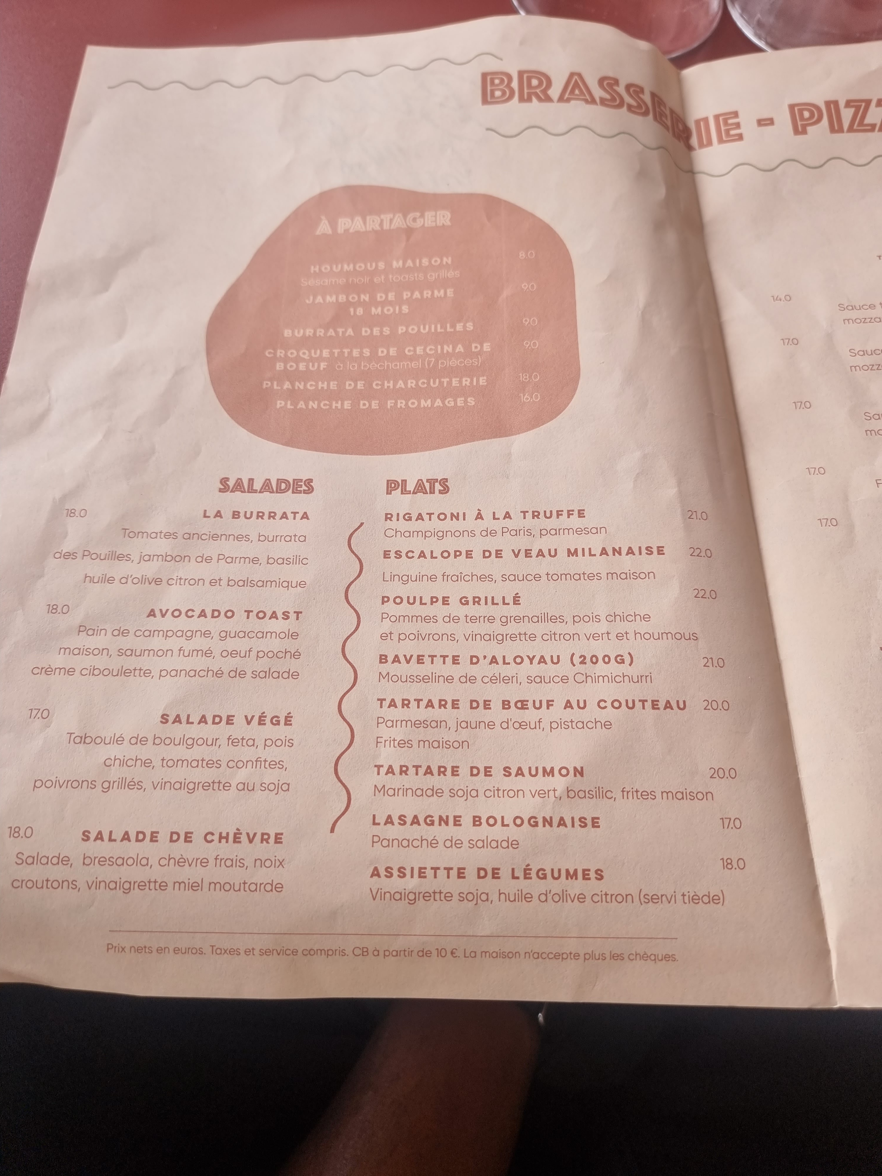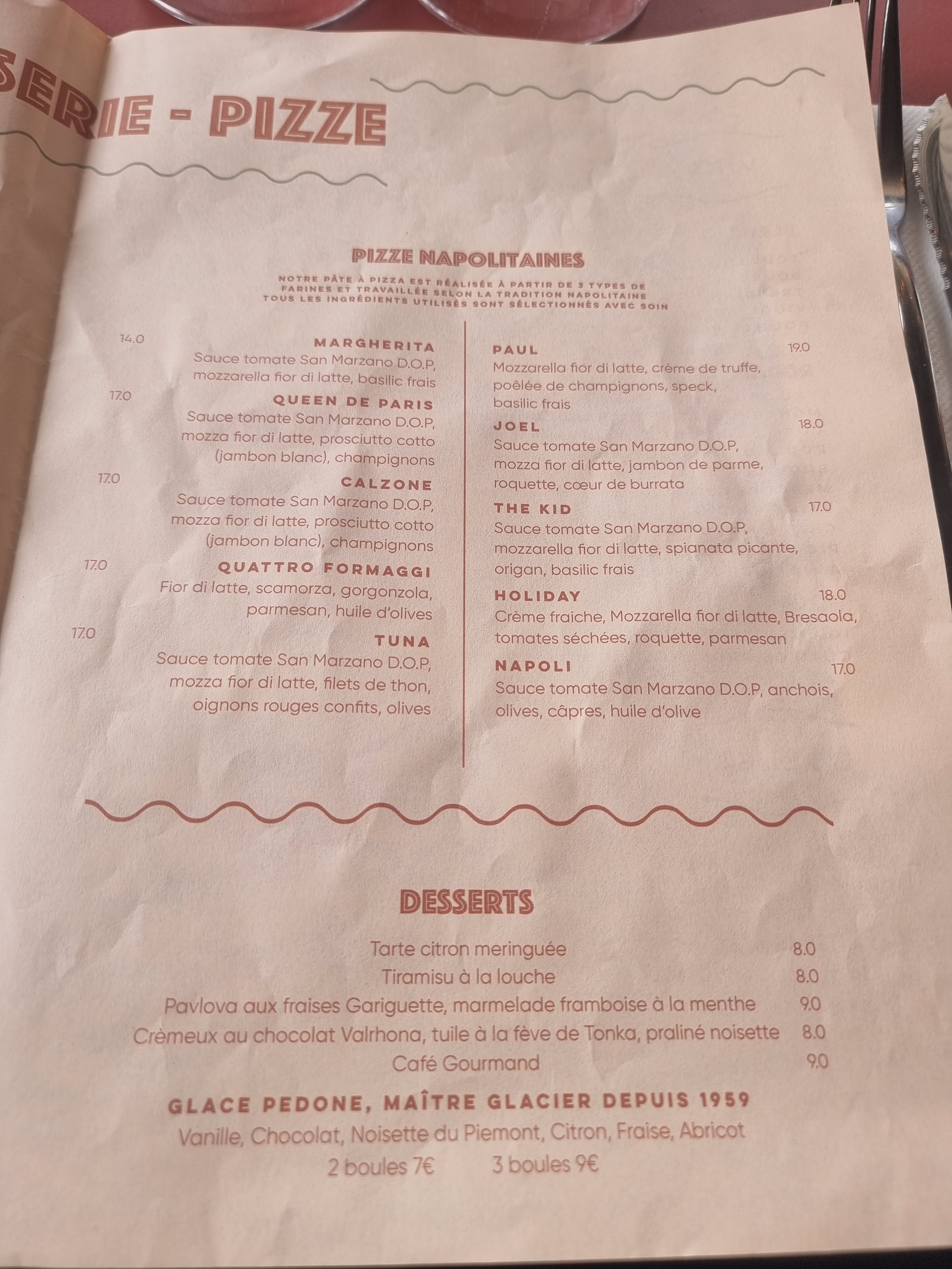 Le premier passage n’aura pas été un succès… 40 min environ pour avoir le plat, 1h20 sur place histoire de terminer avec un dessert. C’est long, trop long ! La seconde fois était en effet la bonne, mais comme souvent dans le quartier mieux vaut arriver plutôt tôt. Sinon, niveau goût, franchement rien a redire, c’est bien préparé on se régale! Les prix, on va dire dans la moyenne, sûrement un peu haute, mais dans la moyenne. J’ai toujours du mal avec des desserts à 8€ et le café gourmand à 9€…. Du coup pizza 🍕+ Tiramisu 🍰 = 24€