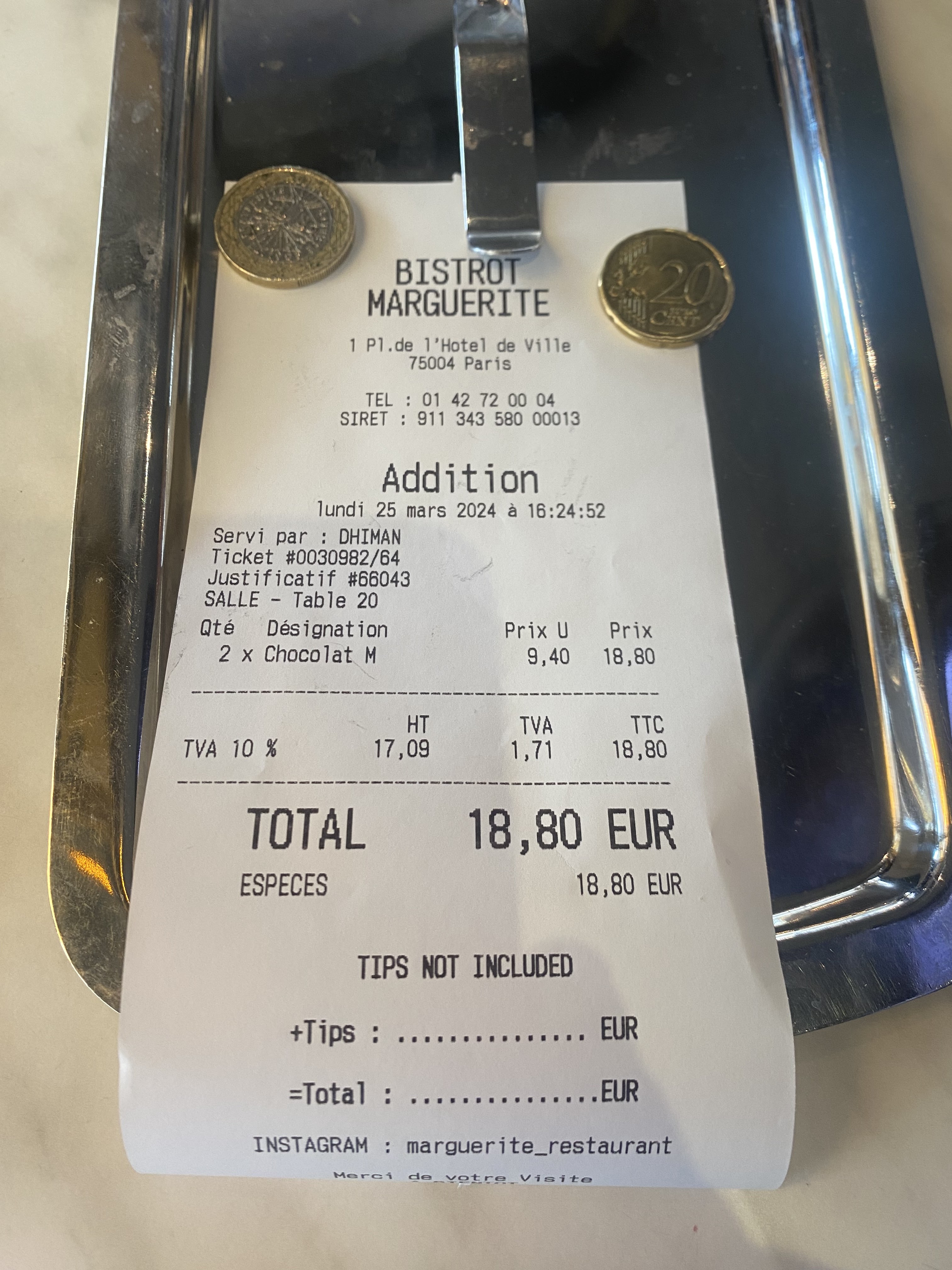 Très content de mon passage au Marguerite. Nourriture bonne et service excellent, à deux pas de Notre Dame. Merci aux ser veurs Germain et Ludivine pour leurs attentions particulière.