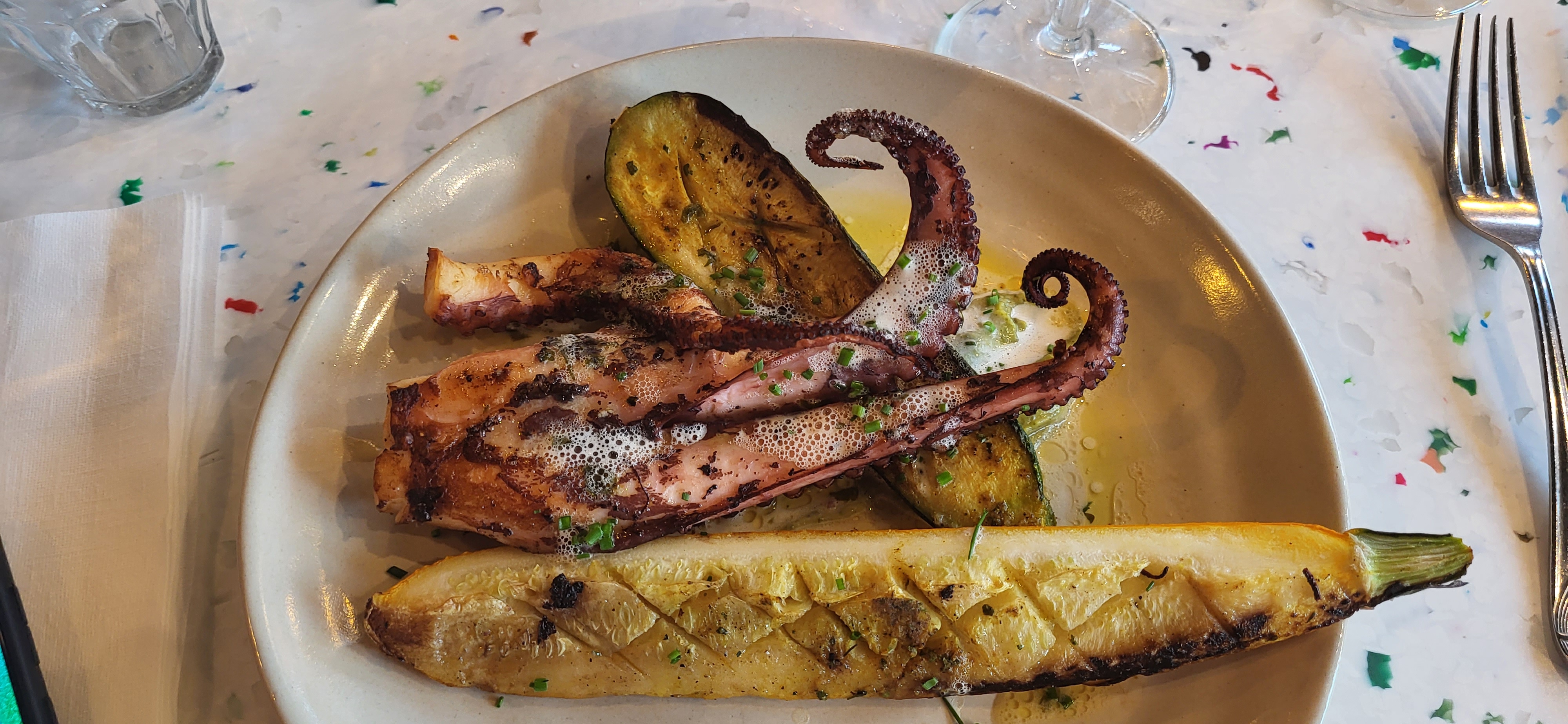 Assiette très minimaliste Juste l’essentiel un morceau de poulpe et 2 quarts de courgettes grillées Pas de chance ce soir là une grande tablée avec des enfants qui hurlaient Difficile de manger un repas dans le calme