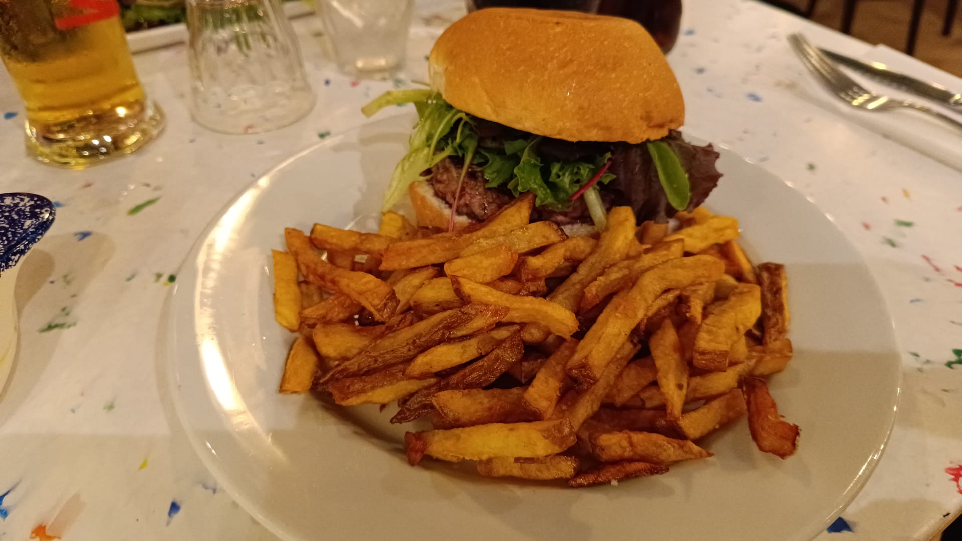 Burger trop bon avec steak de bœuf façon bouchère, moules Bon Jour tellement bonnes qu'on sauce le jus avec du pain ! Beau cadre avec une belle déco et les serveurs et serveuses sont très sympas.