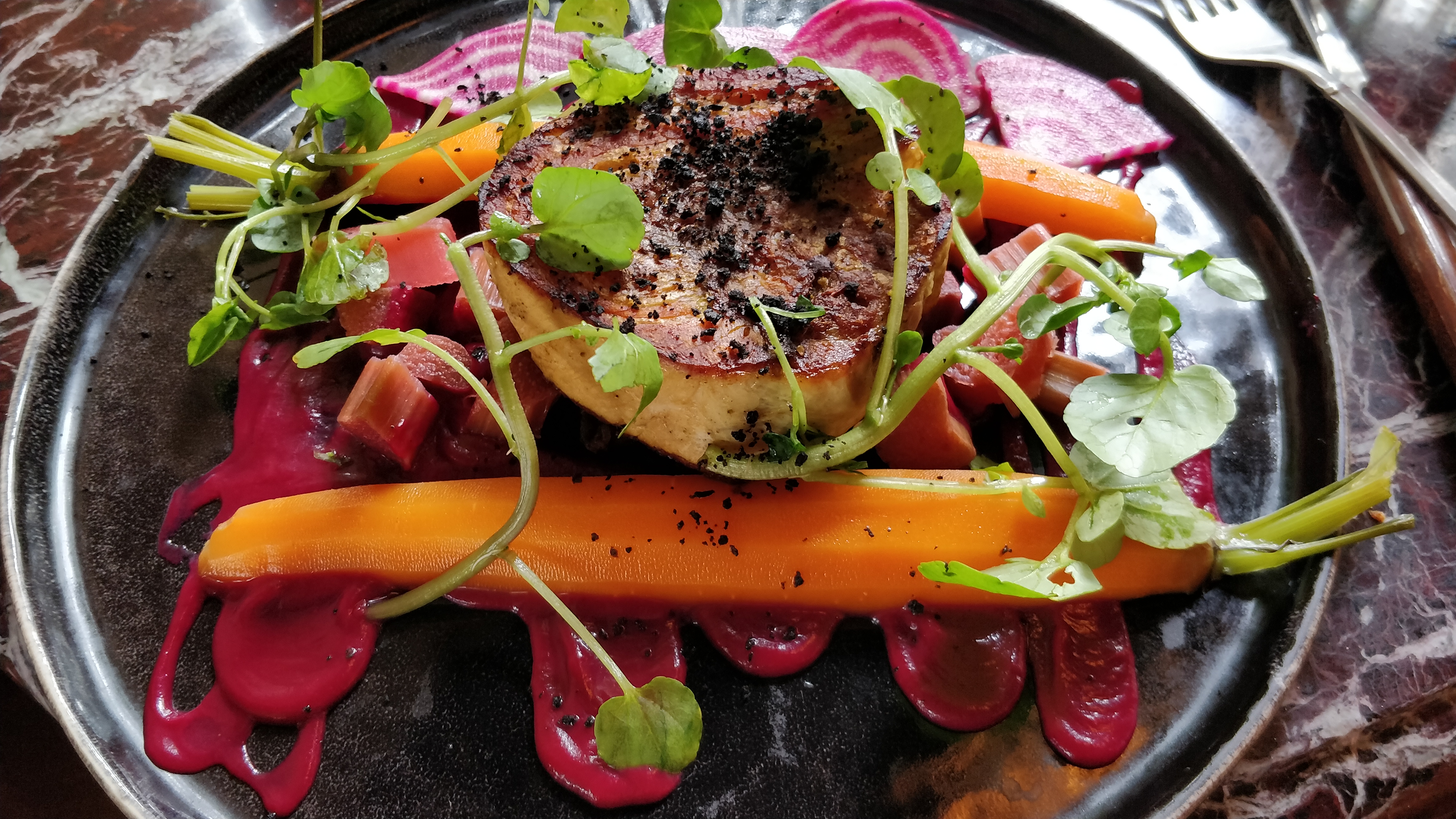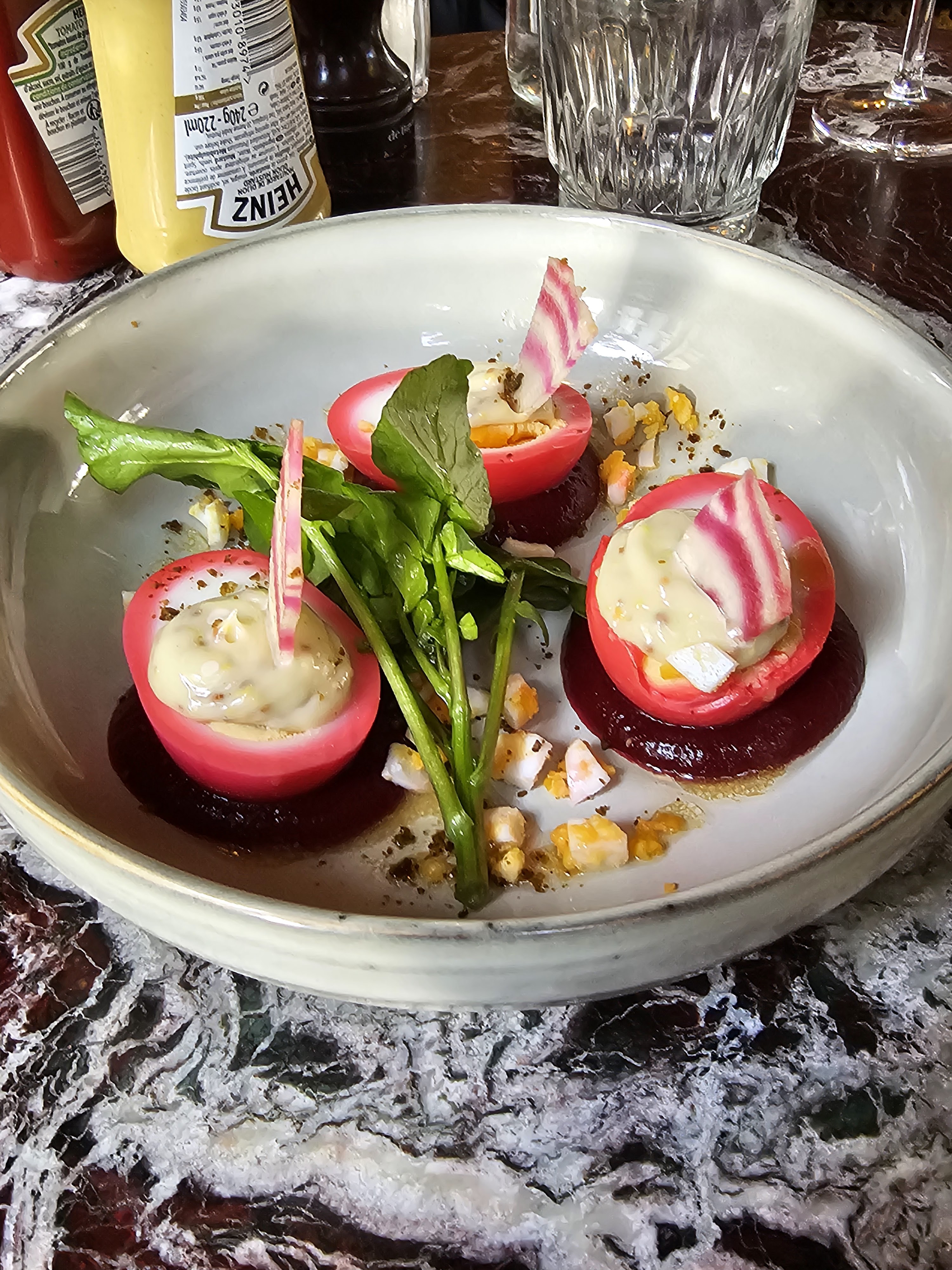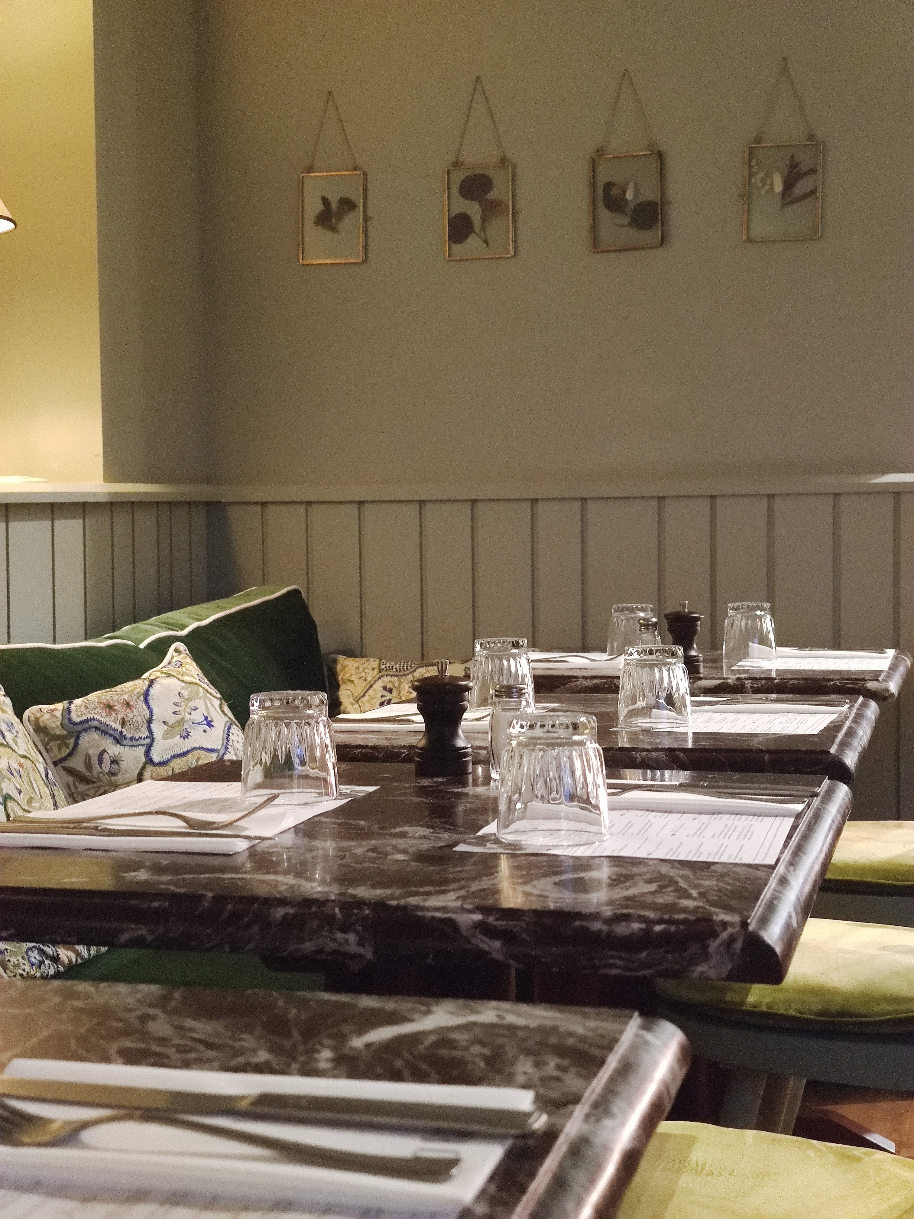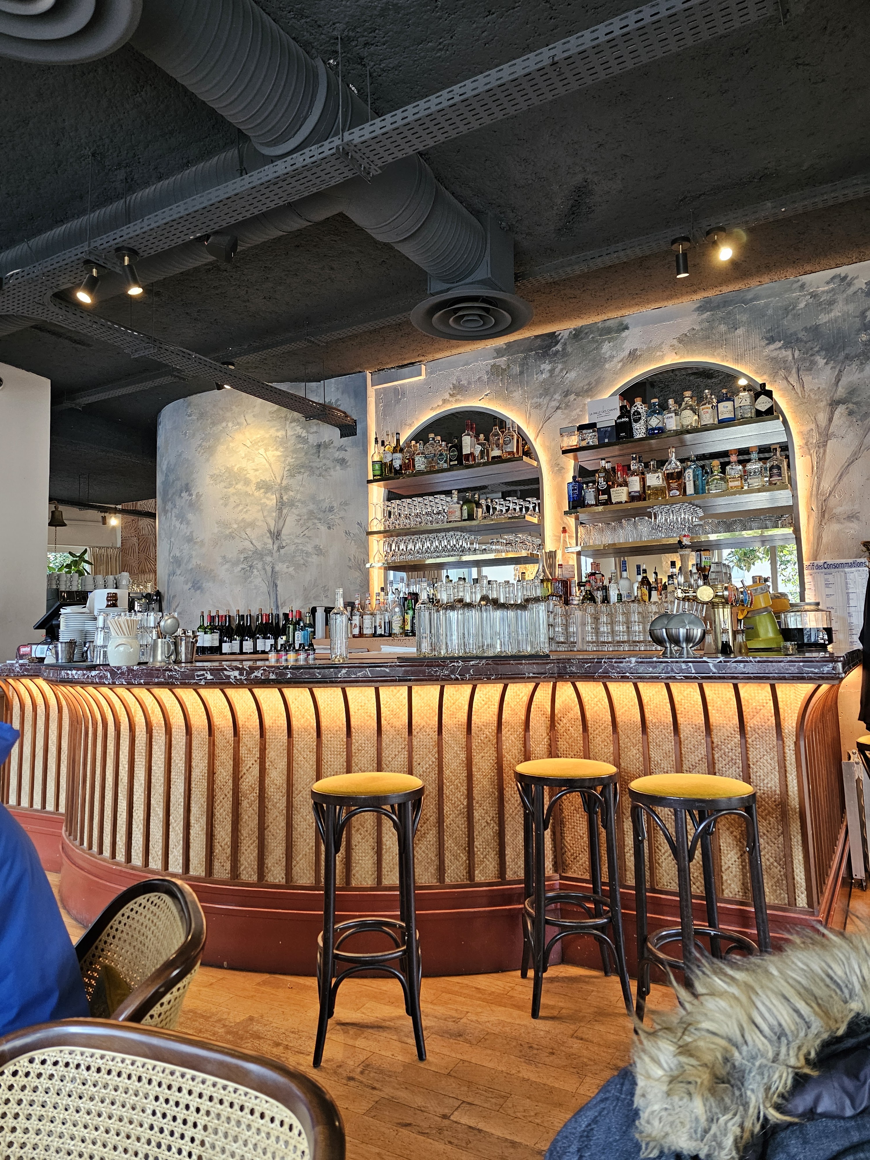 En quête d'un endroit pour me restaurer dans les environs, j'ai décidé de poser mes pas à cet endroit. J'ai préféré prendre une table à l'intérieur contrairement à d'autres personnes en terrasse. Serveurs et barman amicaux, s'assurant que tout se passe bien. J'ai opté par du saumon en entrée avec de la sauce yuzu. Du radis et de la burrata si je m'en souviens. La boule glacée de sorbet de mangue, c'était succulent. En plat, un cochon cuit pendant 8 heures avec des carottes, betterave, radis et rhubarbe. La sauce ketchup betterave, je ne connaissais pas cela. Pour accomplir ce repas, une bouteille de vin rouge. Pour terminer le tout, je suis partis sur une brioche perdue avec son caramel et sa chantilly en bière. J'ai bien aimé l'intérieur de cet endroit, surtout la décoration en dessus de ma tête. Cette brasserie est un peu chic quand on voit les prix sur la carte mais au moins, la quantité est là avec de la bonne qualité. La cuisine, je la qualifierais de fusion et moderne à cause de la mélange des saveurs et des produits employés. J'ai vu sur leur menu qu'ils étaient capables d'adapter votre nourriture en fonction de vos restrictions alimentaires. J'avais oublié mon chapeau sur un fauteuil en partant et plusieurs minutes plus tard, je me suis rendu compte de cela. Je suis revenu, une des personnes l'avait mise sur un porte-manteau pour que je le récupère.