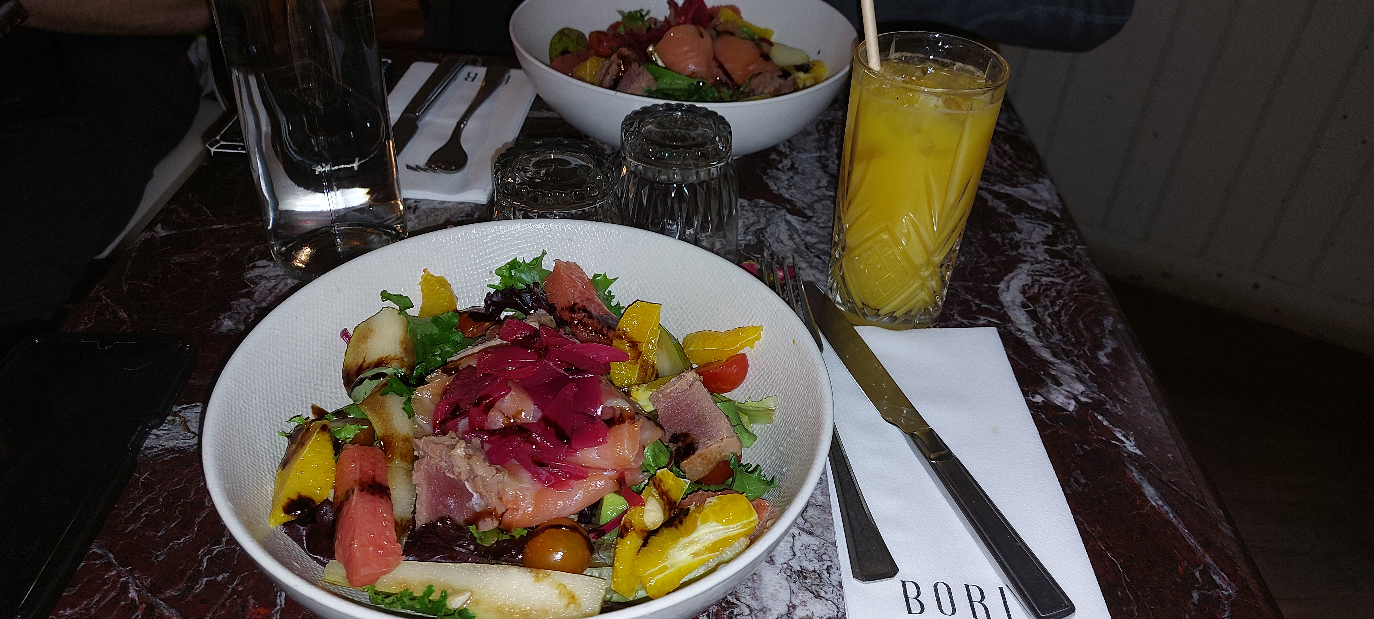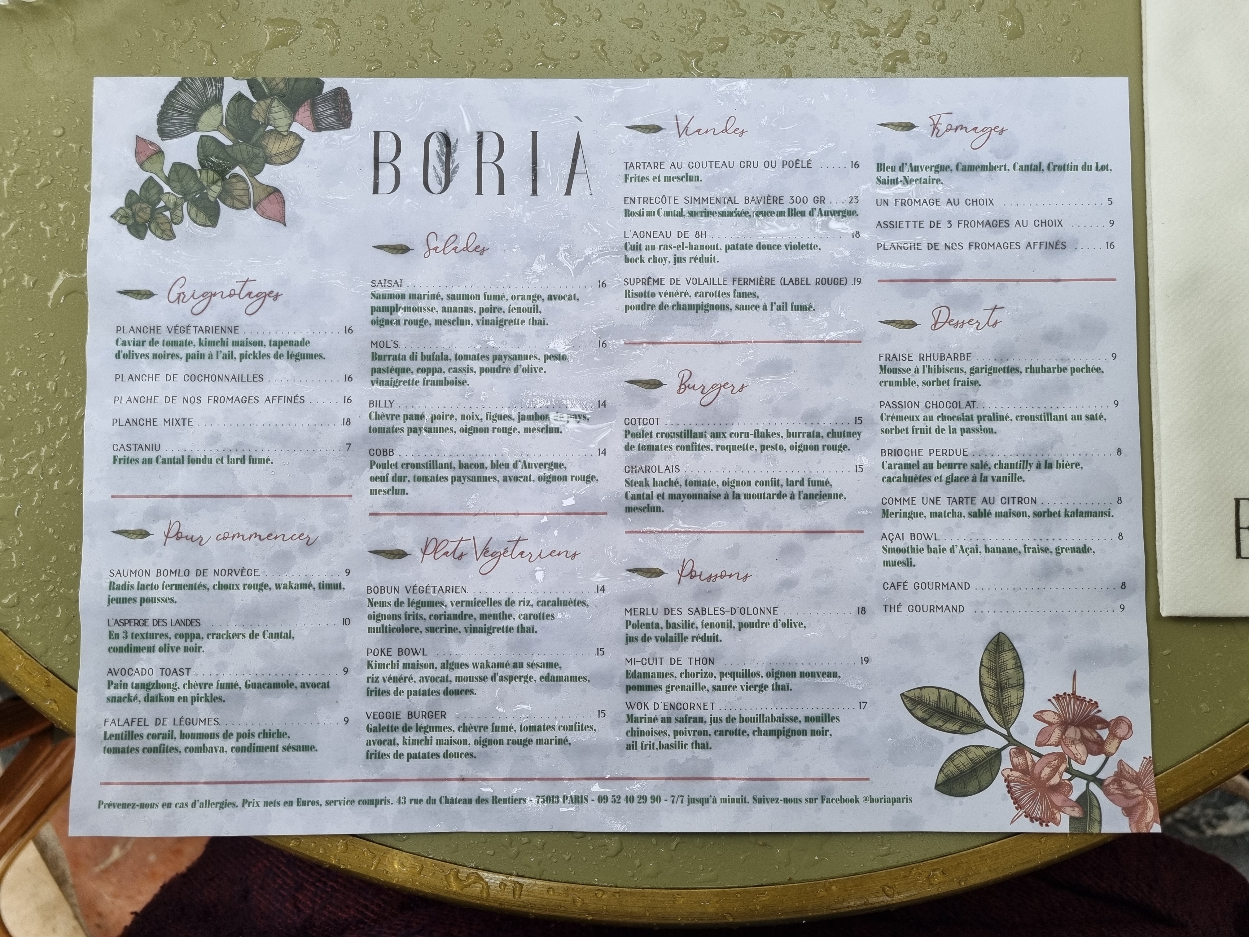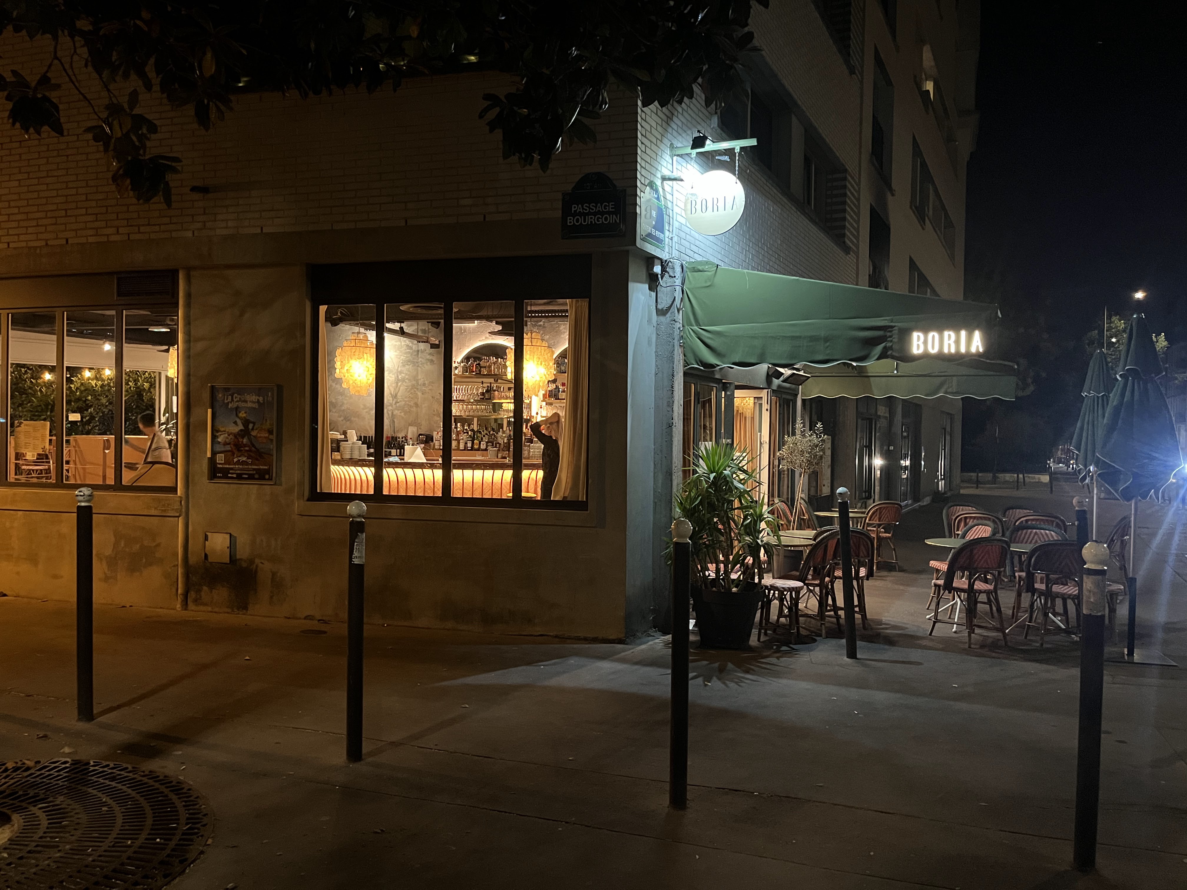 En arrivant à Boria, vous comprenez vite qu'on cherche à vous en mettre plein les yeux. Par la suite, vous comprenez que c'est un cache-misère. Si le cadre peut séduire les corporates qui cherchent à se détendre après leur journée difficile, vous déchantez vite quand on place sous une enceinte diffusant Coolio. Vous pouvez toujours demander à baisser, mais n'attendez pas forcément un résultat satisfaisant. Parlons nourriture. La carte a priori alléchante vous mettra tout de même en difficulté : à ce prix, pas de faux pas permis. Malheur ! Car il n'y a quasiment que ça, des faux pas. Les assiettes consistent en des assemblages agréablement présentés, autant dire des camouflages. Camouflages de produits bas de gamme, sans goût (fèves, frites froides : certains avis en font déjà état), parfois carrément maigres (les maquereaux par exemple), douteux (viandes trop cuites, sauce provoquant une sensation de picotement, goût de brûlé), malgré l'apparente abondance de crudités et féculents permettant au gérant de limiter la prise de risque financier. Les combinaisons de saveur n'ont pas été réfléchies et on se retrouve au final avec dans l'assiette des éléments disparates rassemblés là sans raison autre que la surprise que cela suscite en lisant la carte. En tout cas, sans raison gustative. Voilà, au final, pour 22€ -sans boisson ni dessert- à quoi vous pouvez vous attendre ici. Compte tenu de la facilité avec laquelle on peut manger correctement pour deux fois moins d'argent dans le quartier, j'imagine que les gens qui remplissent la terrasse le font... par conformisme ?