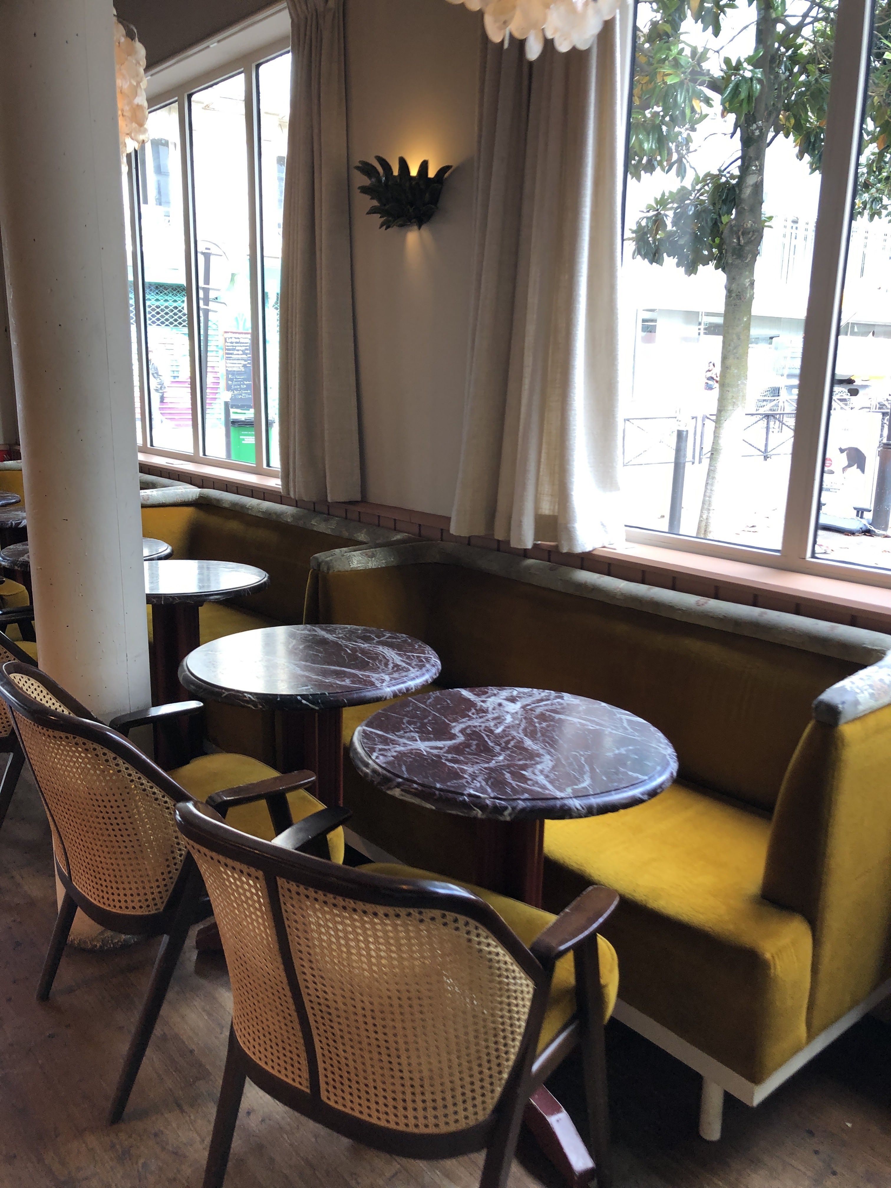 Très bon adresse pour le dej, les produits sont frais, les proportions généreuses, il y a des options végétariennes au menu. La deco est belle, façon vintage. Il y a deux salles étage et sous sol et une terrasse intérieure à l’abri de la circulation de la rue, très appréciable en été. Arriver tôt le midi pour être sûr d’avoir une table ou penser à réserver!
