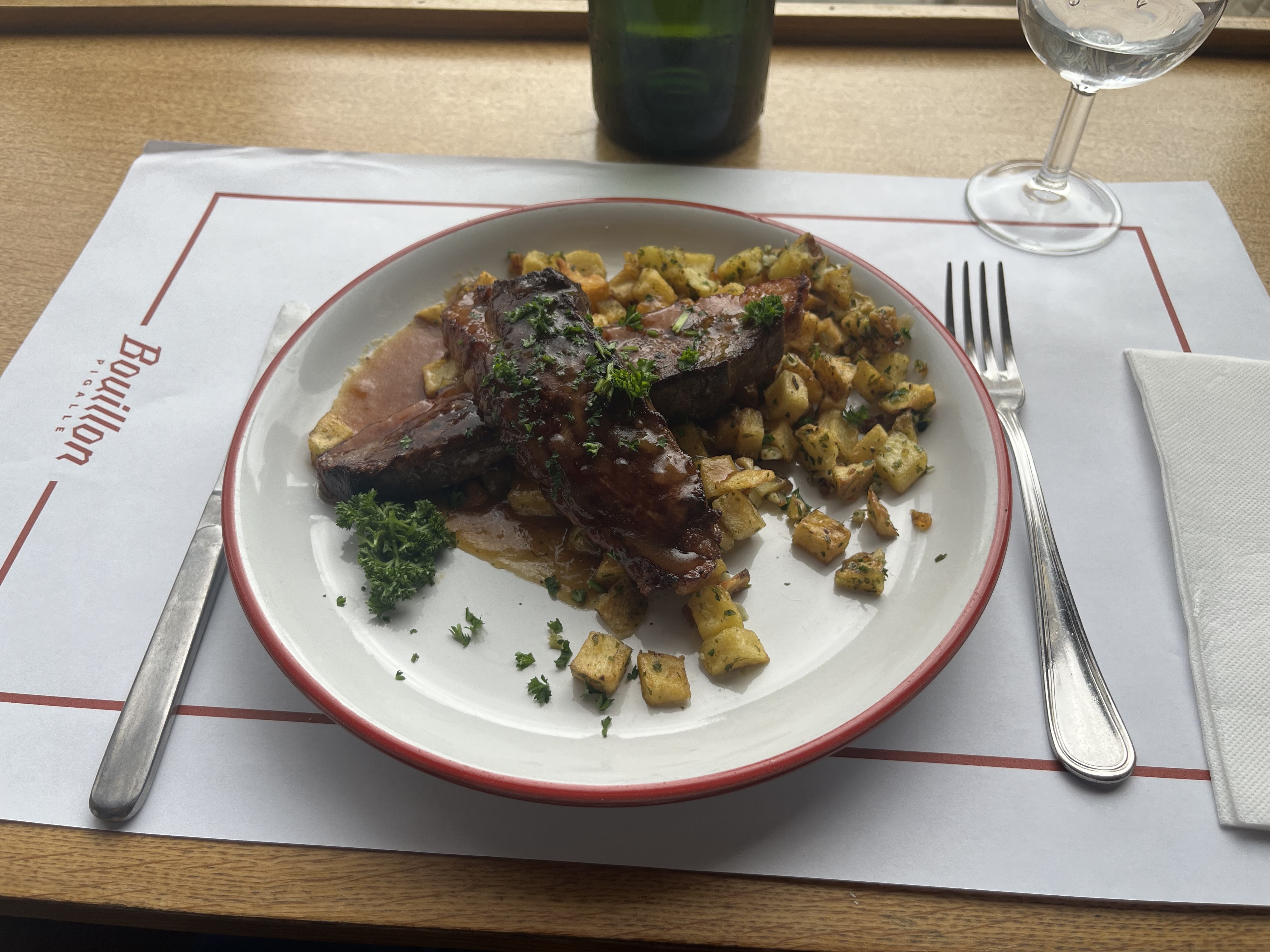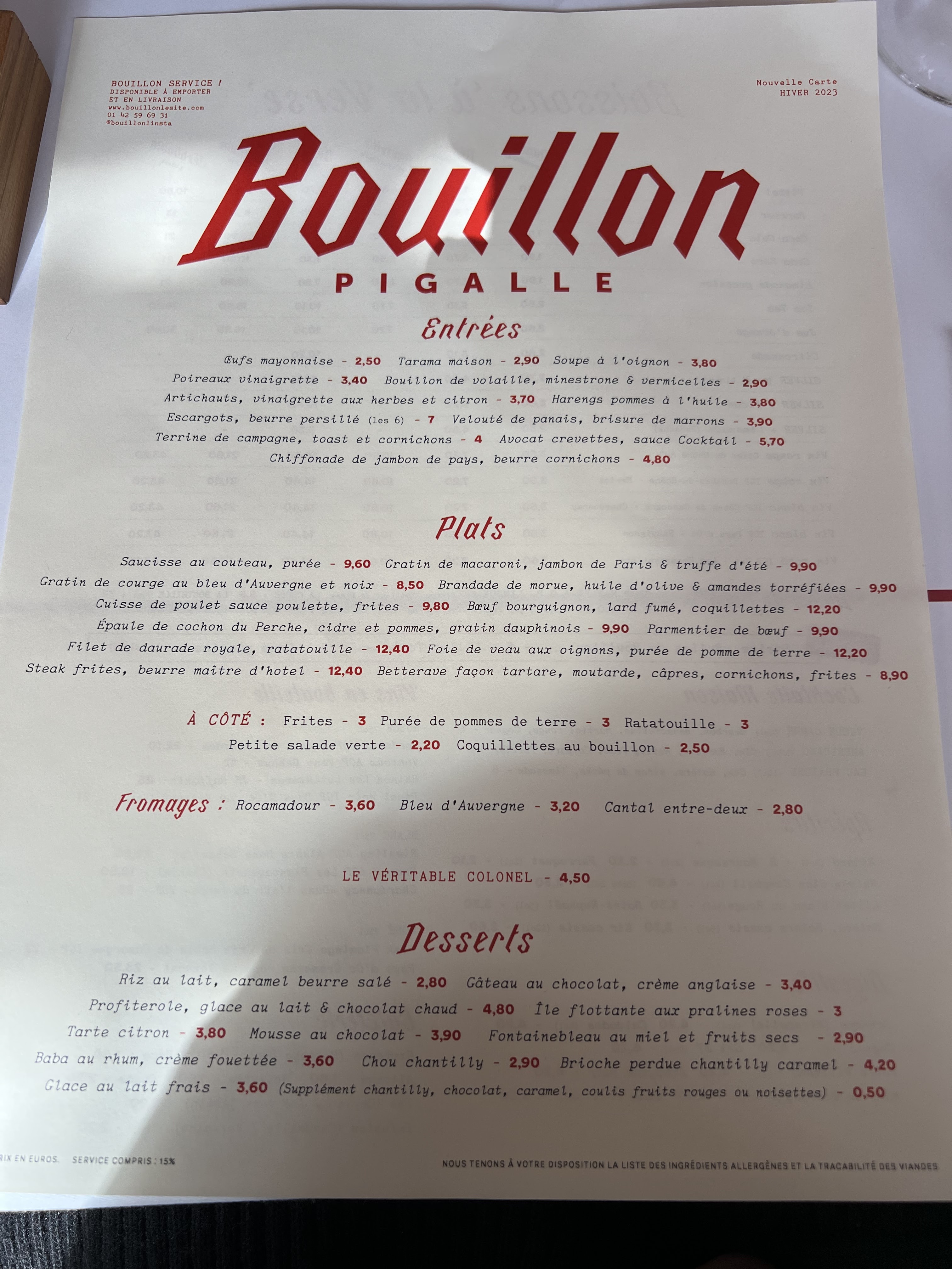 La cuisine d’un bouillon, l’ambiance d’un bouillon et les prix d’un bouillon ; le tout au cœur du quartier emblématique de Pigalle. Si le jeune homme qui nous a installé avez eu un tout petit peu de considération pour ne pas dire d’attention à notre égard, la note aurait été de 5 étoiles. Heureusement la jeune femme qui s’est occupée de notre table a gommé le sentiment d’indifférence laissé par son collègue.