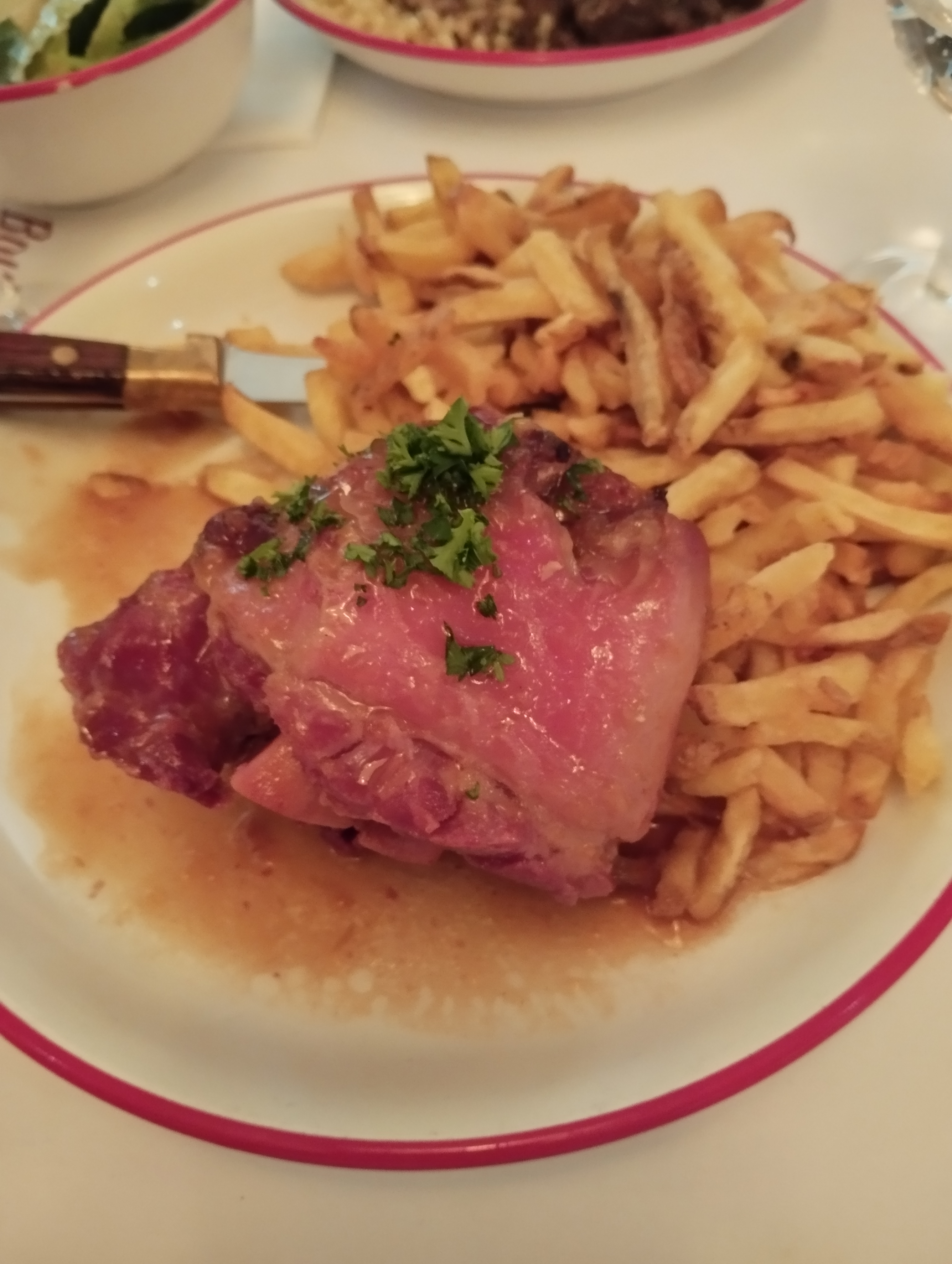 Réservation faite pour 18h30, rentré dans le restaurant pour 18h30! Comme pour tout les Bouillons, beaucoup de monde qui fait la queue mais les assiettes et le repas vaut le coup 🤤 L'os à moelle est toujours délicieux, la cuisse de poulet et ses frites le sont également 👌 Un peu déçu du Streussel à la pomme, pas trop croustillant mais la tarte au citron était excellente 🍋 Comme pour tout Bouillon, beaucoup de monde donc salle bruyante mais l'ambiance est agréable, familiale et vivante !