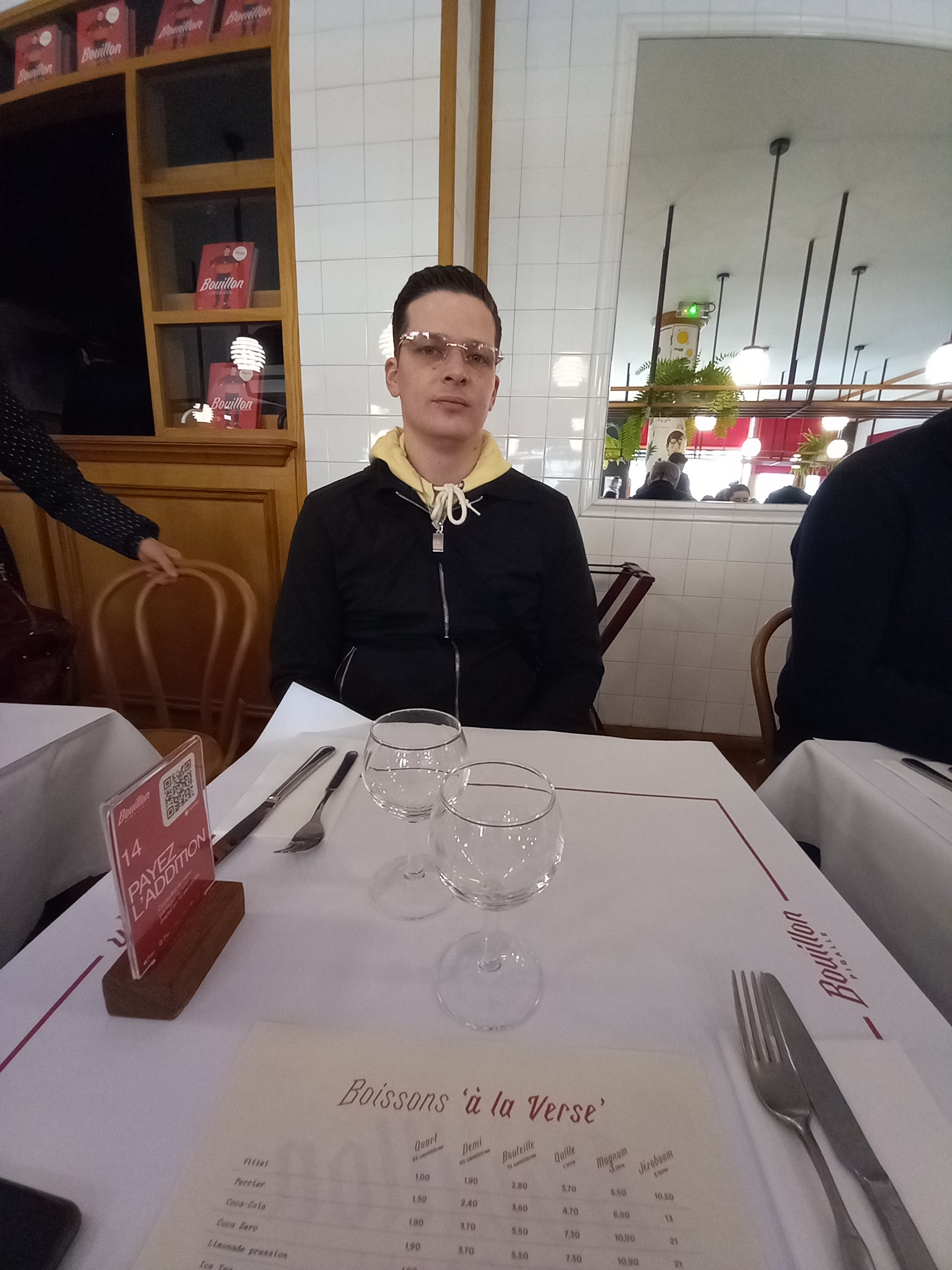 On avait réservé en ligne une table pour 2 personnes pour le 31 décembre,et on avait bien fait car une fois arrivé devant le bouillon il avait une longue file d'attente. Nous avec la réservation on est passé devant tout le monde. Puis la fille elle passe vite aussi mais c'est mieux de réserver en ligne,c'est rapide et facile et gratuit. Alors l'endroit il est très agréable, la décoration est sympa et l'ambiance était top! Pas trop bruyant malgré la salle pleine. Le menu est excellent, avec beaucoup de choix en entrée/plat ou dessert. Le prix est CORRECT et pas cher du tout! Les portions sont corrects aussi. On avait pris 3 entrée, 2 plats, 2 dessert et 1 ver de Kyr on a payé 43,10 euros l'addition. Franchement ça vaut le coup et surtout tu sors avec le ventre plein, c'est copieux. Le personnel est super agréable et à l'écoute. Bravo à toute l'équipe.Il assure un service rapide. Une fois installé à table même pas 5 min et on avait déjà les entrées. Je recommande vivement de faire ce bouillon, c'est une expérience magnifique et on va revenir pour un essayer un service du midi.