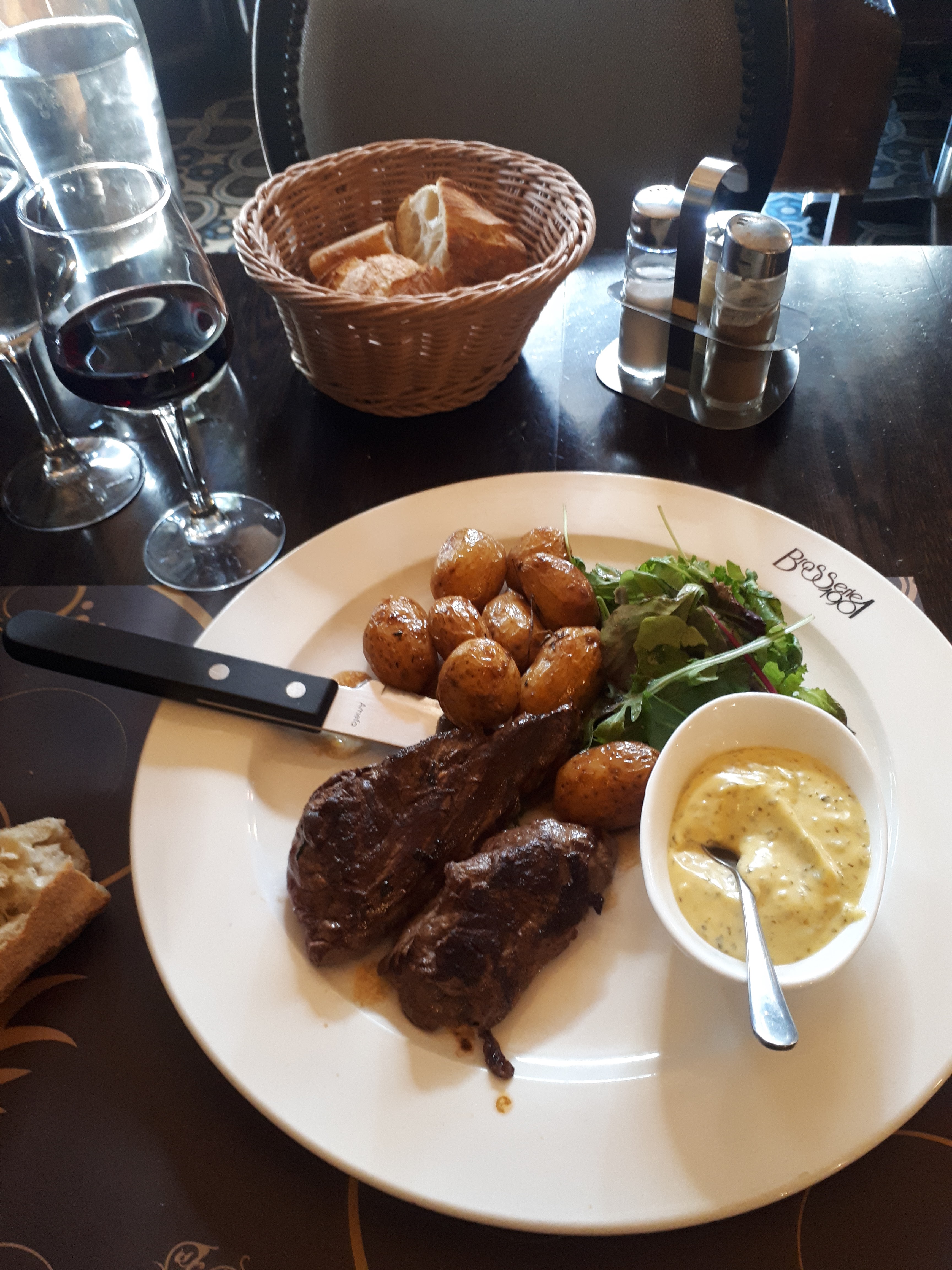 Bonjour nous avons super bien mangé une bavette avec des frites et un baba au rhums, salle pleine nous avons pas attendu longtemps avant d’être servi, serveur très sympathique, seul bémol un peu radin sur la quantité des frites.