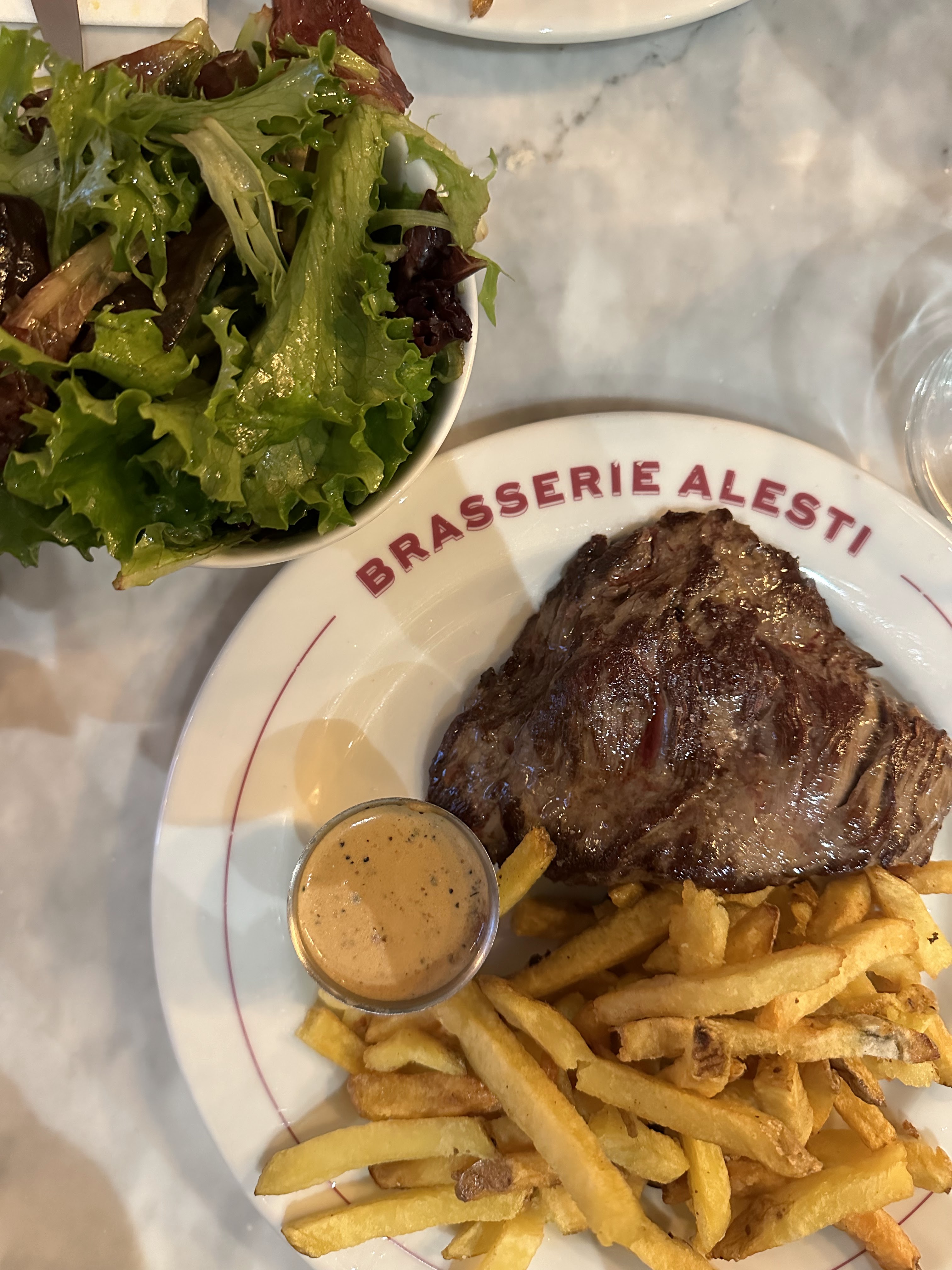 Un bilan assez décevant sur la brasserie Alesti, des classiques des menus de brasseries sont proposés mais pas maitrisés. En entrée, nous avions notamment commandé les escargots, qui ressemble à ceux qu'on trouve au rayon surgelé des magasins, les œufs mimosa sont correctes. Nous avons continué le repas en partageant une épaule d'agneau et une cote de bœuf. Si nous avons rien à redire sur l'épaule d'agneau la cote de bœuf par contre a été un vrai échec, commandé saignante, elle nous a été servi une première fois trop cuite. Nous l'avons renvoyé en cuisine et elle nous est revenu cette fois avec des tranches qui ont été passées à la plancha car la cuisson avait été trop bleu..... Pour accompagner ces deux pièces nous avons pris un assortiment d'accompagnement : les frites étaient pas bonnes (je me demande même s'il ne s'agissait pas de frites surgelés. Peut être avait-il épuisé le stock de frites fraiches ?!), la purée était moyenne et les haricots était ok. Pour finir le repas, nous avons testé le riz au lait, une version pralinée est proposée, qui n'a pas grand intérêt car on retrouve pas le coté réconfortant du riz au lait qu'on aime dans la version classique