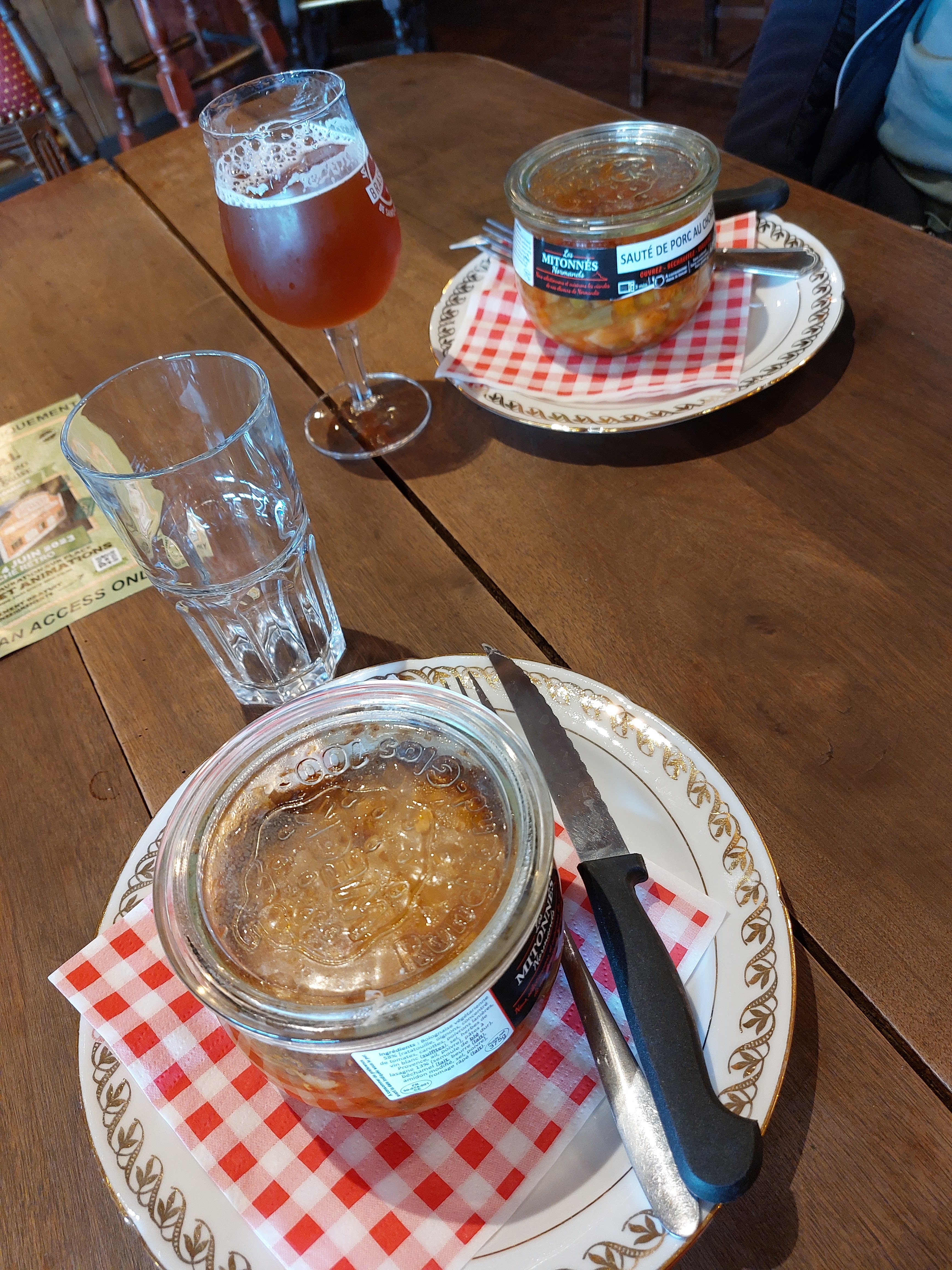 Cuisine locale en bocaux, servie dans de la vaisselle ancienne et dans un chouette décor ! Formule à 19.50 € plat, boisson et dessert. Nous avons pu également visiter la brasserie et repartir avec de la bière locale !
