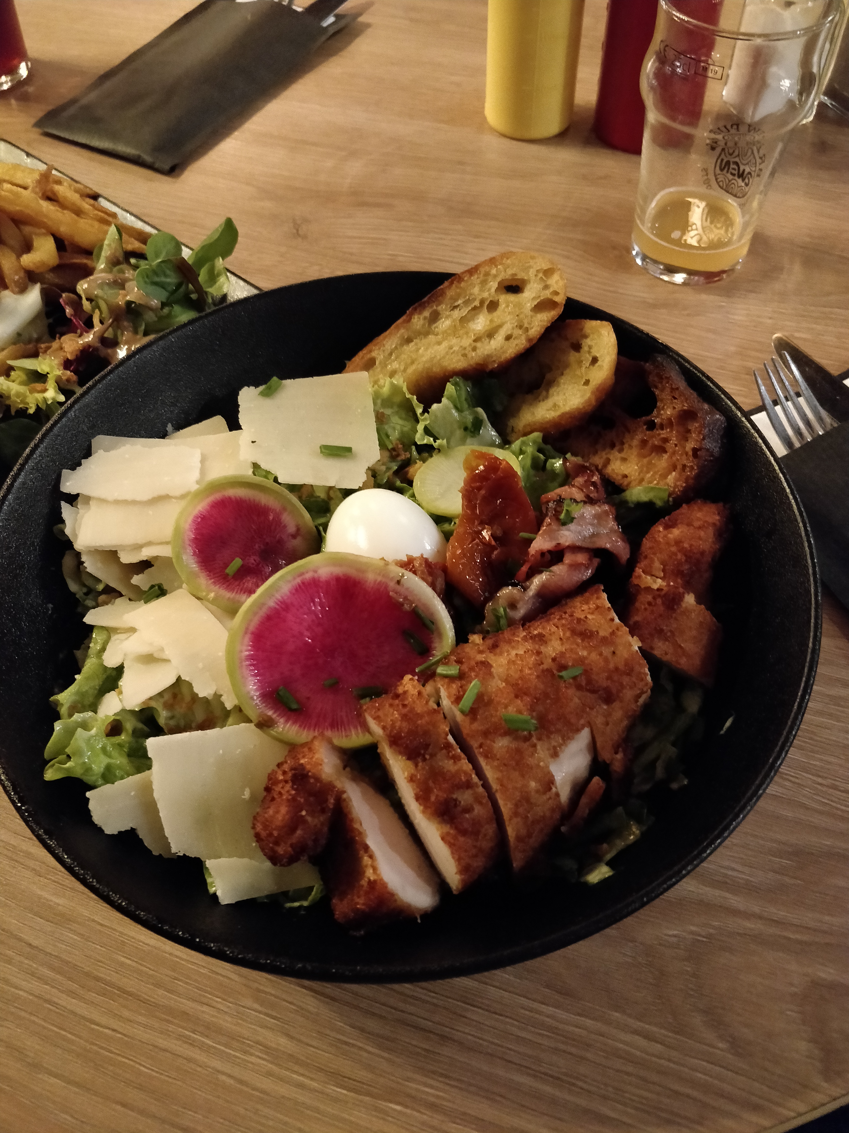 La serveuse pousse un peu à consommer 👀 le burger était correct, pas un régal, servi tiède, salade césar bonne, ambiance sympa. Ça dépanne bien.