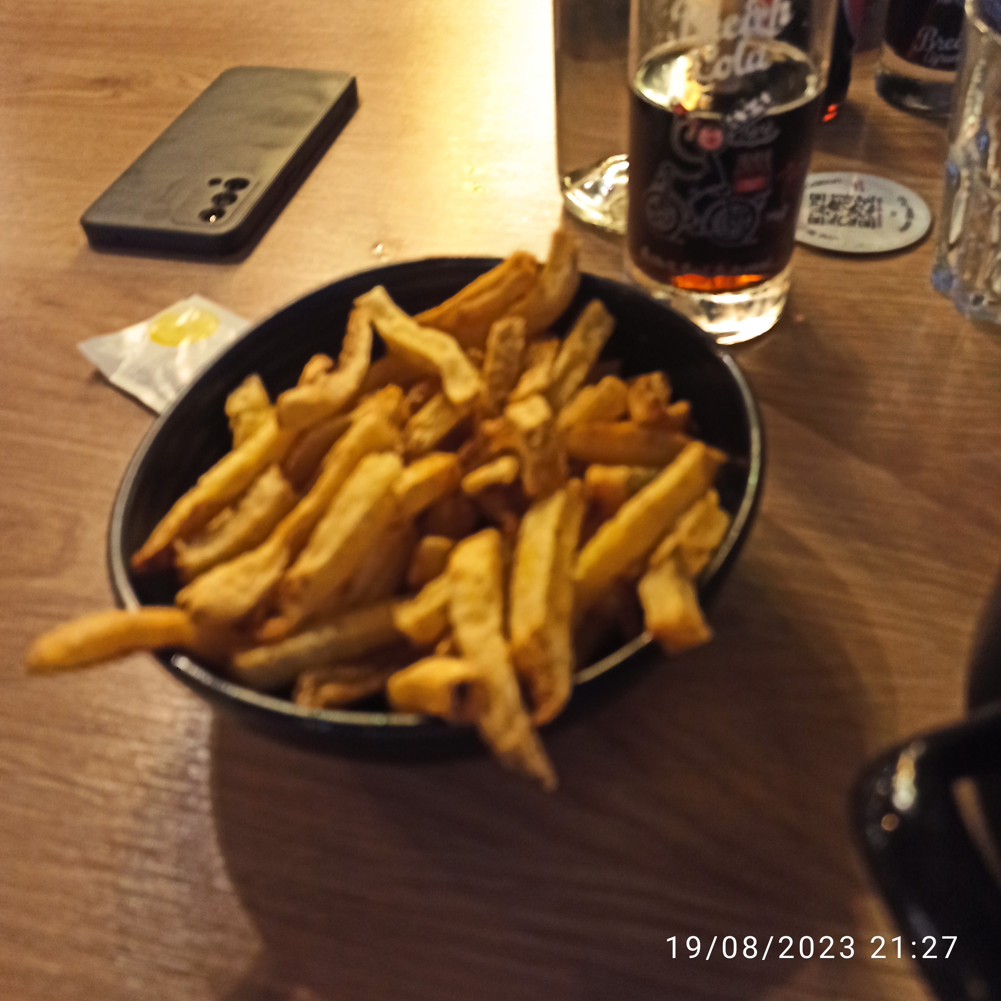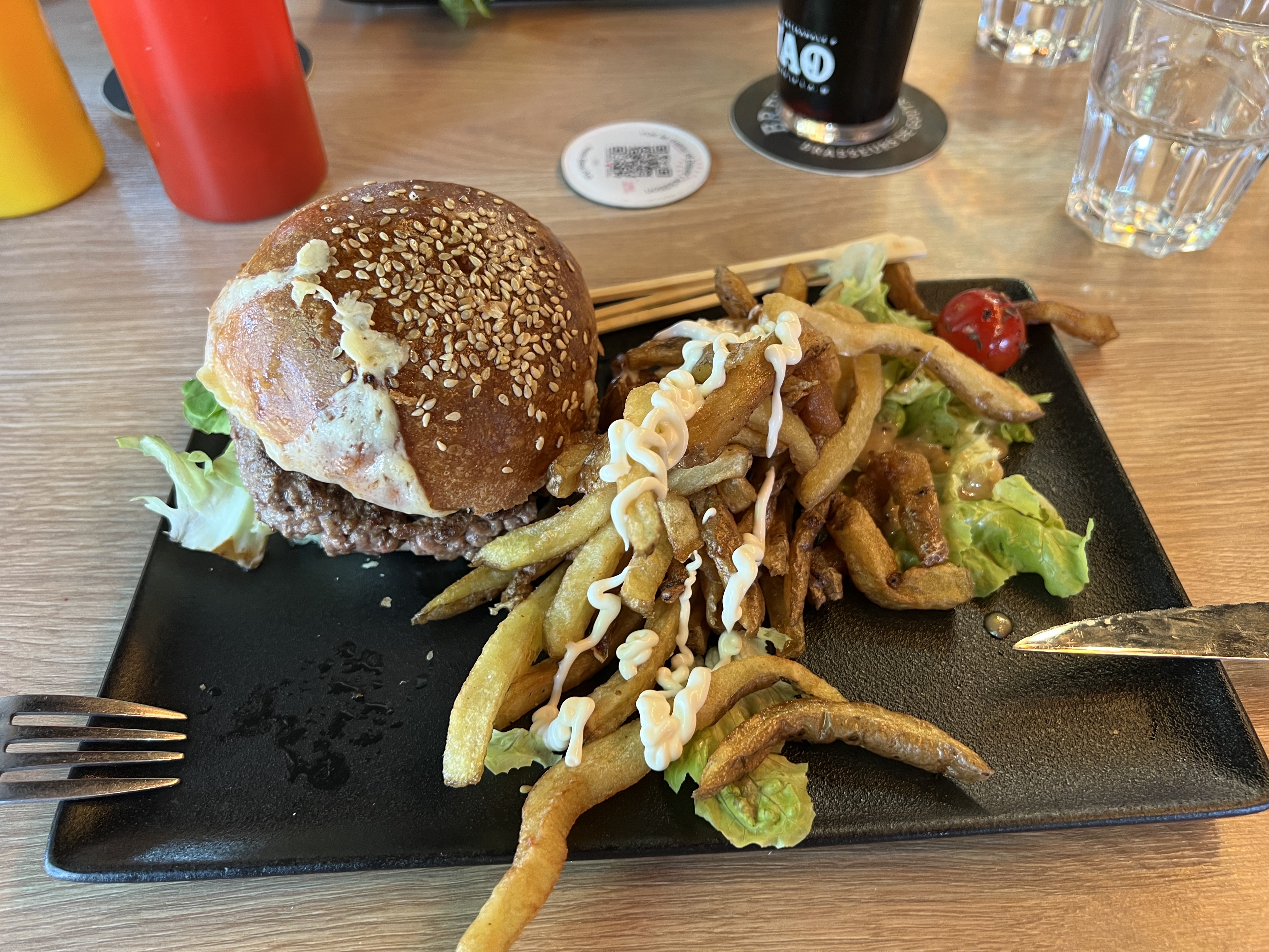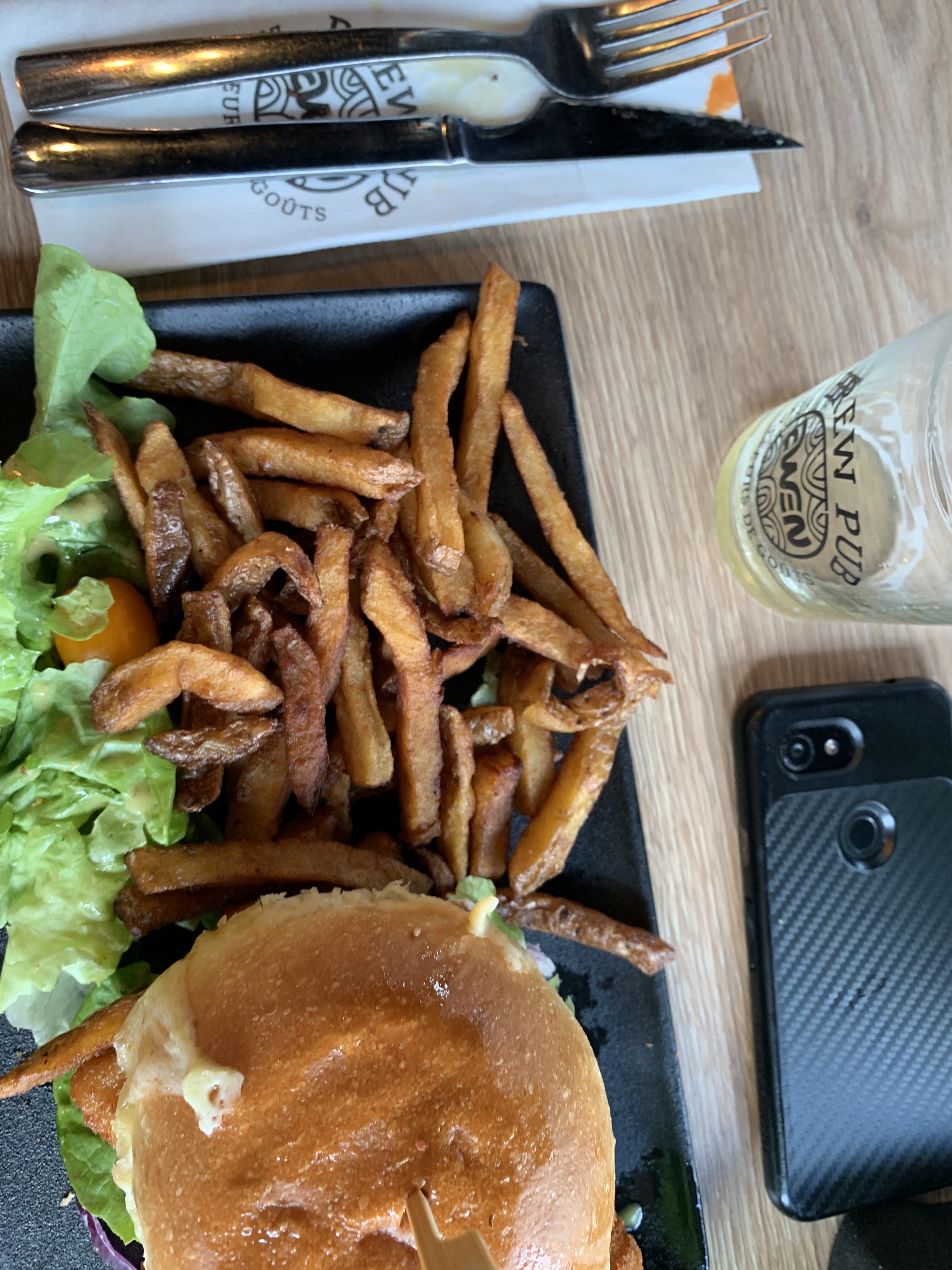 Frite et burger au top ! Le pain est top et la viande bien cuite suivant ma demande ! La planche de samplers de bières très agréable pendant le repas !