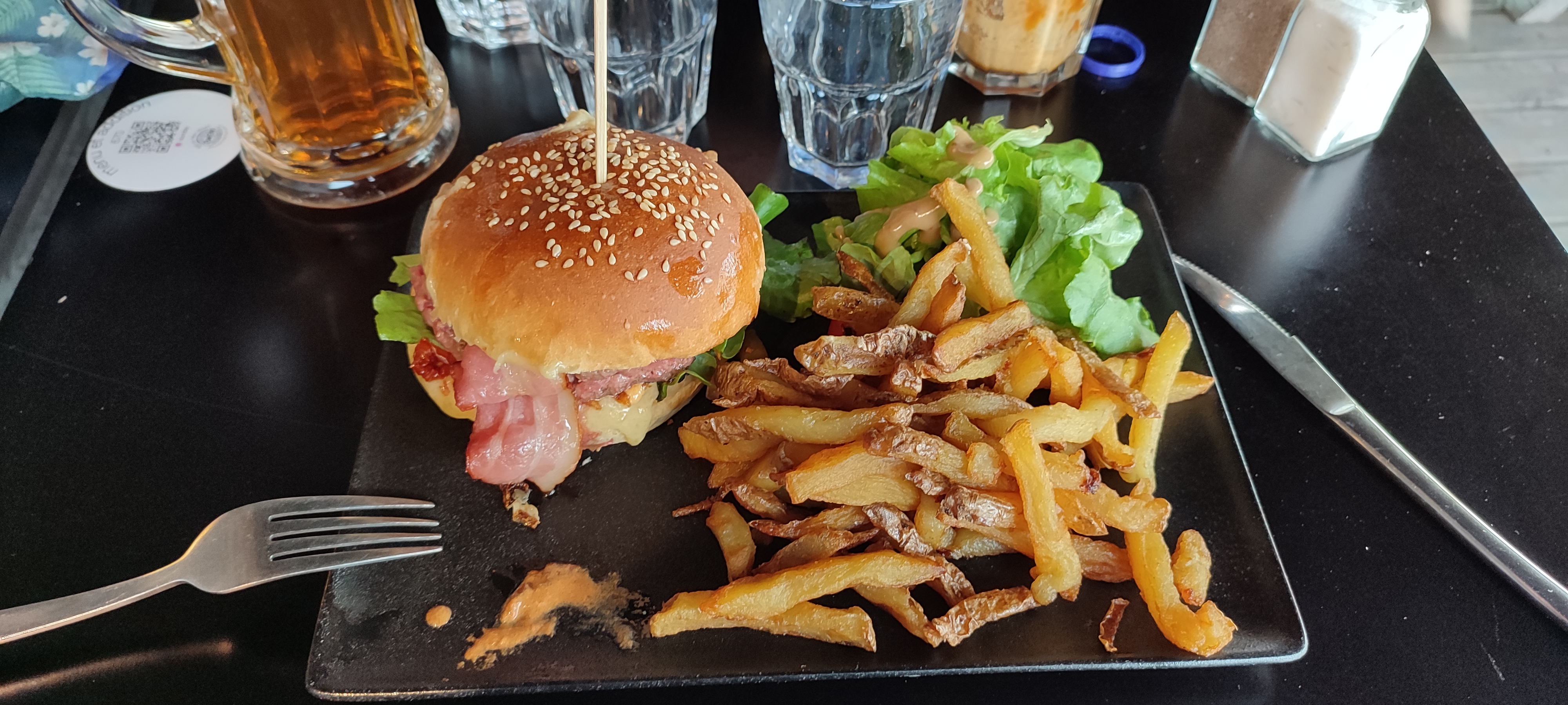 Déjeuner avant départ pour l'île d'arz, salade, hamburger ou moules copieuses et bien préparés. Nous avons passé un bon moment avec une équipe sympa malgré le stress et la tension des clients environnants un peu stressés par le départ en bateau qui suivait ....bref heureusement que les gens étaient sensés être détendus et en weekend prolongé 😅🤔😬