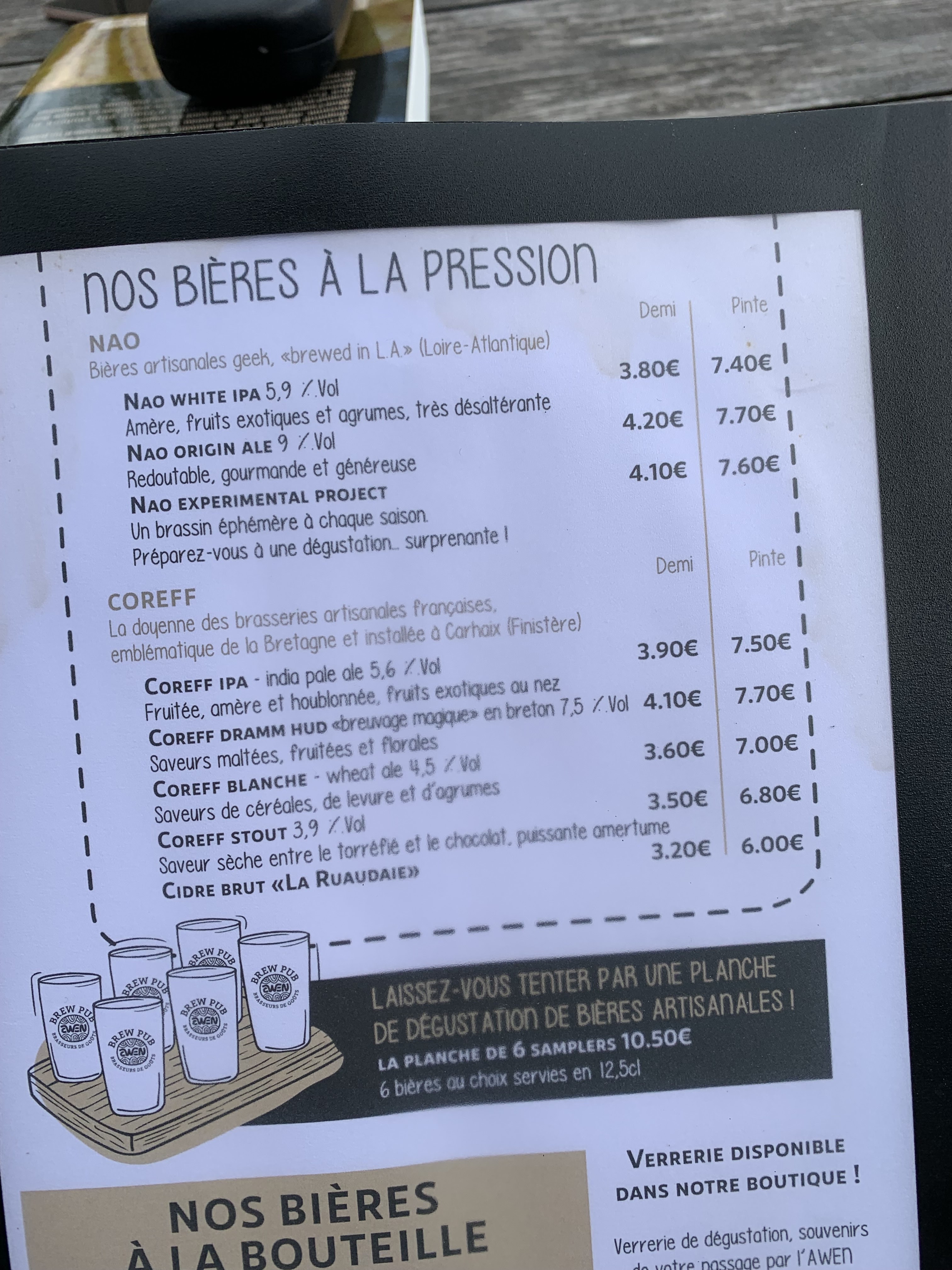 Après une belle balade le long du Golfe, et pour finir l'après midi, rien de mieux que de prendre une boisson désaltérante. Ça m'a emmené à Awen bar. Cadre sympathique, bonne ambiance et production sur place d'une bière. Vu sur l'atelier de production. Très sympathique et ambiance tendance. Le tout pour se détendre en même temps, sur une partie de fléchettes 501.