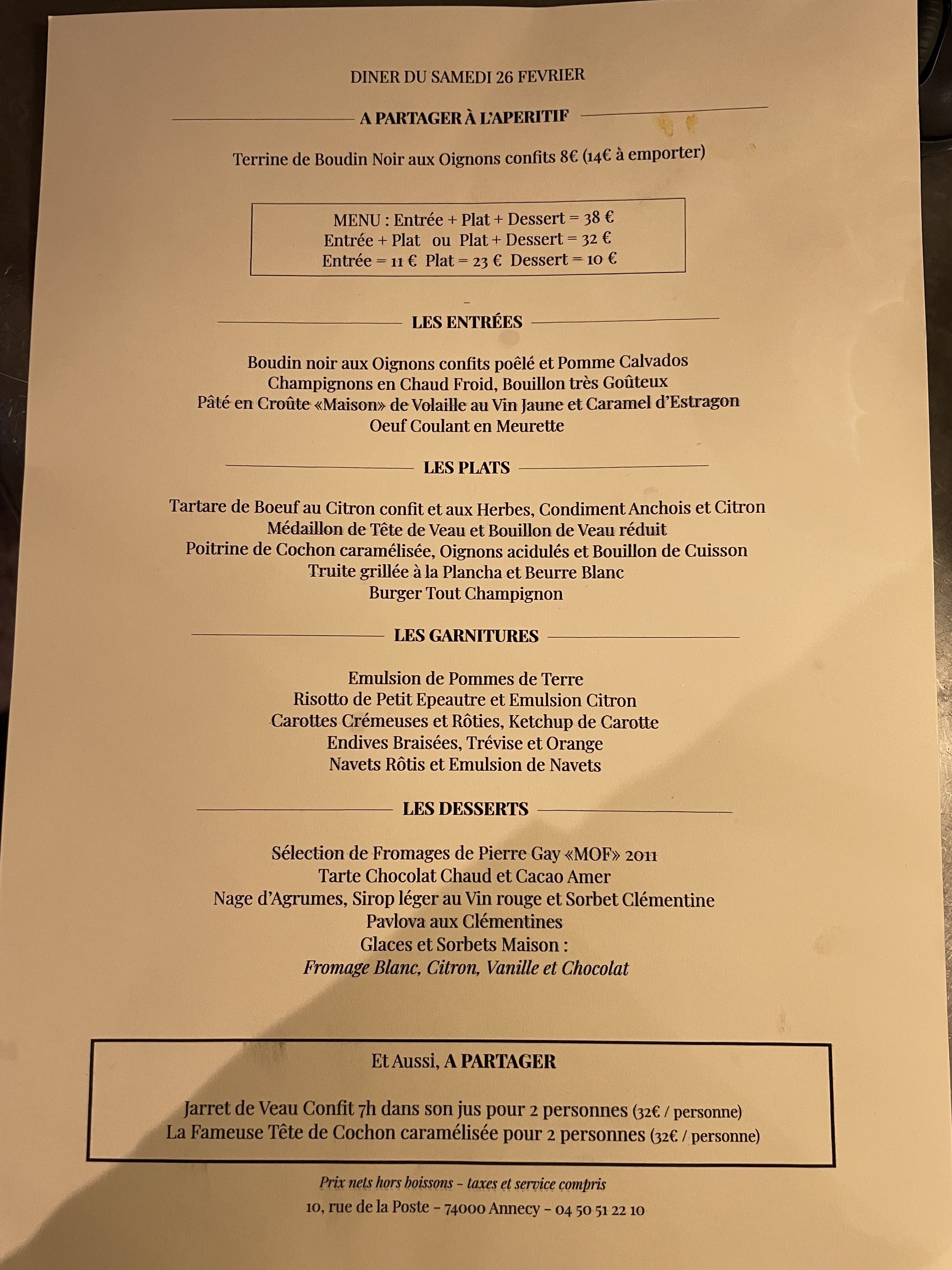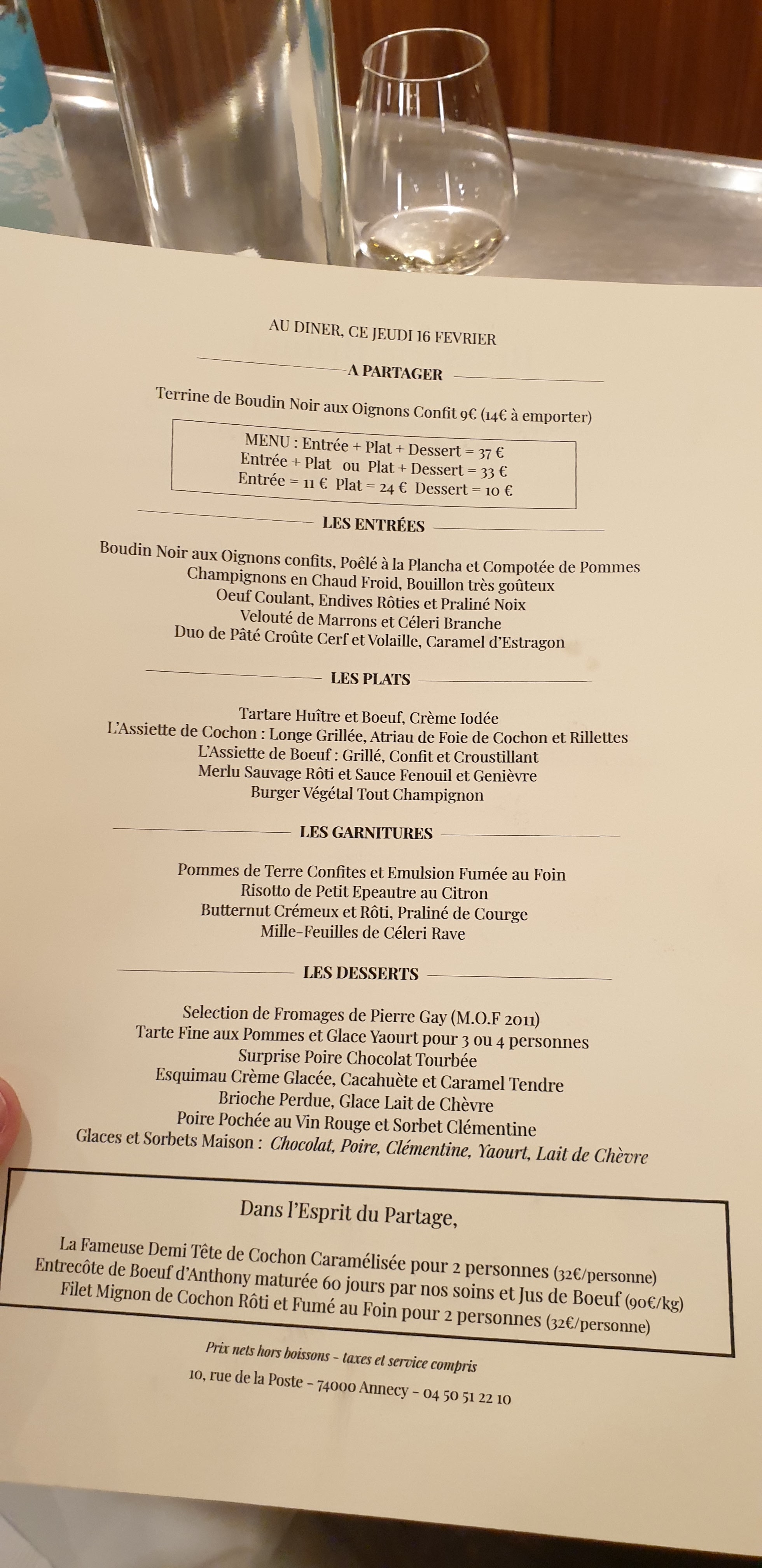 Un dîner en amoureux ce soir et quel bon choix !! Le cadre est très sympathique et le service juste et attentionné. Nous avons choisi de partager des rillettes pour l’apéritif maison (très bon!) et pris le veau en plat. Très très bon. Les fromages n’ont malheureusement pas été présentés par le serveur mais étaient goûteux. Le pain est top. On a passé un bon moment. Note a 140 euros avec apéritifs, rillettes, plats, desserts et vin. Nous reviendrons en cas de passage à nouveau sur Annecy