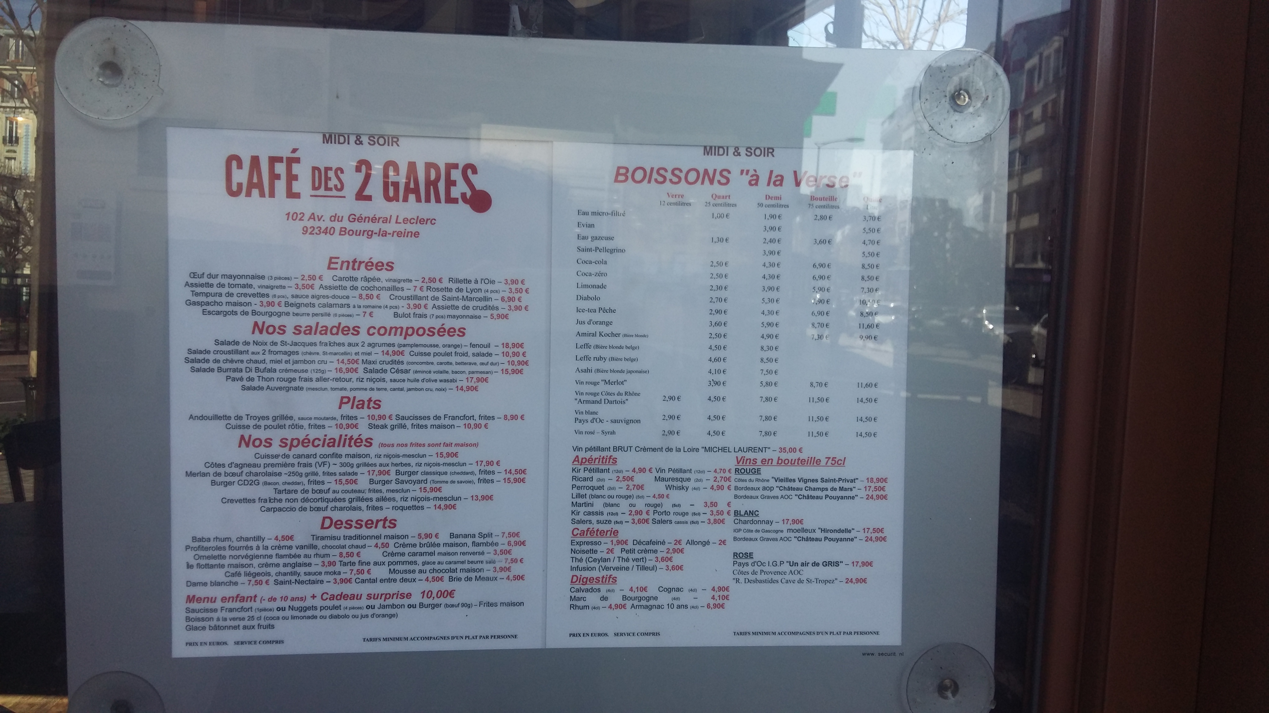 Le personnel est très sympa , l'ambiance est super , le plus ancien café brasserie de Bourg la reine tenu par la même famille c'est un lieu à thème Les 2 Gares font référence a celle actuelle du RER B ex PO et a la gare disparu du célèbre Arpajonnais tramway a vapeur et plus tard électrique reliant Paris à Arpajon
