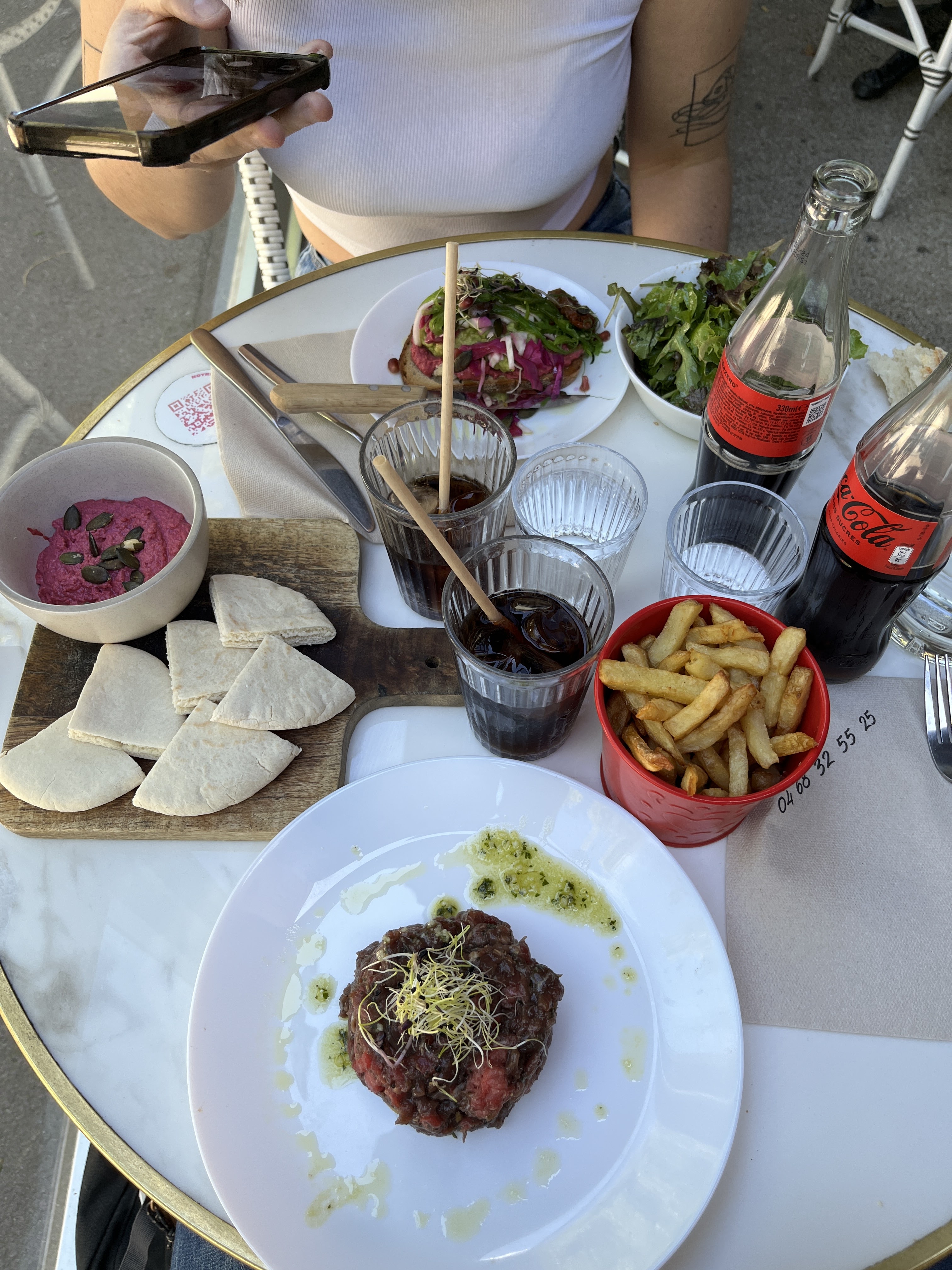 Cadre joli mais bruyant, jus de fruits excellents. Des produits achetés aux halles de Narbonnes situées à une centaine de mètres sont utilisés. Du Hamburger au filet de poisson tout en passant par les coquillettes au jambon tout était parfait hors mis le fish ans chips à éviter si vous n'êtes pas un amateur de poisson car ce n'est pas du poisson pané industriel. Moelleux au chocolat ( /!\ ils sont servis par deux mais sont excellents /!\) et camembert truffé parfait. Terrasse extérieure avec des panneaux vitrés sur les côtes avec comme d'habitude dans le coin un magnifique soleil. Service parfait. Pour information la surprise avec le fish and chips c'est une feuille d'épinards et le camembert légèrement truffé est en réalité bien truffé.