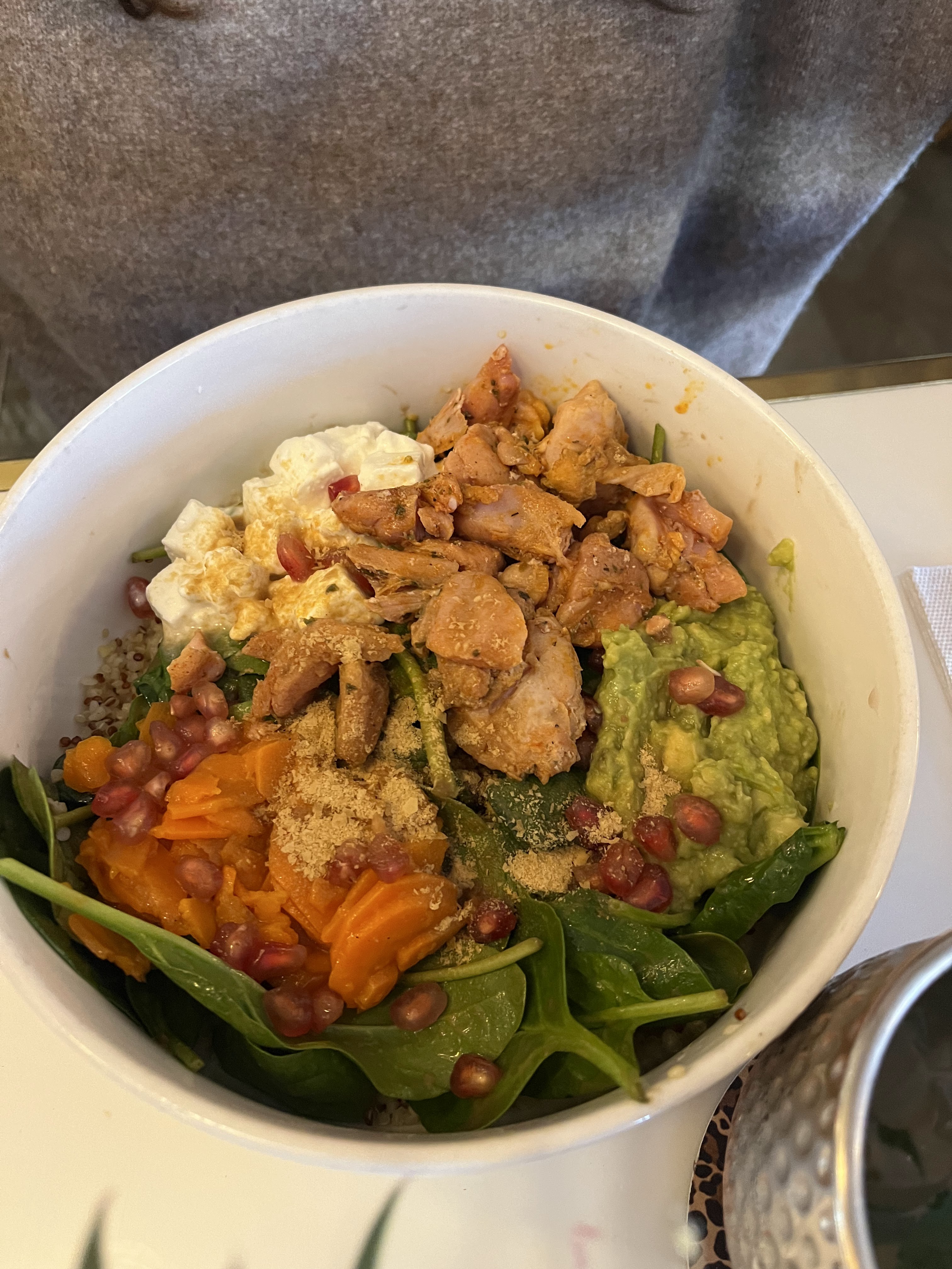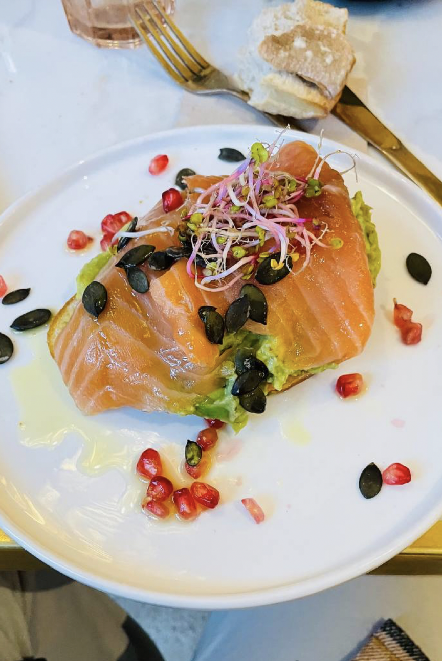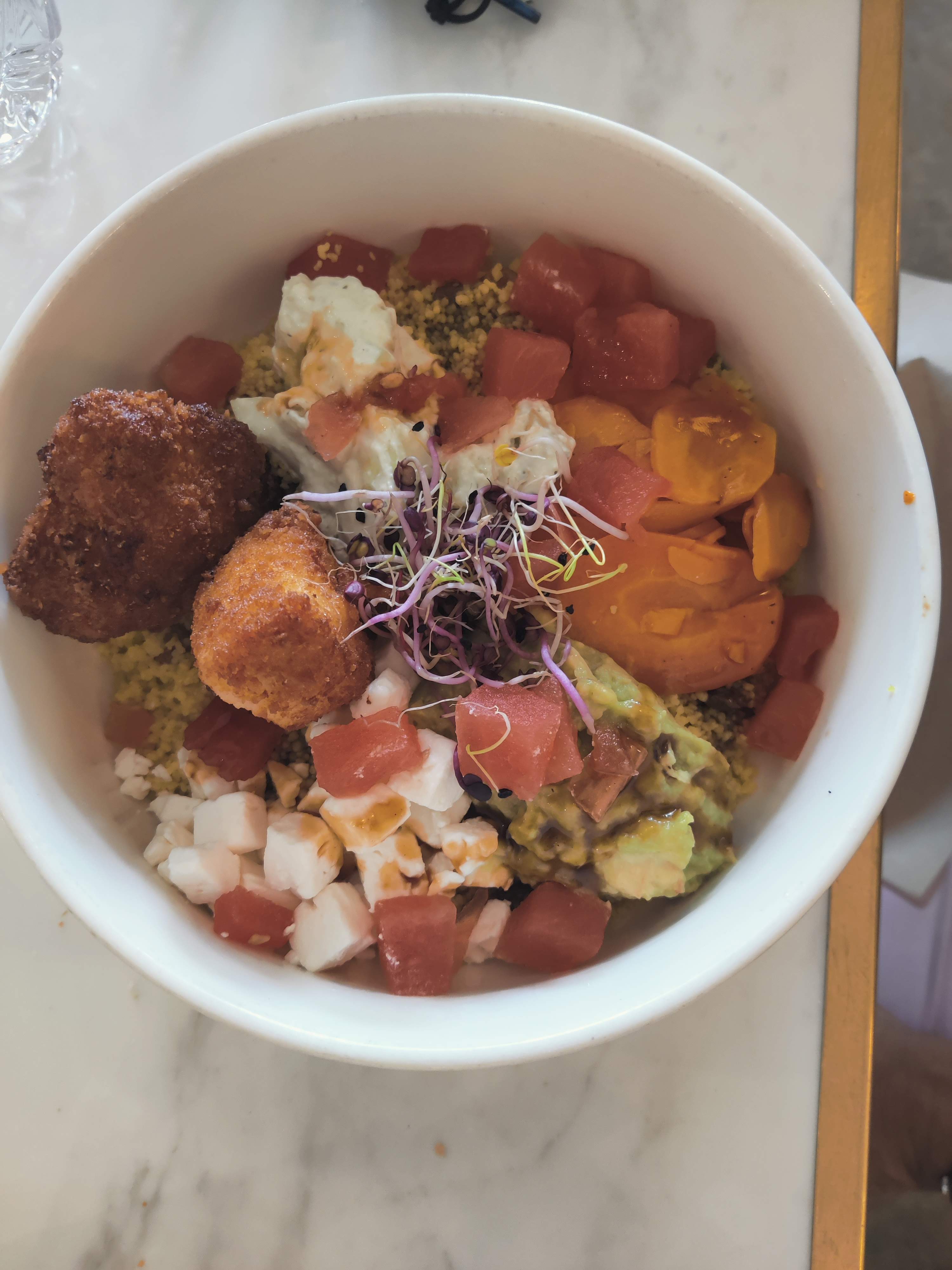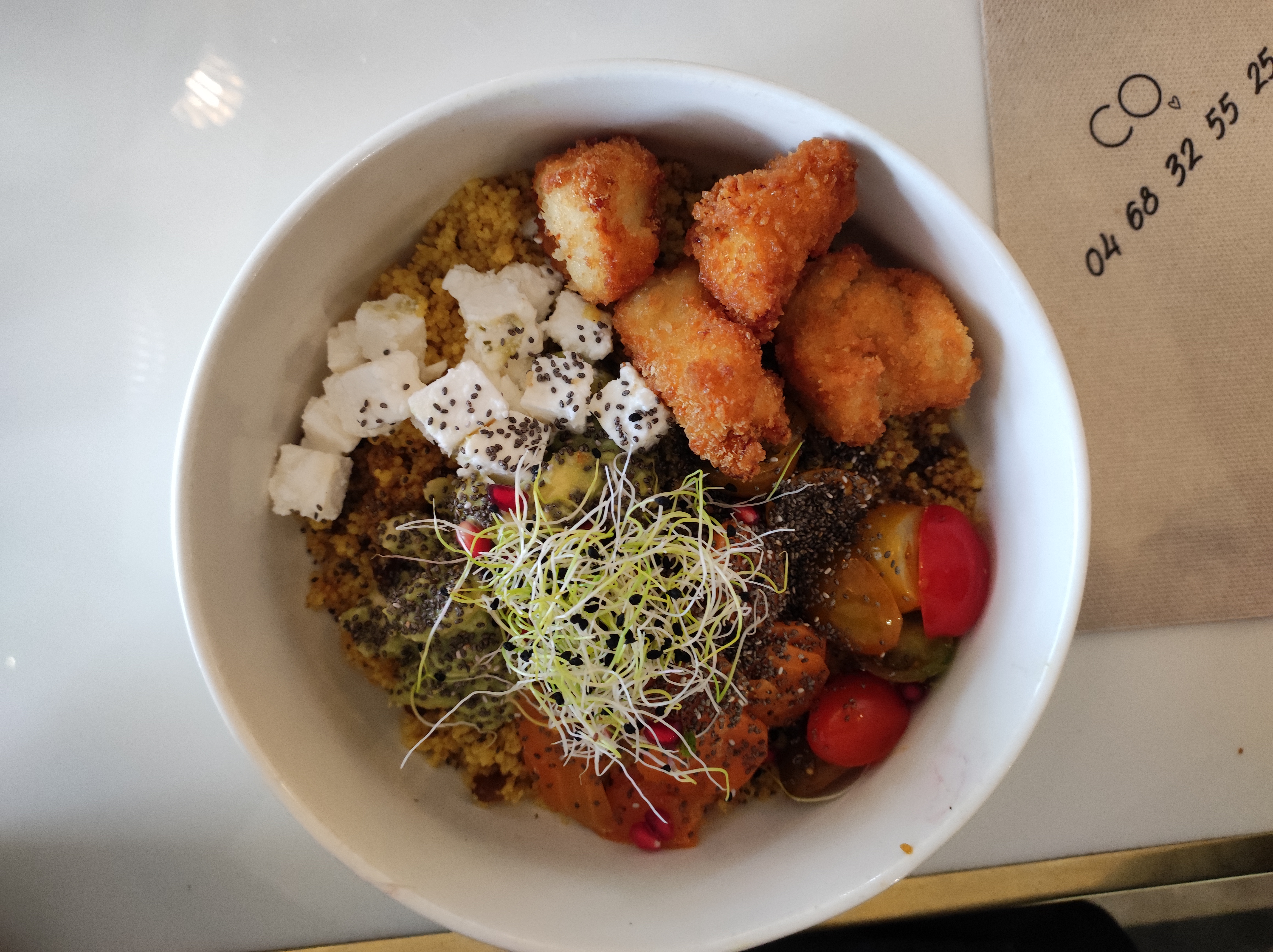 Très bon, original, serveuses agréables. Je recommande ! (En photo, tartine avocat-feta, veggie bowl, eau aromatisée hibiscus)