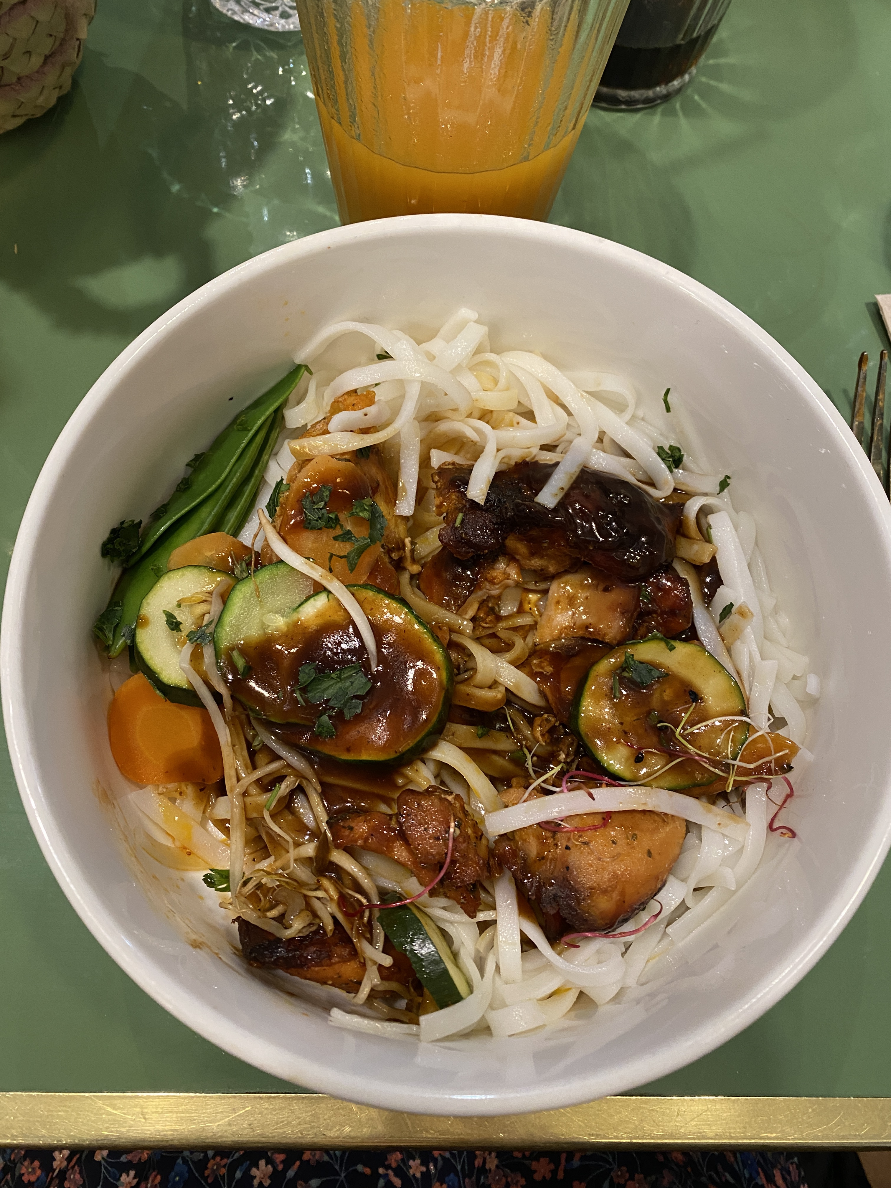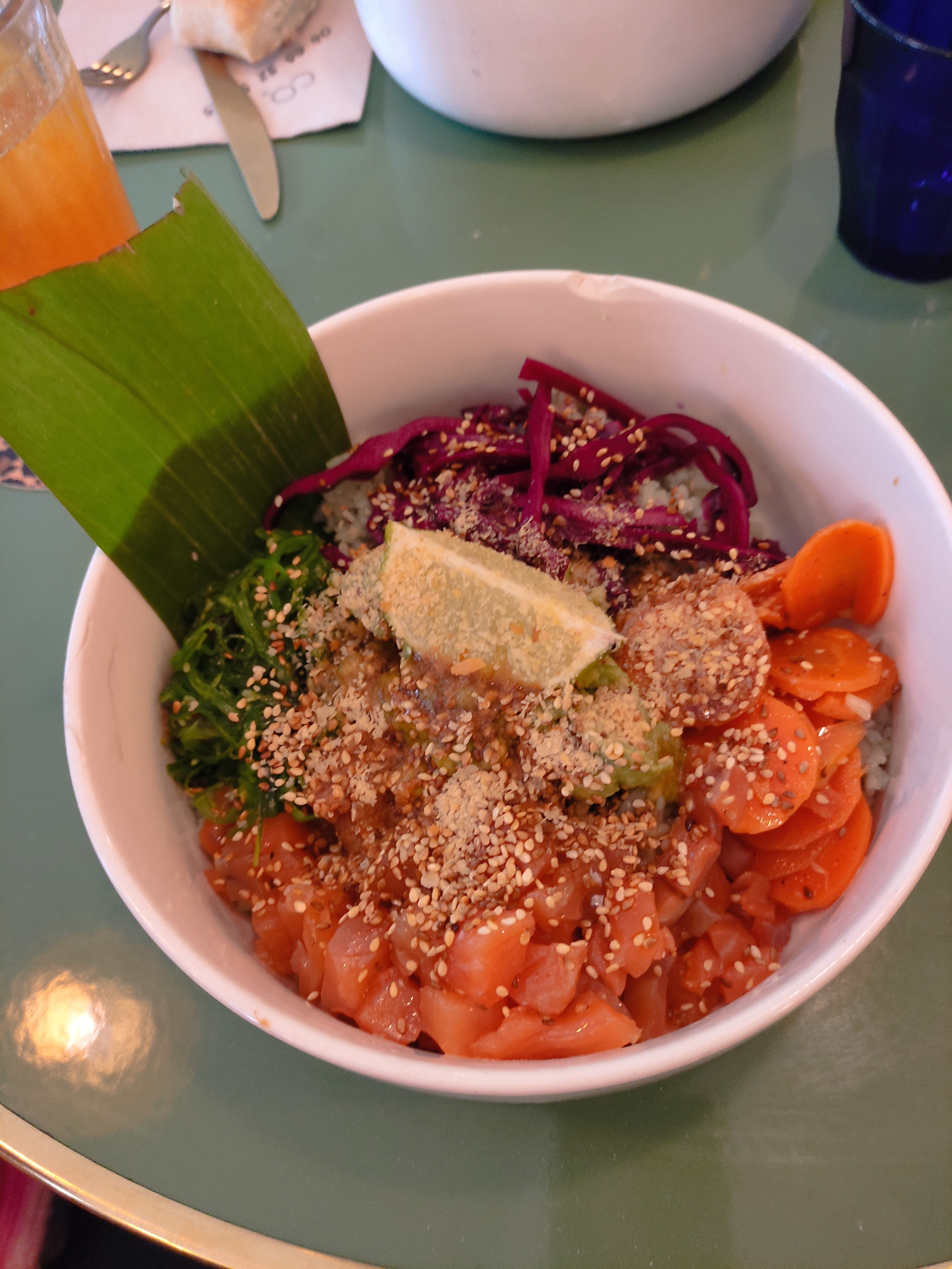 Service du déjeuner un dimanche. Bon accueil, une superbe déco à l'intérieur. Salle très bruyante et la porte d'entrée qui claque toutes les 2 mn devient insupportable. La carte propose beaucoup de choix. Le tuna poke bowls est très bon, le chiken bowls a beaucoup de saveur, dommage que le poulet soit sec car trop cuit. Quant aux desserts, nous avons été déçus. Pancake sec et pâtisserie non maison trop sucré. Je déconseille de passer aux toilettes.... très sale, poignée cassée. C'est dommage car l'endroit est vraiment sympa.