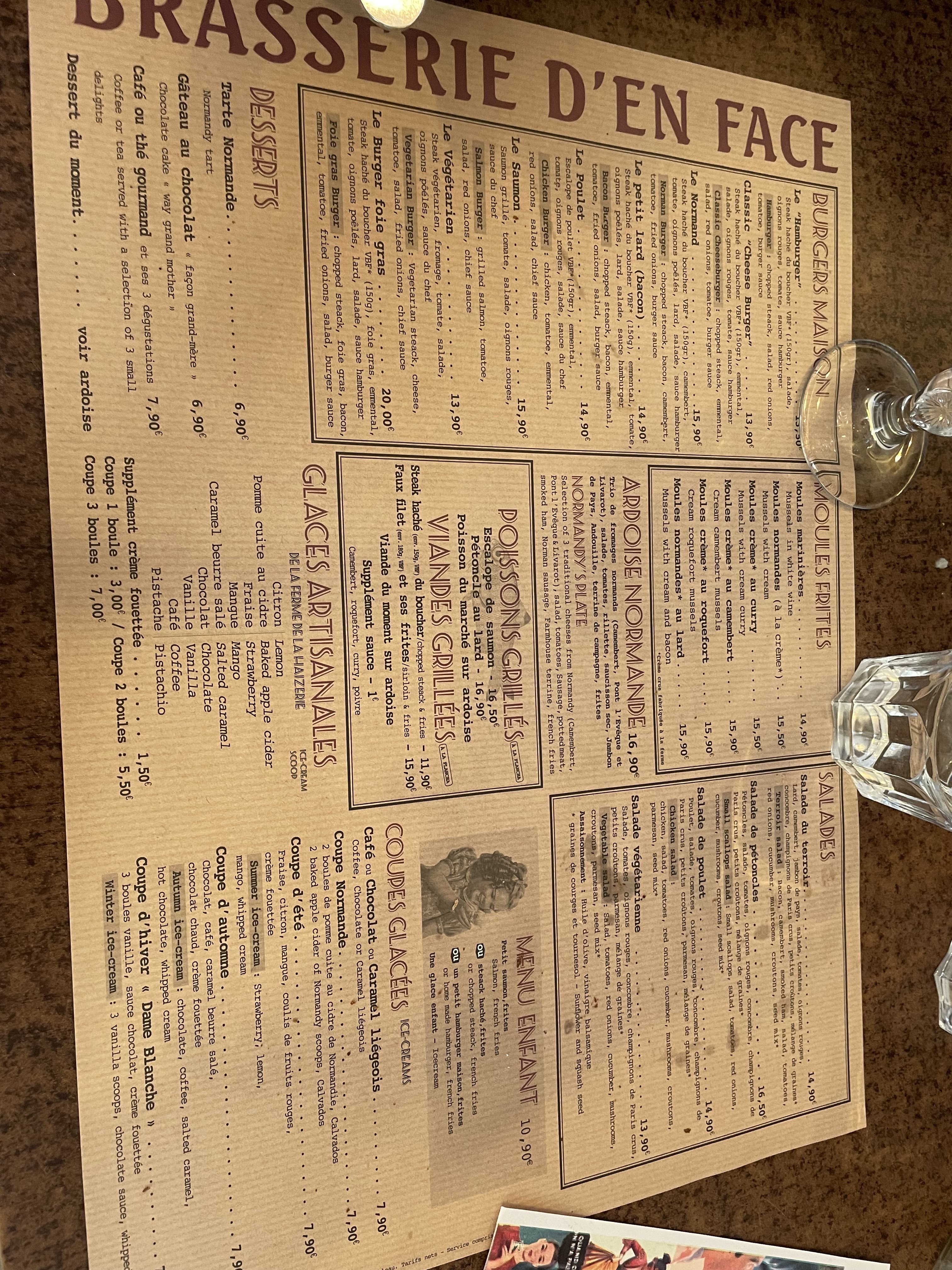 Nous avons passé un agréable moment à la Brasserie d'en face. L'accueil fut excellent et le personnel a fait en sorte que je sois installé au mieux avec mon fauteuil roulant électrique. Le Burger Normand était excellent. Nous reviendrons !