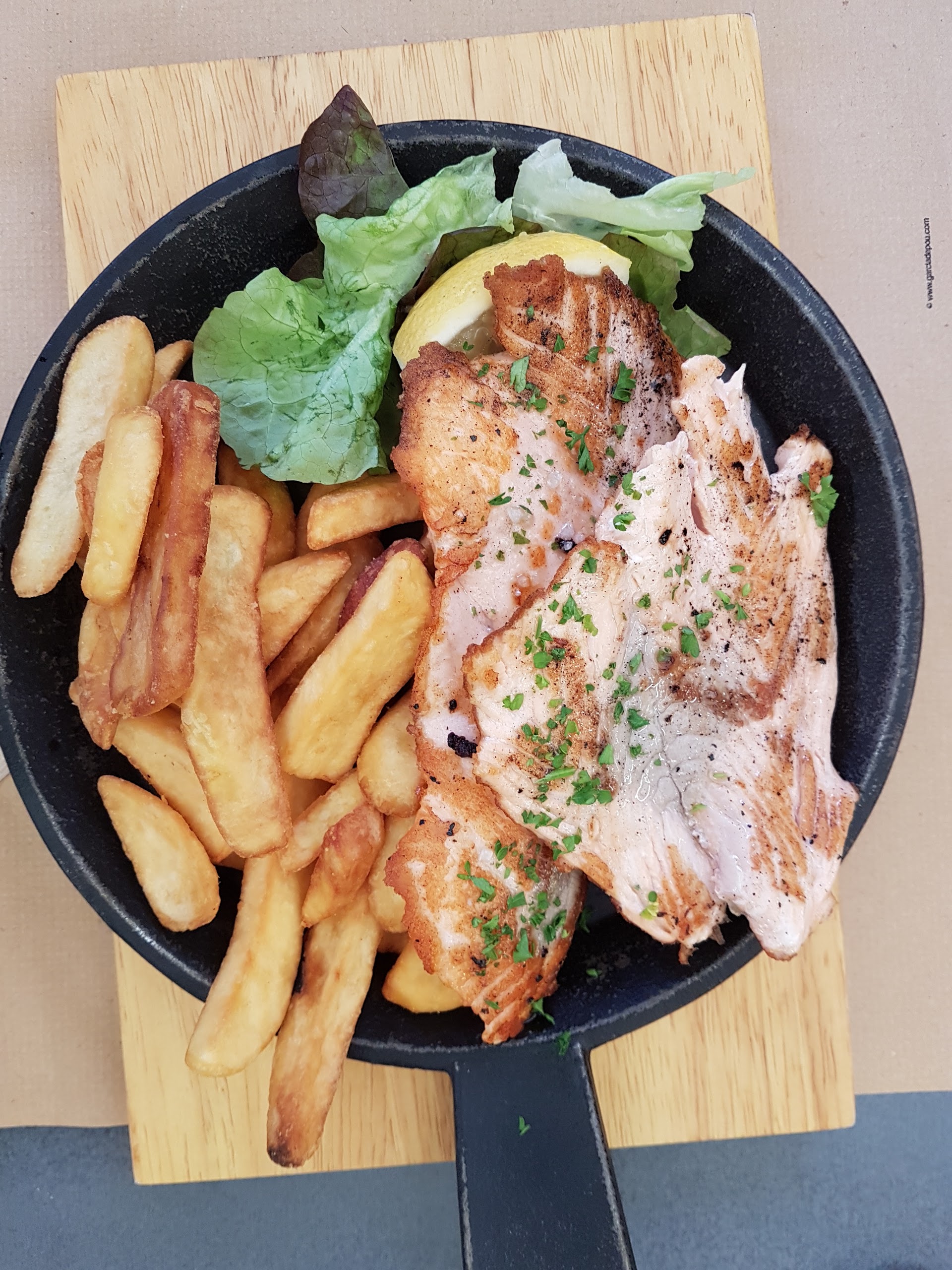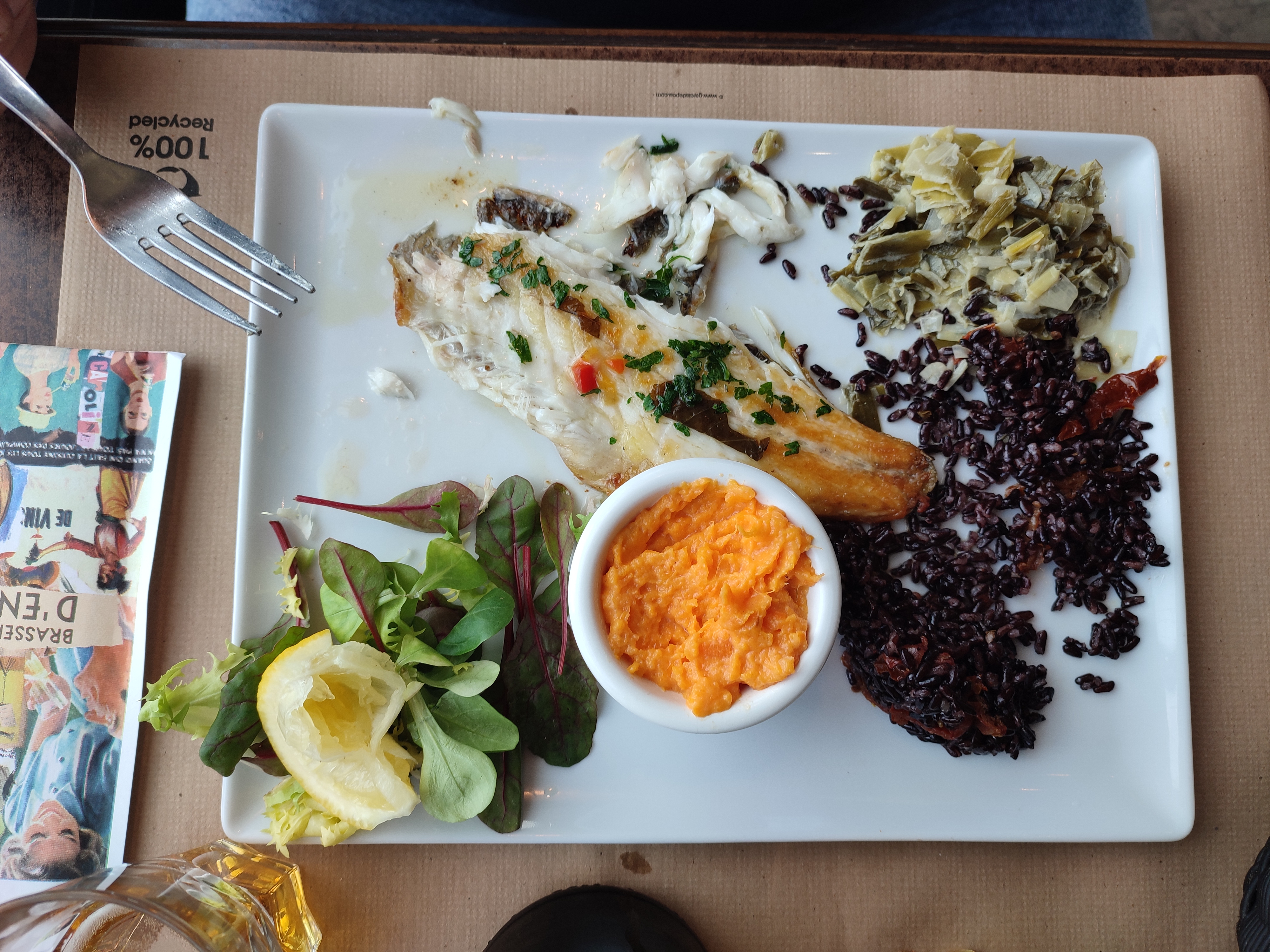 Ensemble assez satisfaisant. Nous regrettons le poisson du marché qui n'a que le nom de marché car il s agit d'un filet de bar surgelé. L'accompagnement du bar est un peu juste en termes de quantité. Service agréable.
