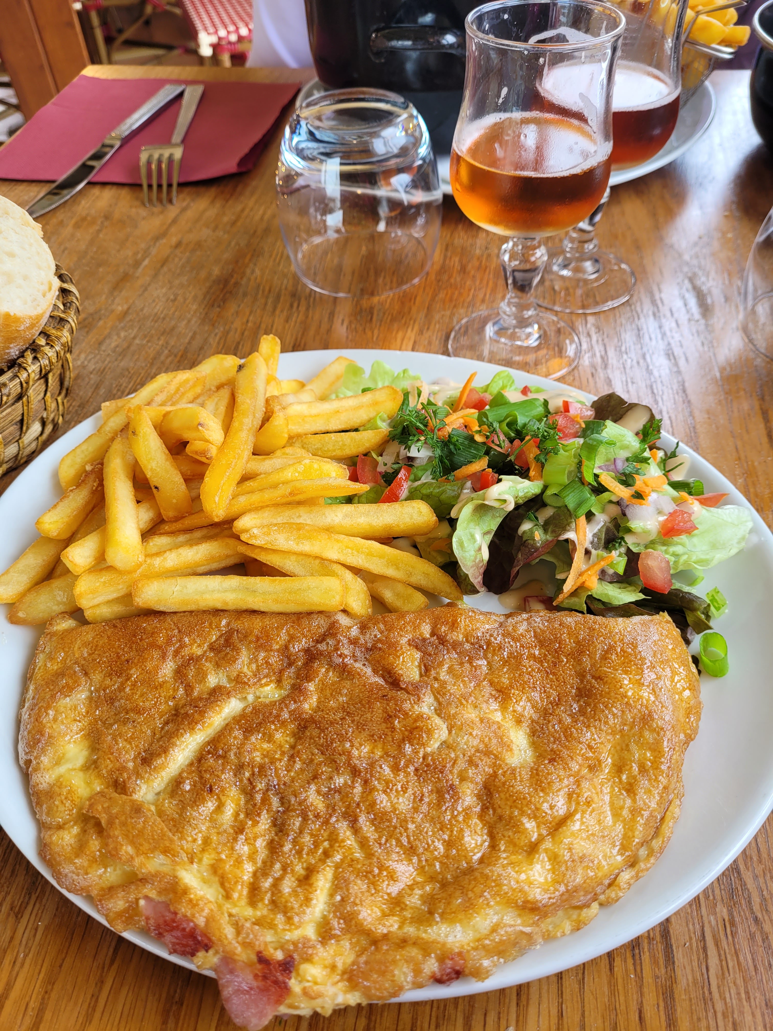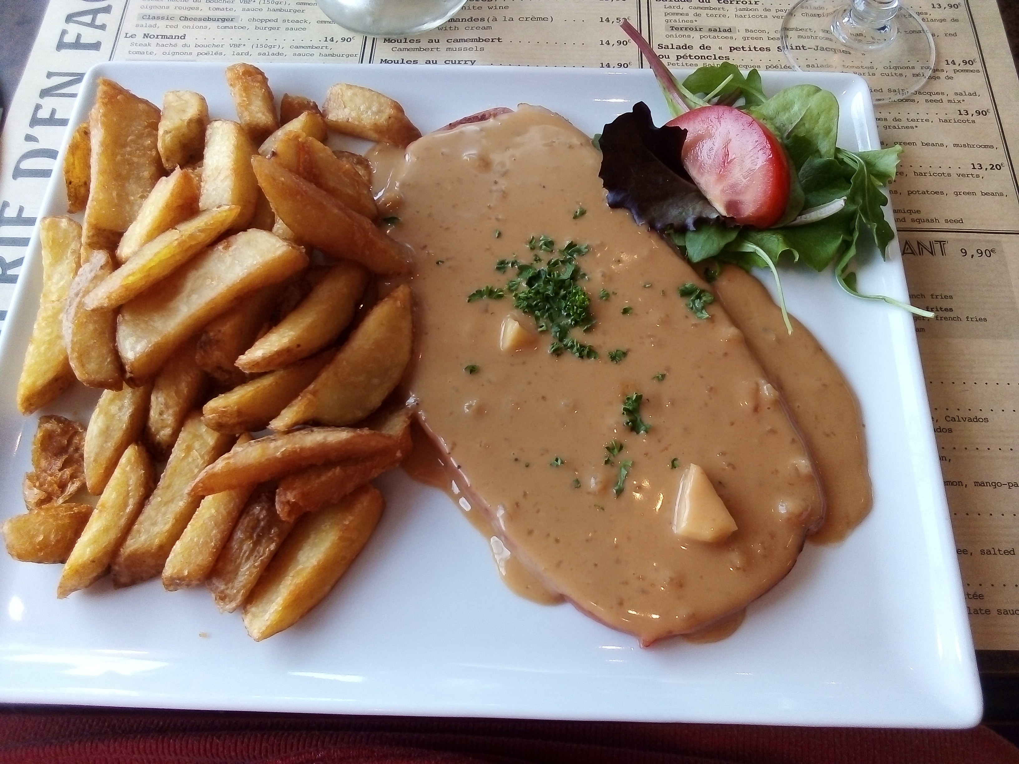 Repas très agréable; le plat du jour, un jambon sauce cidre,était un régal. Les moules frites au camembert étaient très bonnes et les parts généreuses. On remarque aussi de gros efforts fournis pour respecter les nouvelles instructions liées au covid-19. Very enjoyable meal; the dish of the day, a grilled ham with its cider sauce, was delicious. Their camembert mussels were also very good and the serving sizes were generous. We also noticed they went to great lengths to respect the new coronavirus related safety rules.