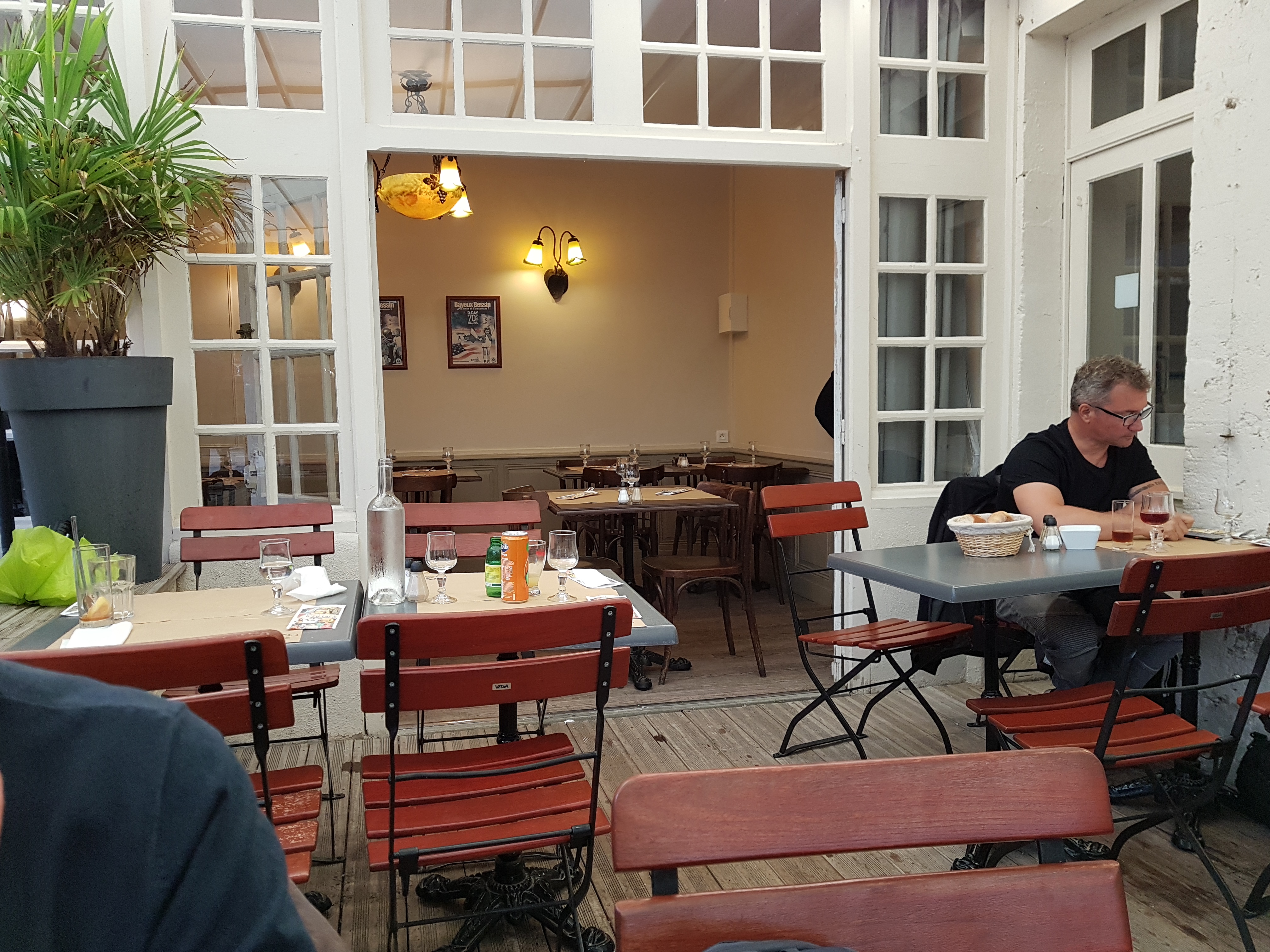 Agréable... bien que l'établissement ne soit pas l'un des plus spacieux en apparence dans la rue, il cache bien son jeu. De la place, une fois installé dans la salle du devant, suit une pièce contiguë et même une discrète terrasse très agréable aux beaux jours 😎 Nous avons profité de la halte en ballade moto et l'accueil fut sympathique, les consommations bonnes (café et crème) avec un tarif contenu au regard de l'emplacement de choix. Bref, j'y reviendrai avec plaisir ayant pu comparer avec un autre qui semblait beaucoup plus vaste dans la rue piétonne mais où le choix de la rentabilité à primé et du coup la place est contingentée...tout du moins pour les motards avec l'équipement car sinon rien à dire sur le reste. Attention à l'approche de chaque 06 juin ... ça débarque de partout mais le décor vaut le détour !!!
