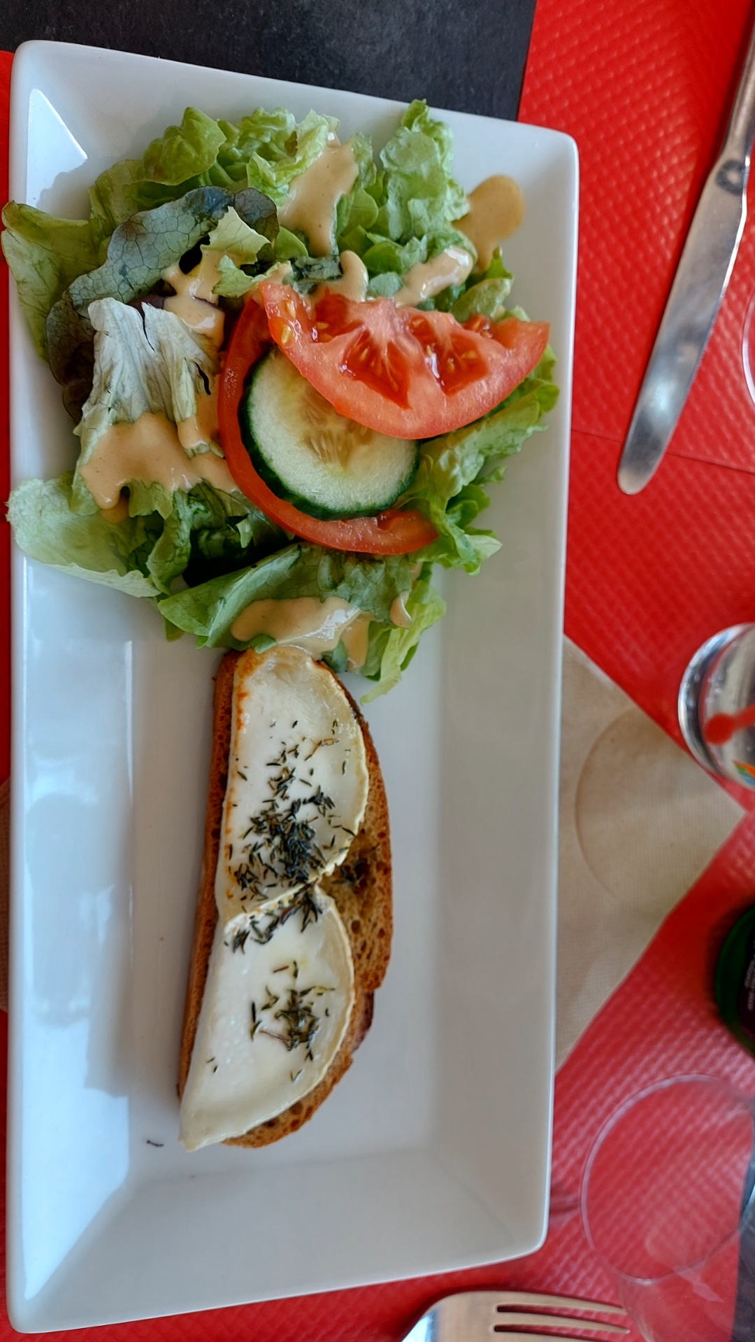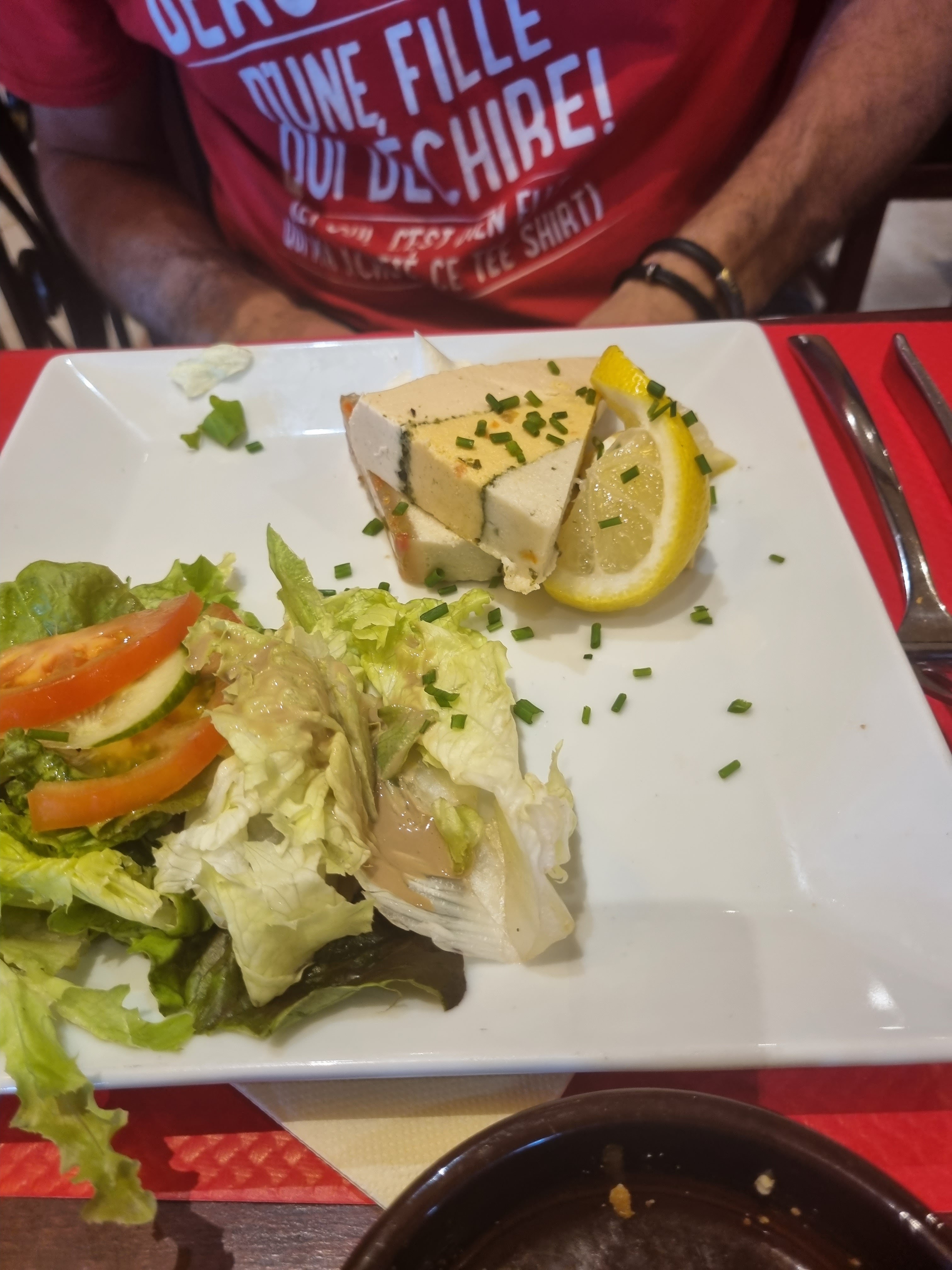 Nous sommes venus manger hier midi, On nous propose de manger à côté de d’autres personnes ( table de 4 ) juste pour le business … Rapport qualité prix un peu surprenant au vue de la quantité dans l’assiette. Sur le descriptif de l’assiette c’était mentionné des concombres on se retrouve avec deux malheureuses rondelles. Et avec deux feuilles d’endives non mentionner dans le descriptif. Lorsqu’on nous sers l’assiette on se dépêche tellement que l’on renverse un verre mais a par s’excuser rien n’est mis en place pour au moins essuyer la table Assez déçue, on m’en avais dis du bien 🤷♀️ ce n’est qu’un cas particulier Cependant les serveurs méritent beaucoup de courage pour leur travail