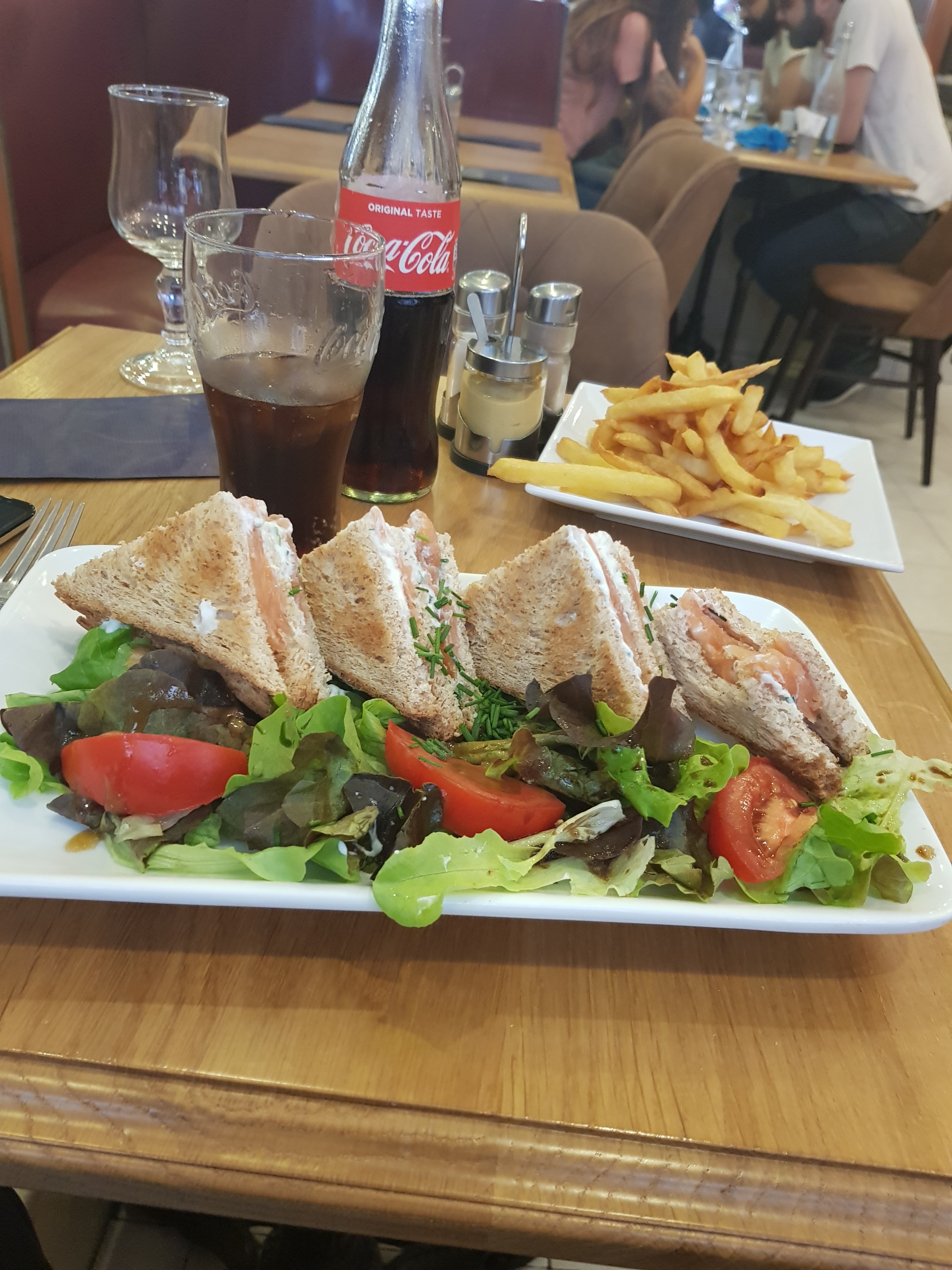 Personnellement, mon plat était insipide; pour une amie, il y a eu une erreur dans sa commande... Le pire arrive! En faisant la queue pour payer, nous étions le long du coin cuisine -entre le bar et les escaliers, et nous regardions le cuisinier. Il préparait différents plats: salades, burgers... Il a pris un bouteille (blanc en plastique) qui contenait ce qui ressemblait à du pesto et la nettoyer avec sa bouche et après à verser la sauce dans un plat!! oui-oui! on a été tellement choquées! c'est quoi leur problème? et l'hygiène? jamais je n'y retournerais.
