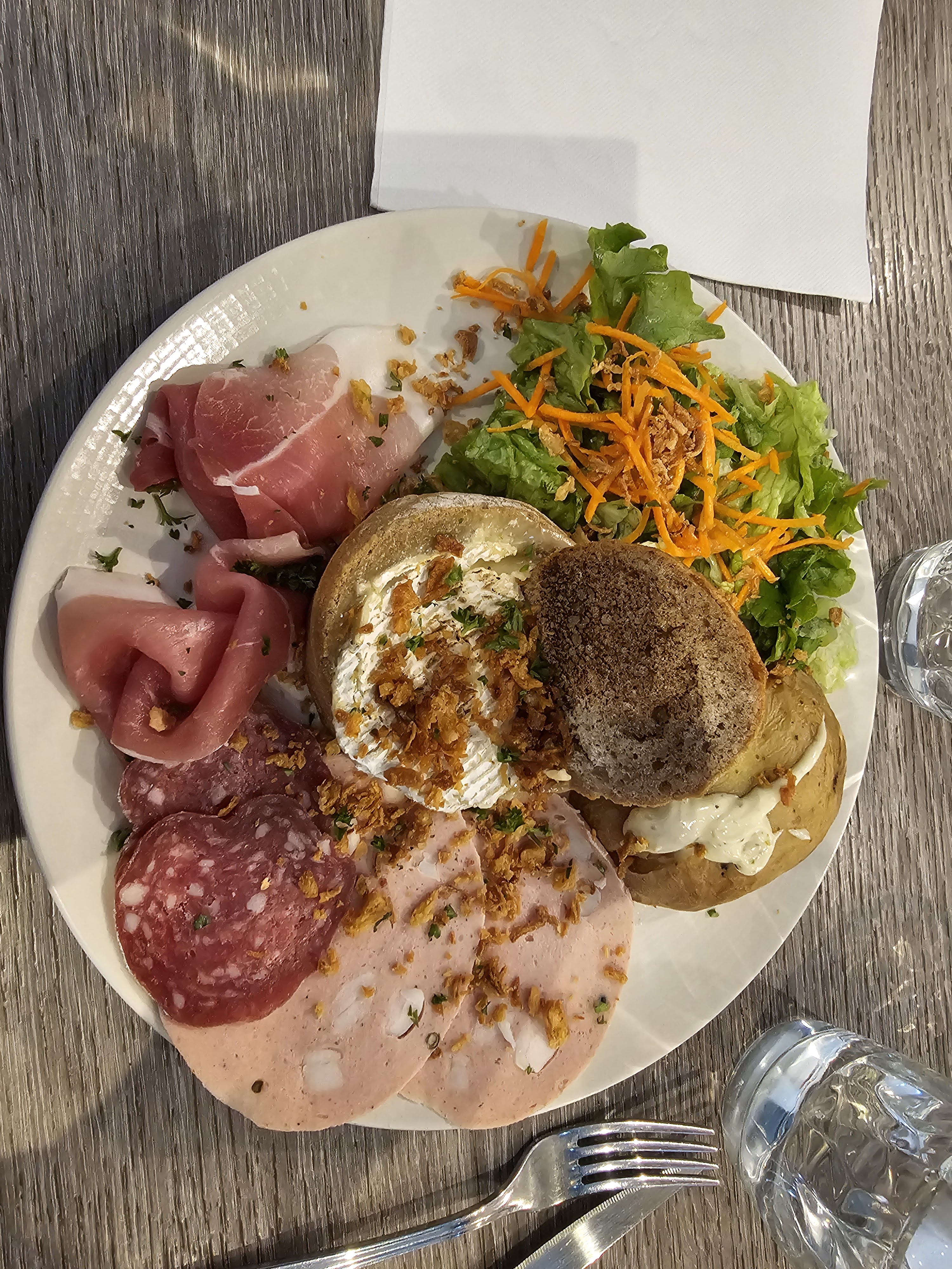Première fois dans cette brasserie pour déjeuner à 14h, bon accueil du patron, ce qui n a pas été le cas d un autre couple accueilli par un très jeune serveur 10 mn après nous en leur disant que c était trop tard...sans état d'âme ! nous sommes au mois de juillet ! Au moins demander au responsable ! Par contre ménage salle de restaurant à revoir EN PROFONDEUR, et en jetant un œil furtif par le passe plats, la cuisine n a pas l air rutilante...d ailleurs la petite porte est rapidement fermée une fois les assiettes récupérées derrière. Une serviette s étant envolé près de ma table, trois serveurs ont marché dessus sans la ramasser (c est un détail mais qui en dit long !) On est dans une brasserie pas un camping (et je n ai rien contre les campings évidemment!) Belle devanture avec les étagères à bouteilles qui font leur petit effet à l entrée mais c est tout ! Dommage il y aurait de quoi faire pourtant ! Sinon nos salades étaient bonnes !