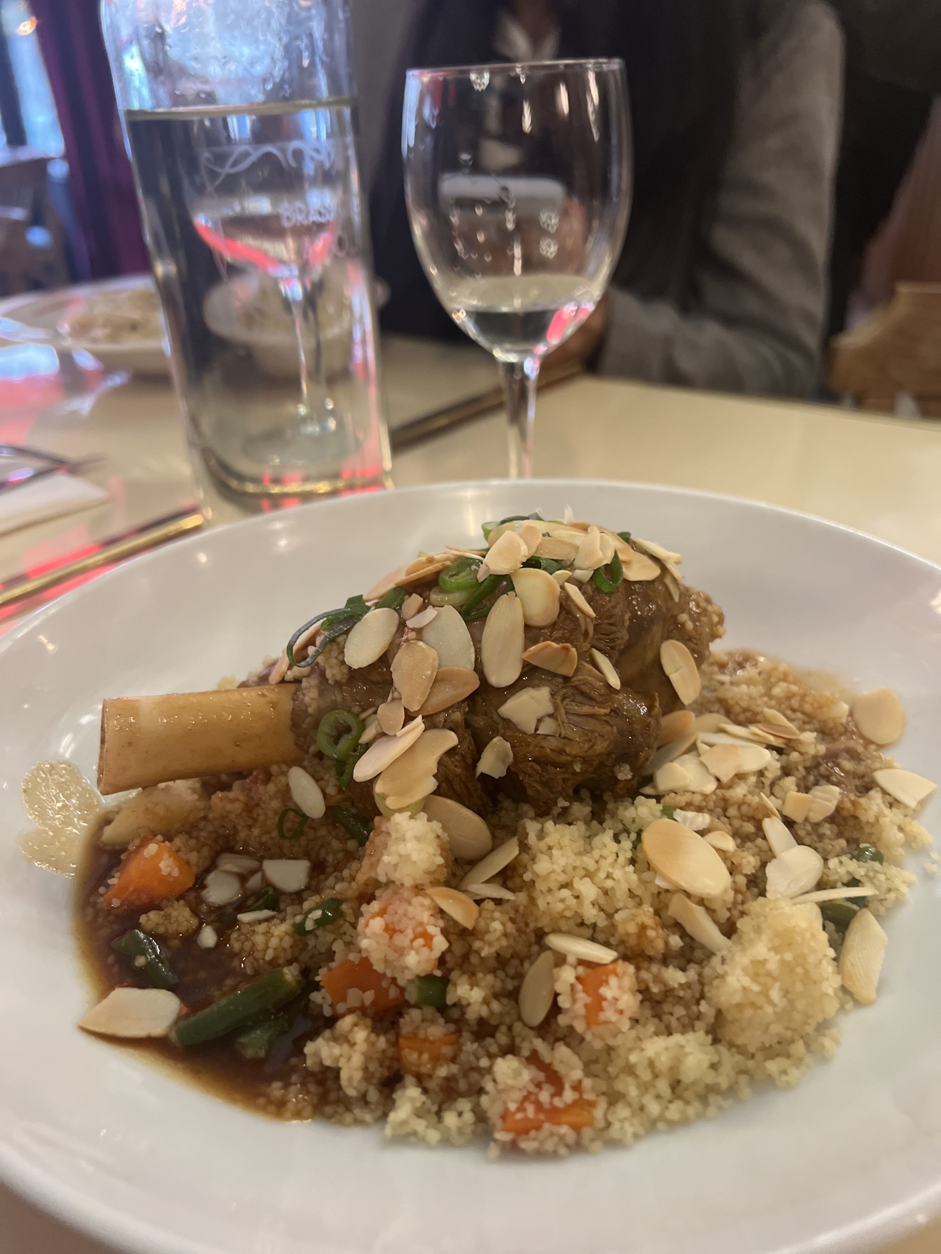 A midi, je suis allé dans un restaurant recommandé par un camarade de classe, j'ai été relativement satisfait du déjeuner à deux plats pour 22 dollars. Jarret d'agneau - Le ragoût d'agneau est très croustillant. Il s'agit de la position du jarret d'agneau.
