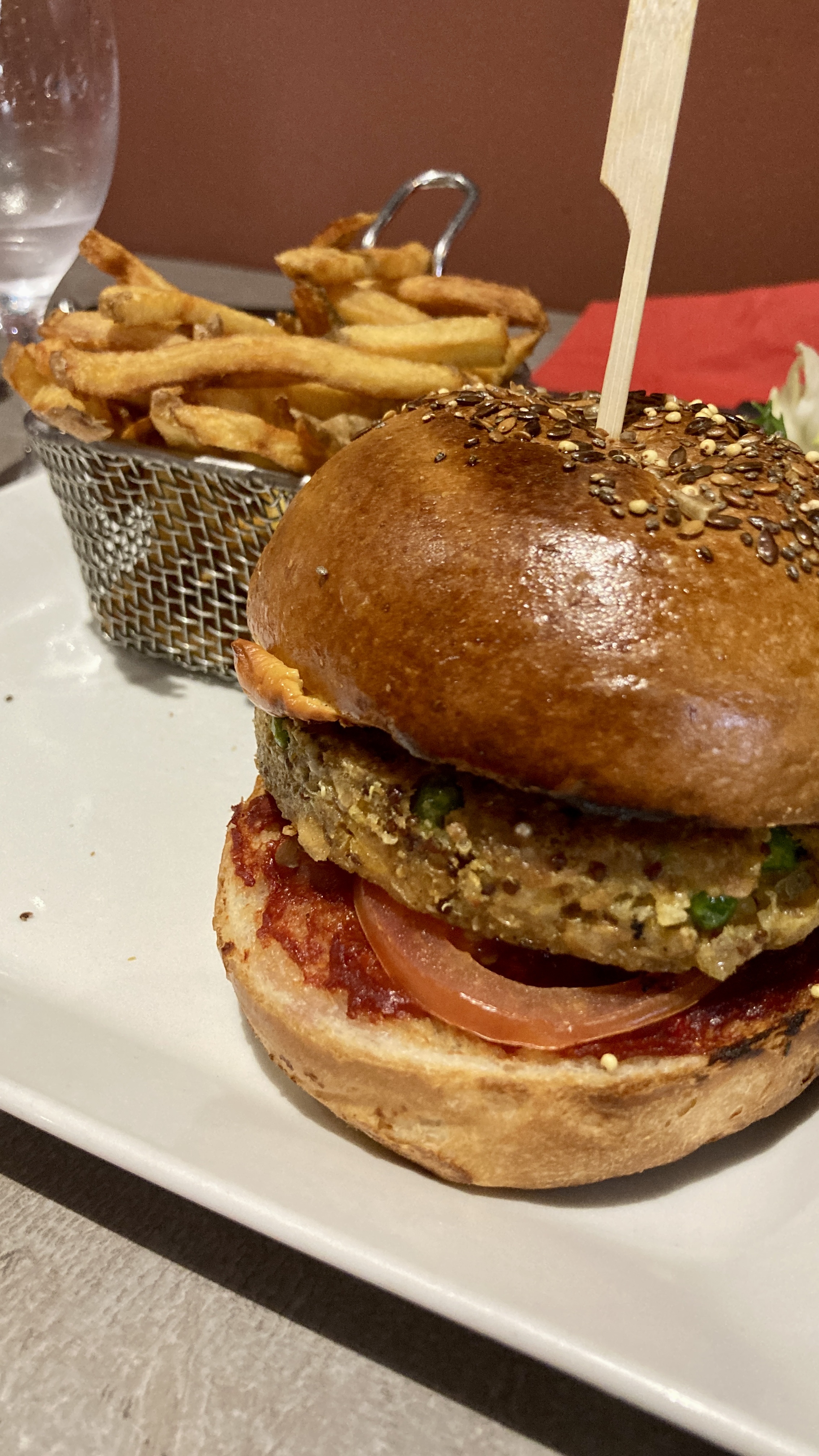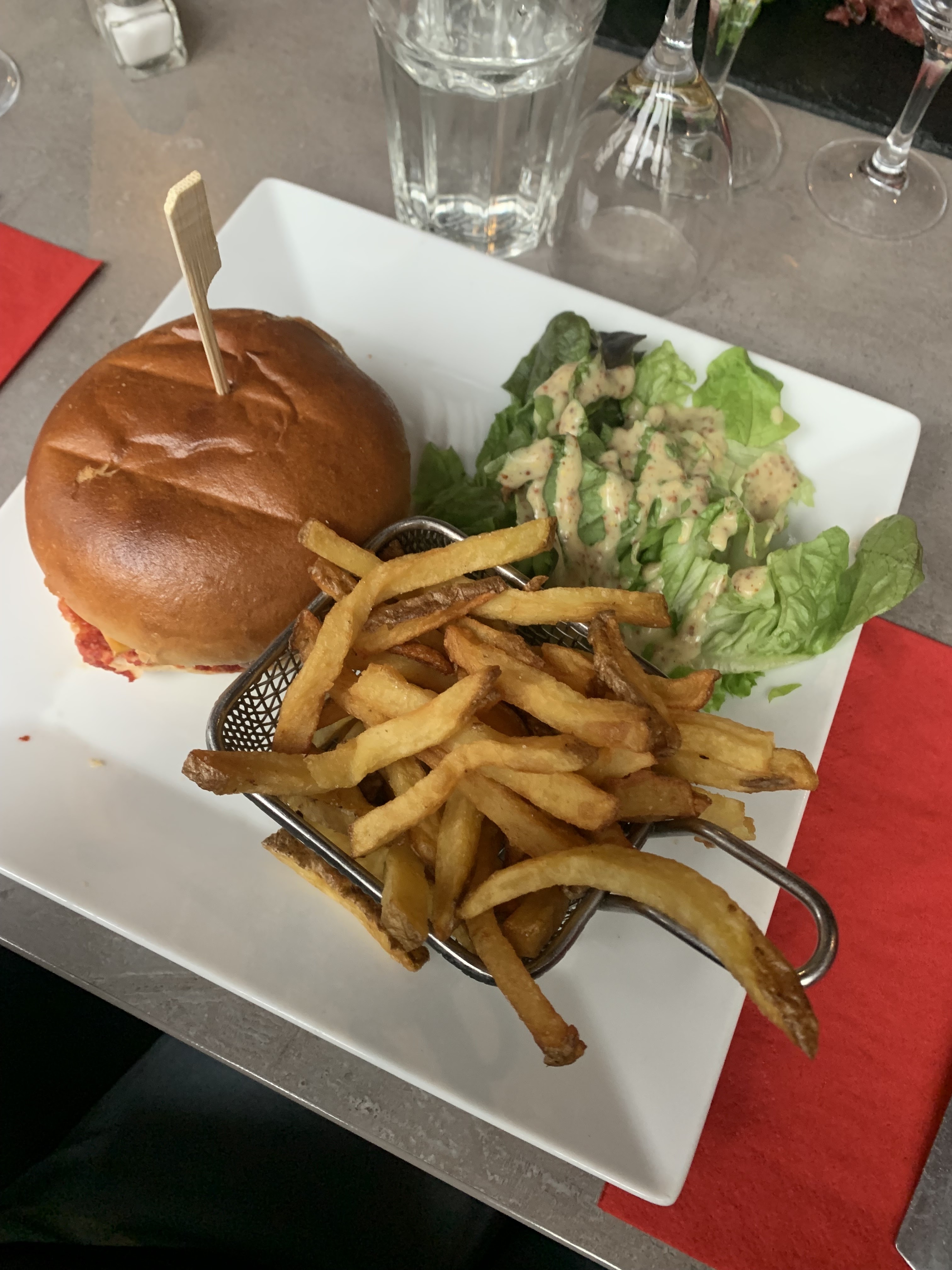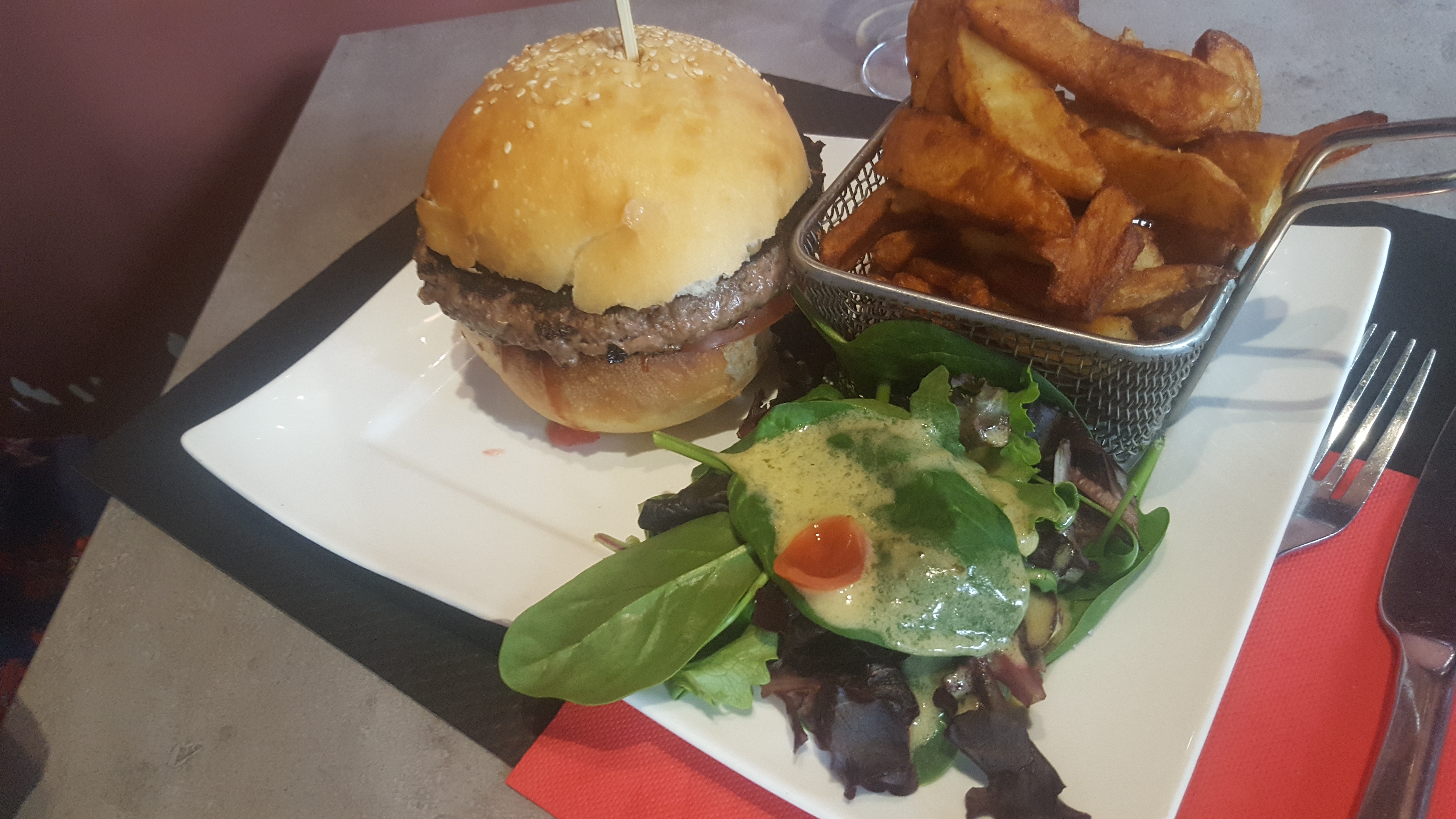 Bon mais pas exceptionnel. Le burger était bon sans plus, la salade paraissait artificielle. Les frites n'étaient pas particulièrement réussies, ni mauvaises, juste normales. Le serveur était plutôt aimable et les prix sont corrects. Un restaurant standard qui fait le boulot sans forcément mériter un détour.