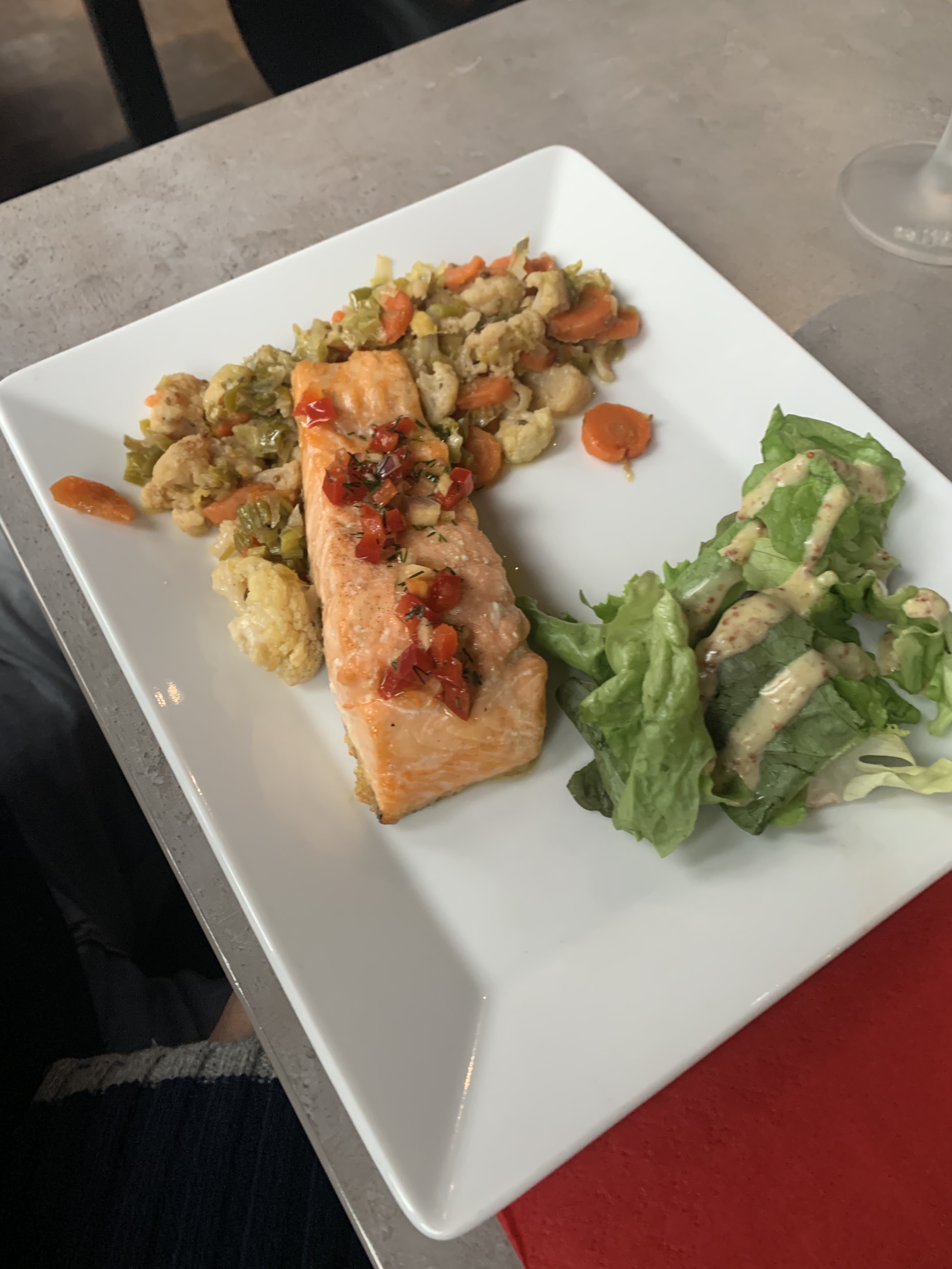 J'ai commandé un saumon et des tagliatelles à l'encre de sèche : les portions étaient vraiment petites et le plat est arrivé froid. Dommage au vu des tarifs pratiqués. Sinon, l'endroit est agréable surtout la terrasse extérieure car l'intérieur du restaurant est un peu triste.