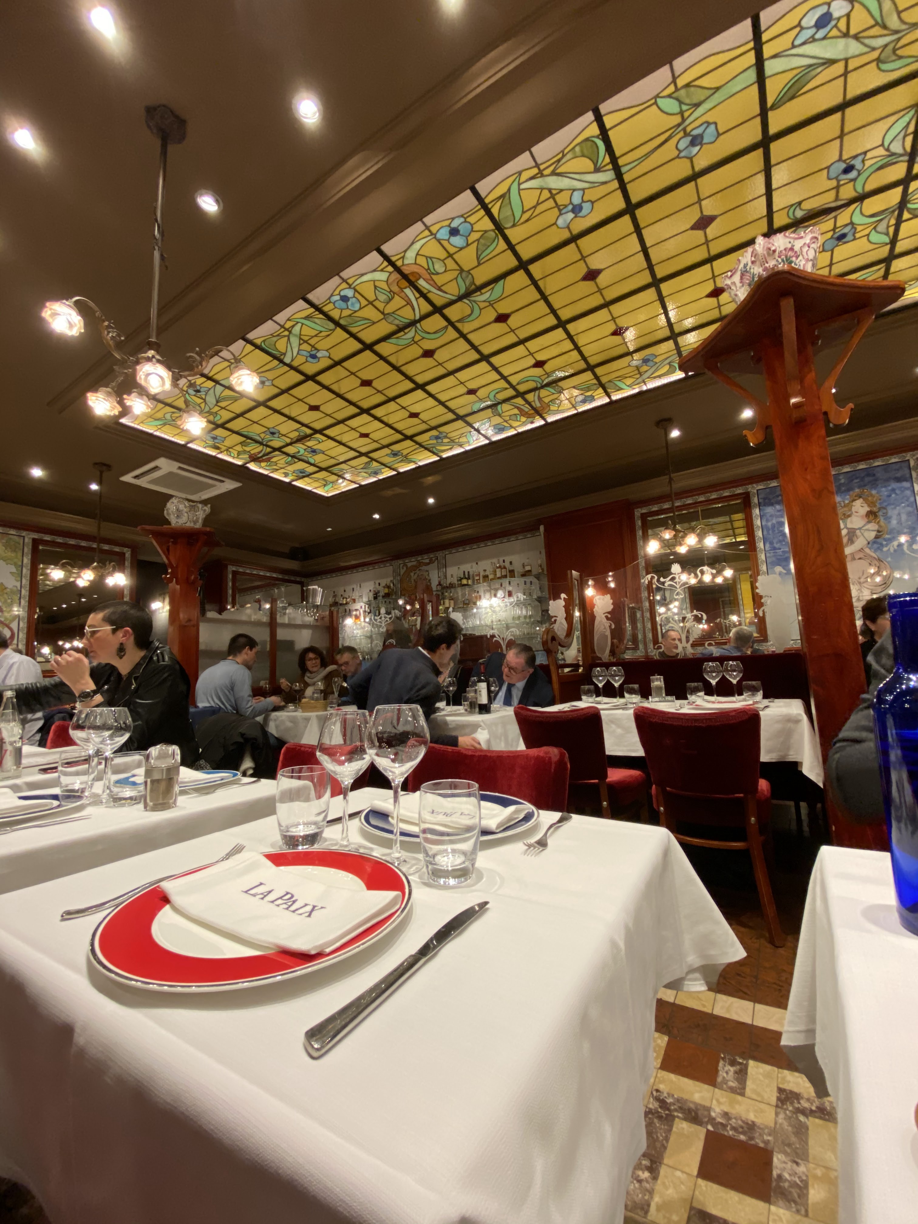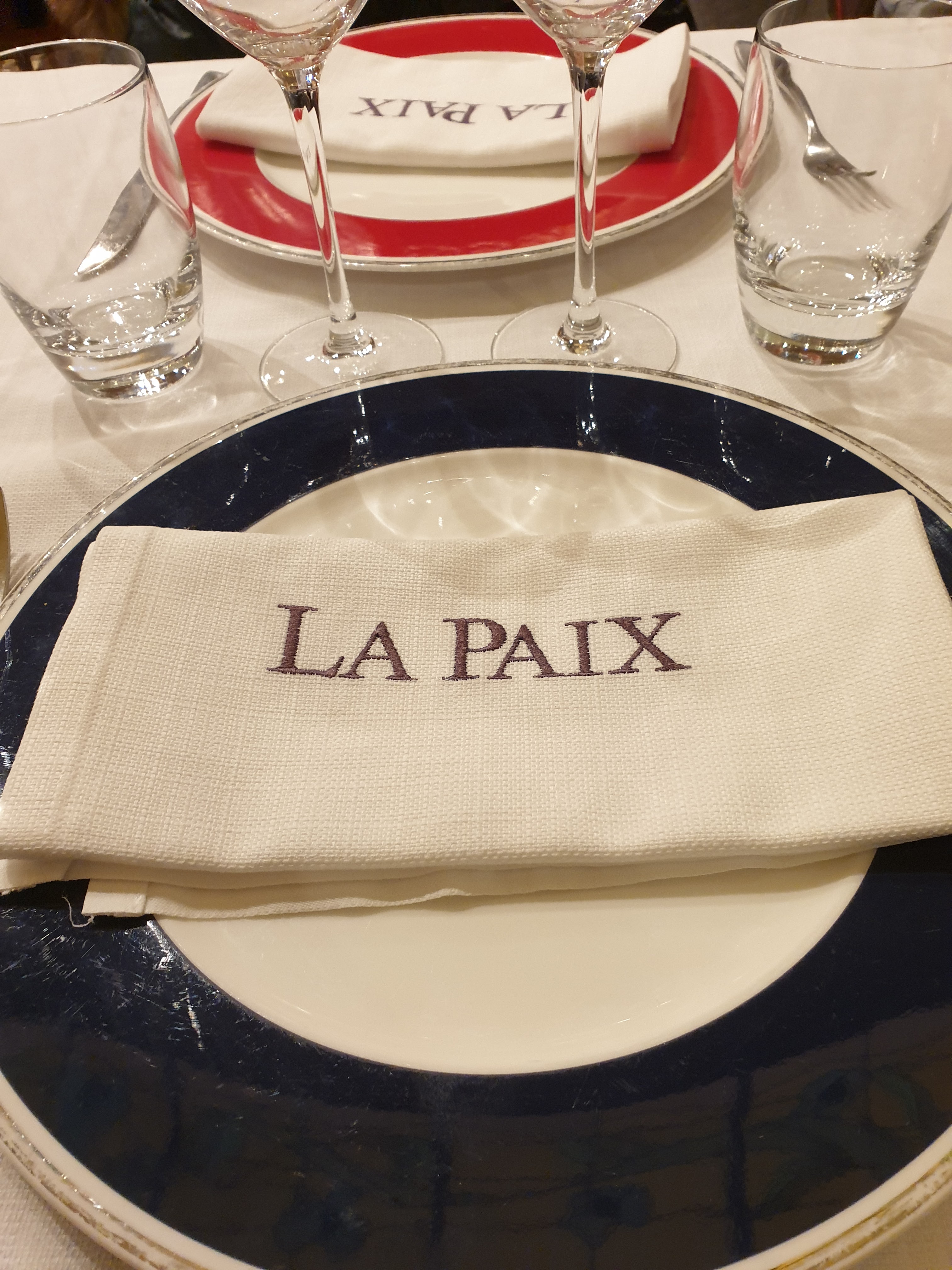 La Brasserie de la Paix Une brasserie de prestige proposant un menu à 22 euros comprenant entrée, plat dessert, c'est plutôt bien. Qui plus est, arrosé d'une bouteille de 37, 5 cl d'un bon château de Bordeaux. C'est plutôt génial ! Un service de qualité ! Avec un bémol cependant, la très nette impression partagée par mon amie qui m'accompagnait qu'à la fin du repas le serveur était vivement pressé de nous voir prendre la voie de la sortie. Pour exemple nos manteaux qu'il est allé chercher pour nous les présenter....🎃