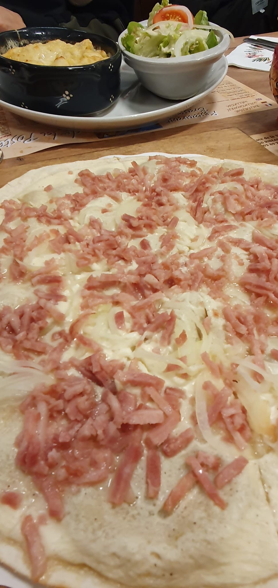 Accueil convivial ! Plat copieux et excellent ! Mon mari à prix un jambonneau braisé sur lit de choucroute et moi tarte flambée aux saumon et salade vraiment bon je conseille !! Très bon rapport qualité prix !!