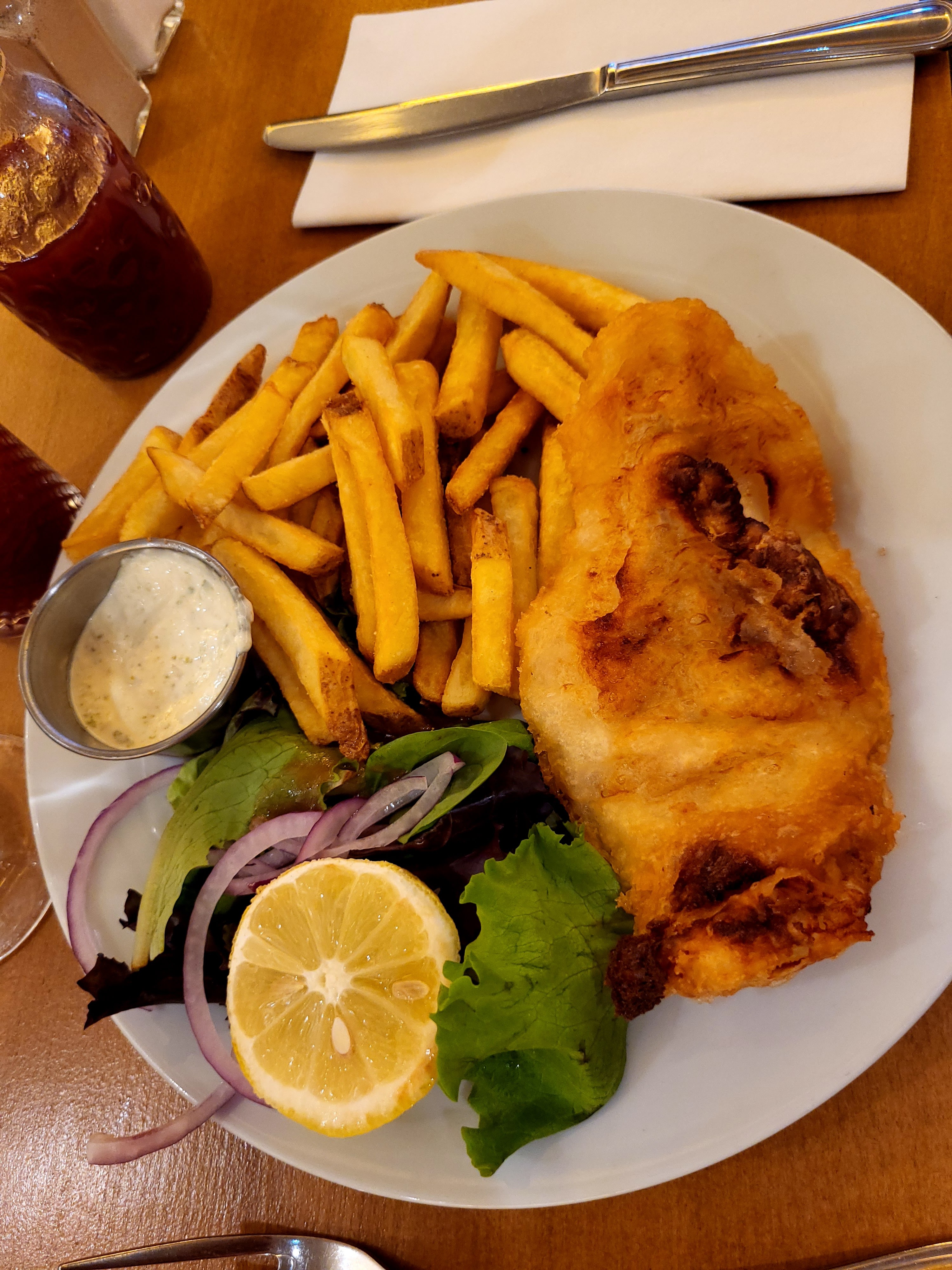 Pas possible de commander de flamenkuch au saumon ce soir, pas de cabillaud, pas de poisson à part le fish and chip's. Du coup fromage pané, c'est bon mais ça devient vite écœurant, c'est accompagné de frites avec du fromage dessus mais les frites étaient trop blanches à mon goût. Sinon le cadre est sympa, le services est bon et la glace était bonne. Les hamburgers ont l'air délicieux dommage qu'il 'y ait pas la possibilité d' en avoir halal.