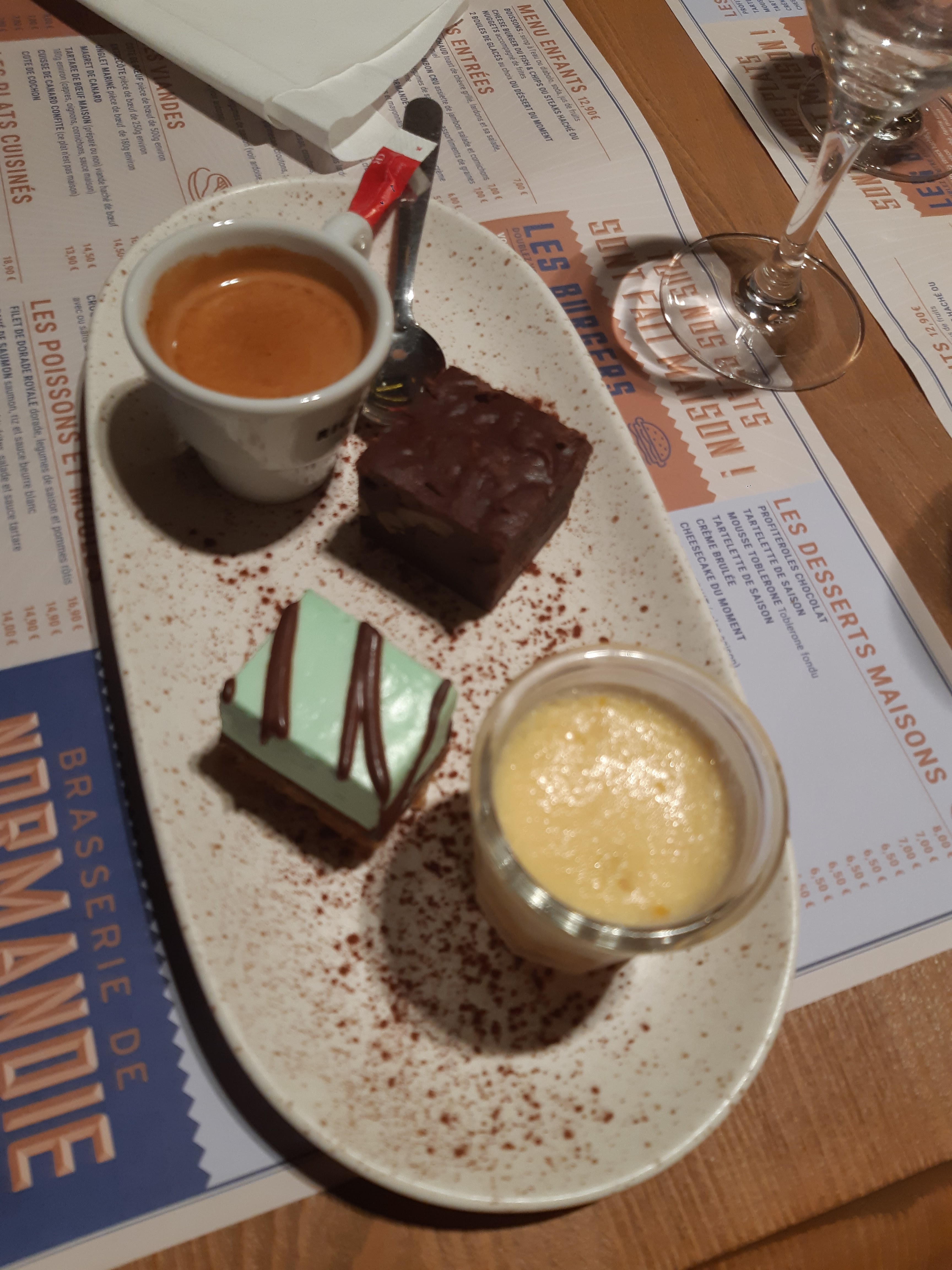 Le restaurant à une très belle salle, avec un personnel aimable, à l'aise dans leurs travail et sérieux. Et mon plat camenbert Rôti était bien présentais et bon. Par contre, ce que je n'ais pas apprécier dûtout c'est que, au moment où je voulais prendre un café gourmand, le serveur me dit qu'il ne sait pas ce qu'il y a car c'est la cuisine qui met ce qu'il a en stock. Dommage qu'ils ne font pas un point le matin avant de commencer sur les 2 services où que les serveurs ne pas soit au courant cours du service sur ce que on va vraiment avoir dans nos assiettes.