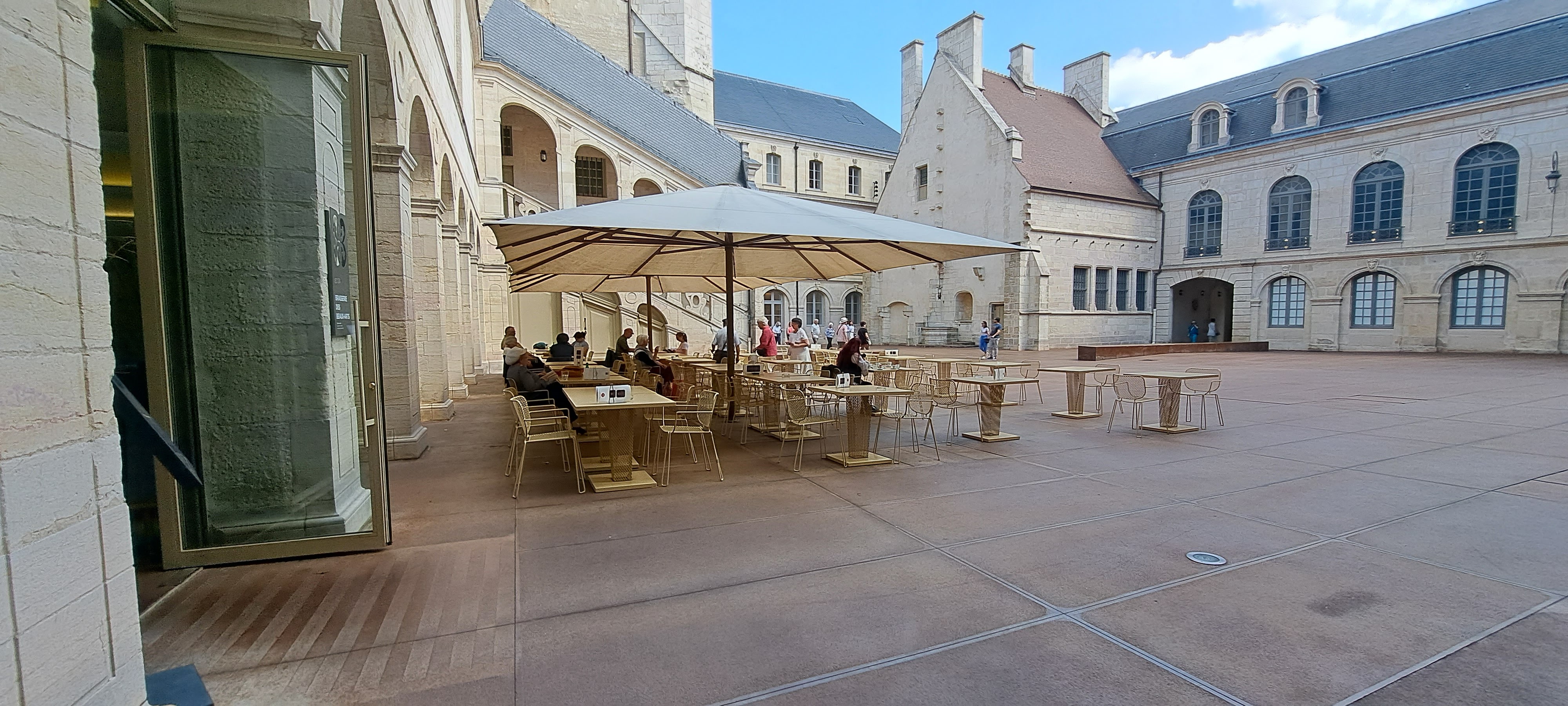 Sans doute dernier déjeuner au soleil en ce début octobre. Cadre de toute beauté que les amateurs de vieilles pierres et d'architecture sauront apprécier. Service assez rapide. Les jeunes serveurs sont souriants et attentifs. La carte est fidèle à celle dune brasserie avec un choix limité. La daurade est à recommander. Son accompagnement de champignons est goûteux et surprenant positivement. Les tarifs sont en relation avec le lieu. A tenter !!