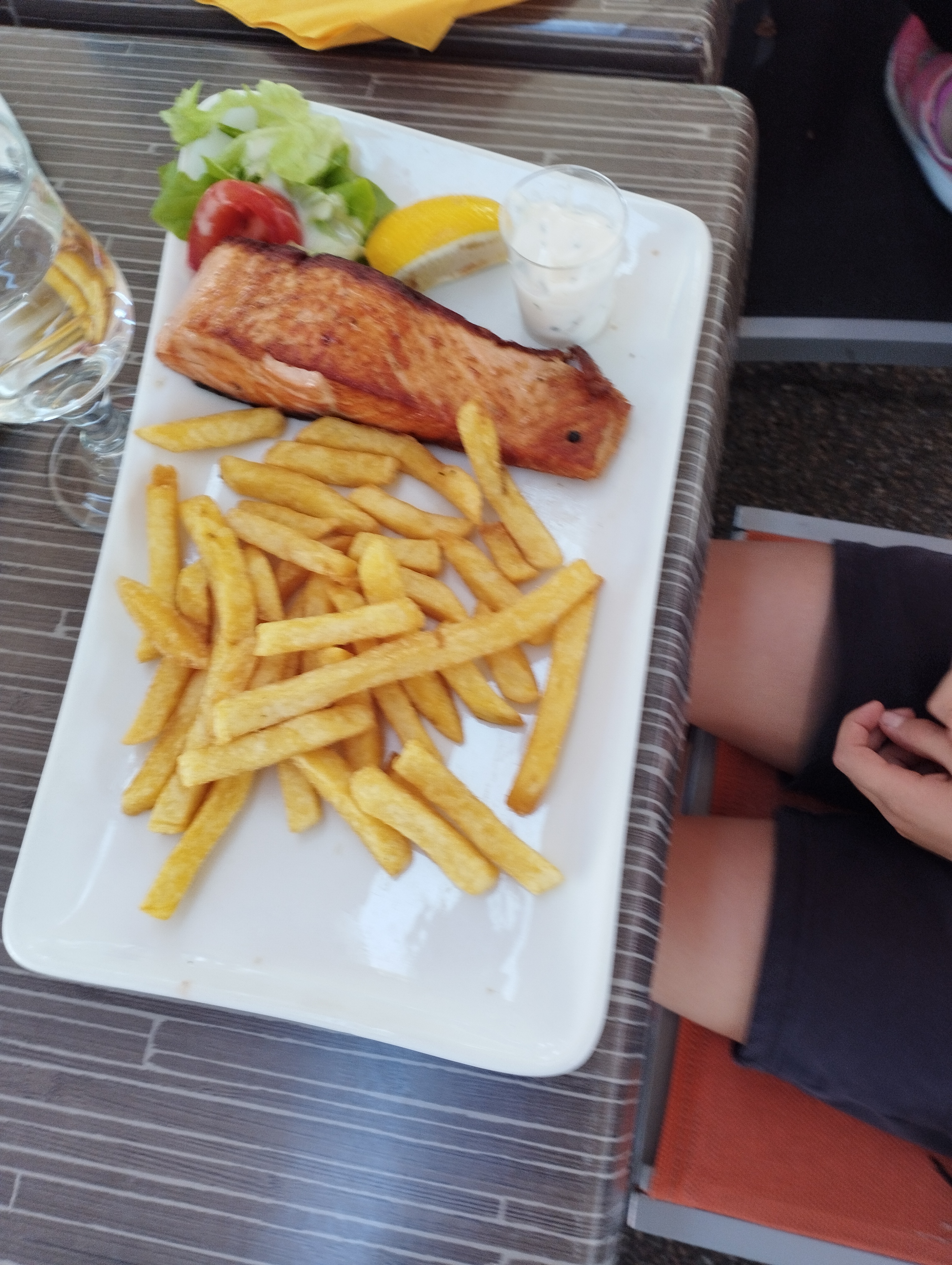 Nous avons manger à deux un soir et les tables de deux sont en plein milieu de la salle donc pendant tout le repas les client et les serveurs nous passer à côté c’était vraiment très désagréable nous n’avons pas manger tranquillement. En ce qui concerne le repas le prix est correct, la salade de saumon était bien garnie, la pizza également mais malheureusement sans aucun goût ni saveur c’était très fade, puis des frites bien croustillantes mais malheureusement surgelées comme le reste vu le manque de saveurs.