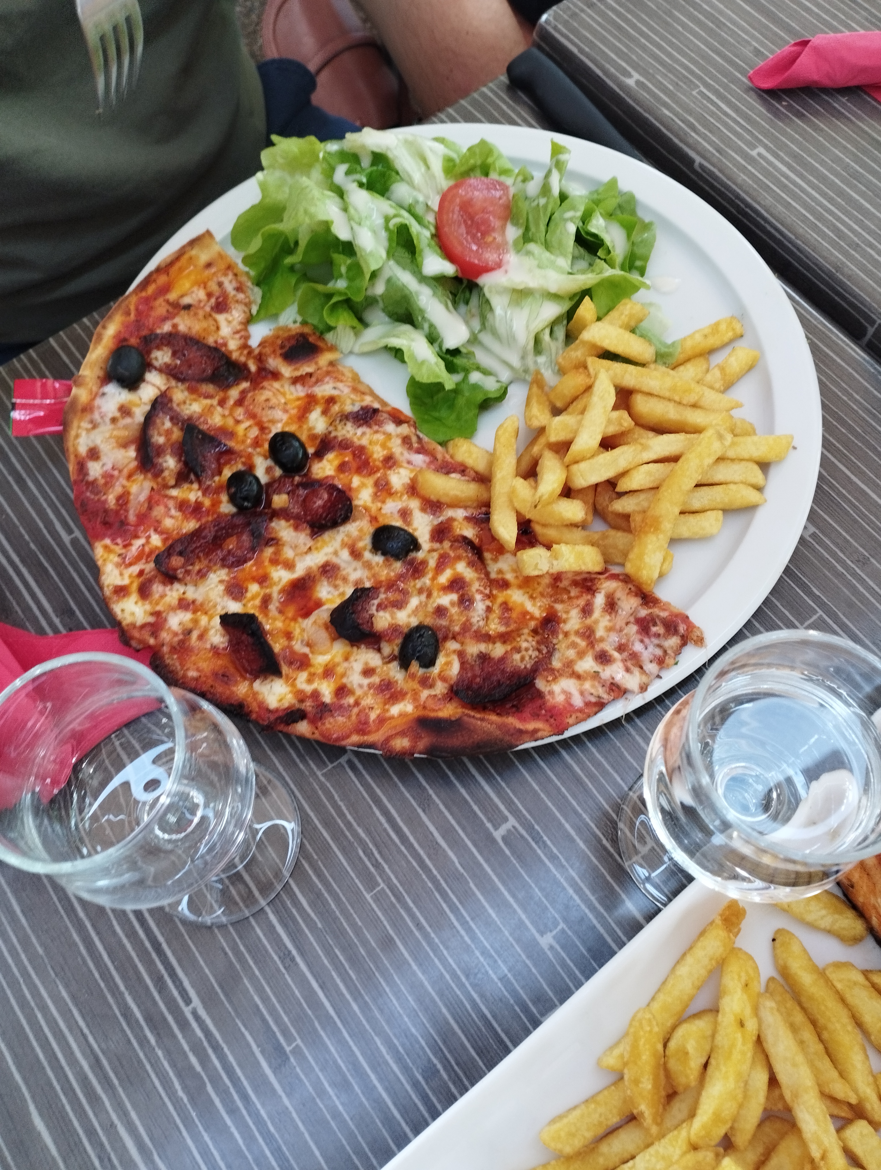 Petit repas rapide pour un midi d'excellente qualité , 1/2 pizza frites salade le tout très bon .