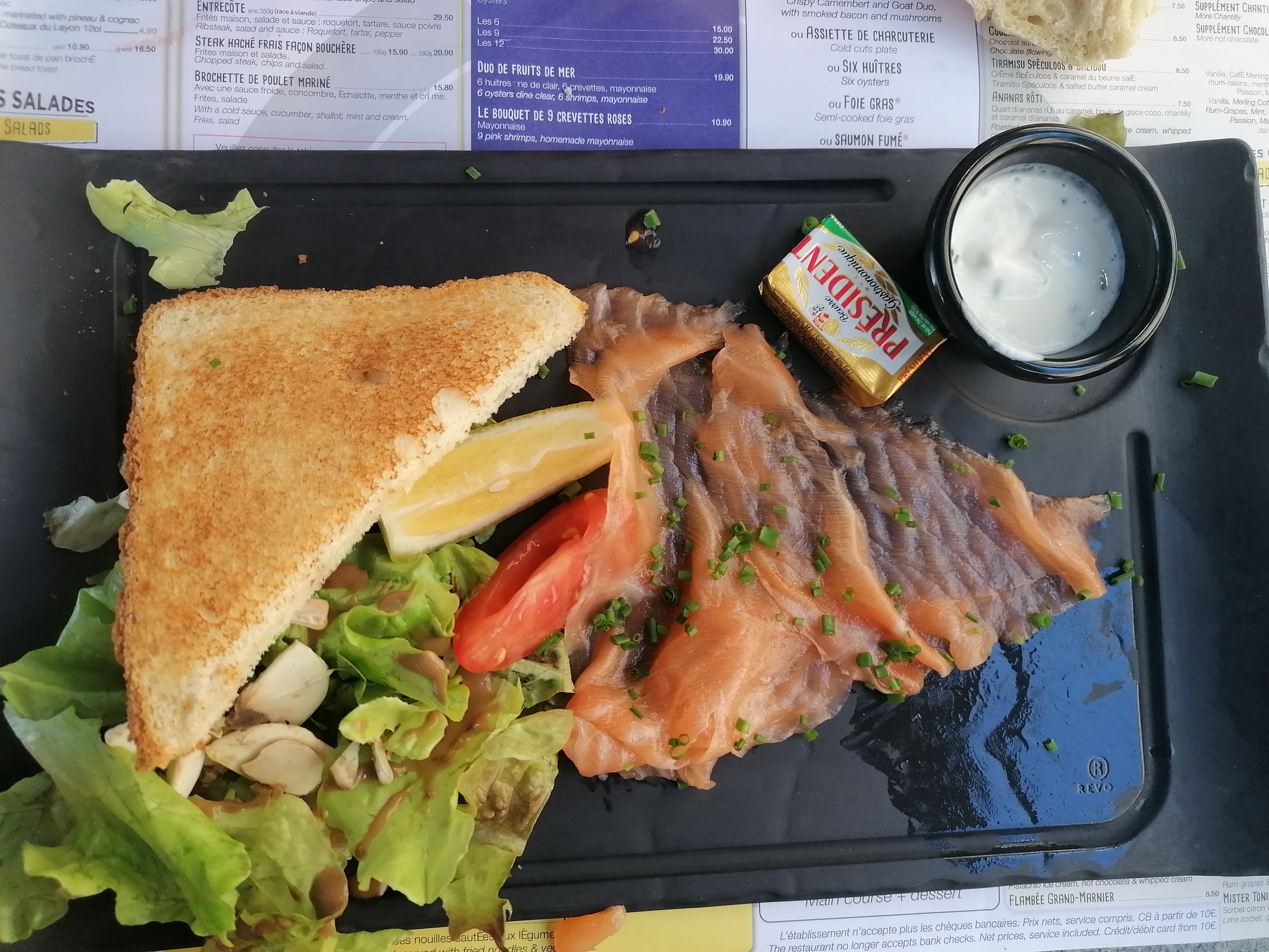Super restaurant. Je voulais du poisson a la base, mais je me suis finalement penché sur le burger des dames qu'ils proposent à la carte. Le mojito était très bien chargé en alcool. Le saumon fumé sur place en entrée était vraiment délicieux. Et surtout les frites maisons étaient exquises ! Je conseille fortement.