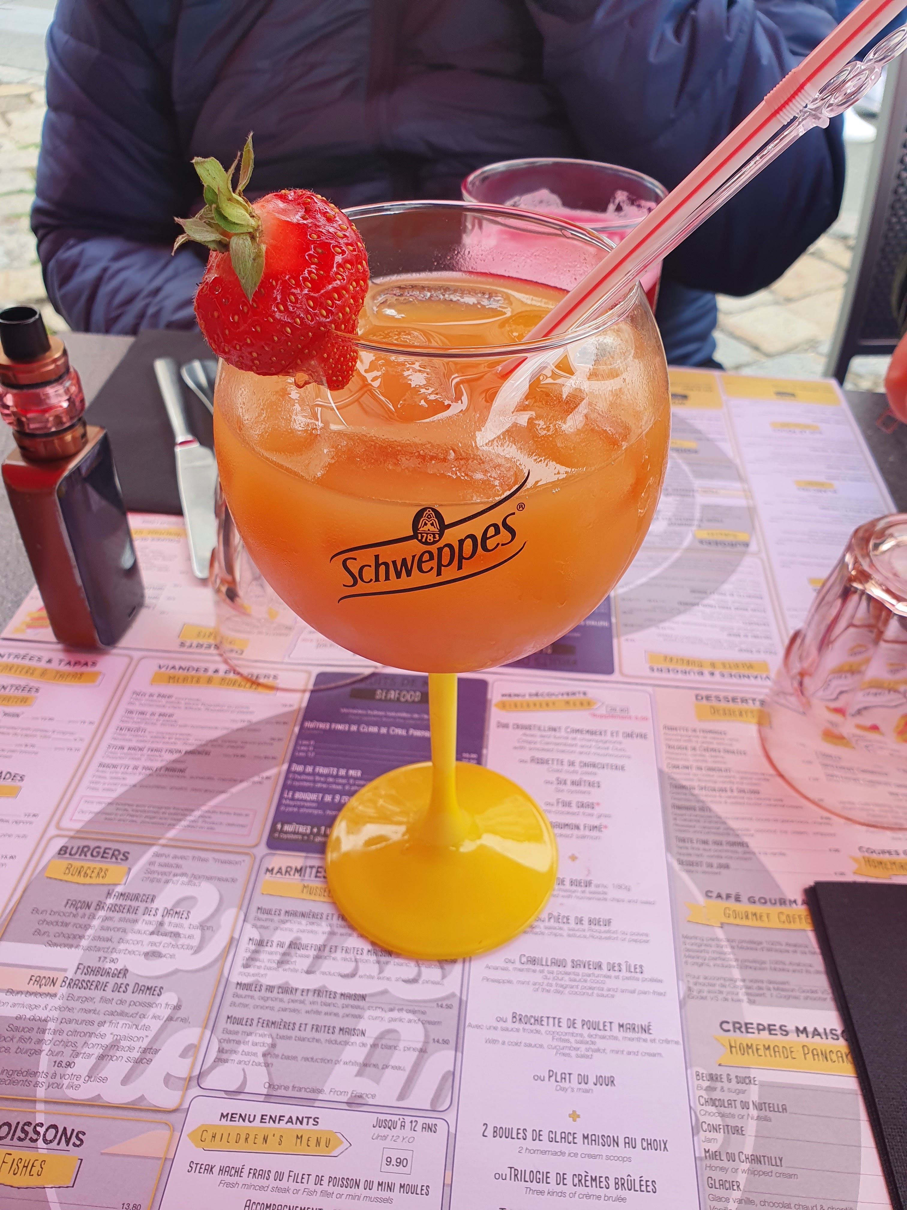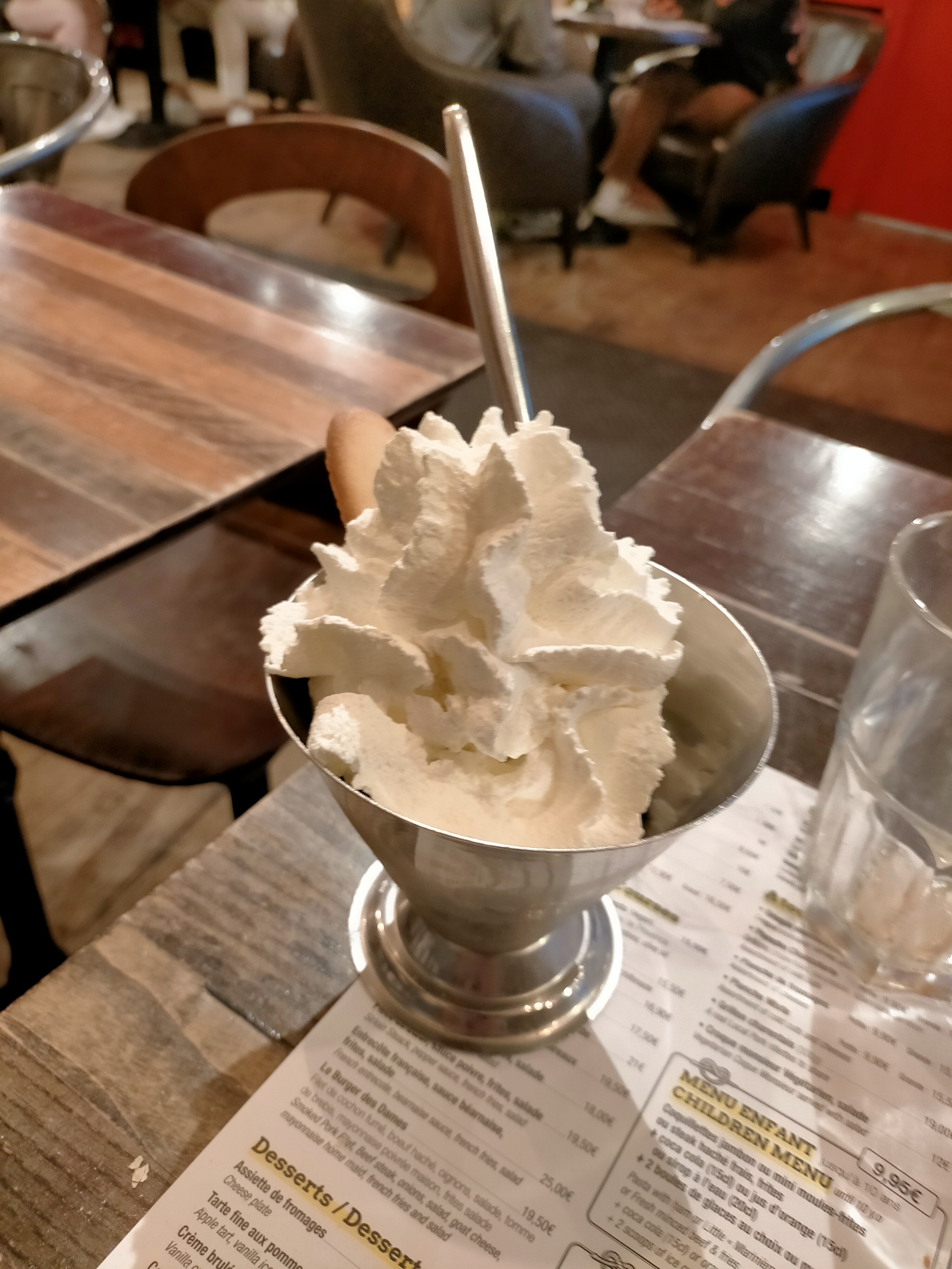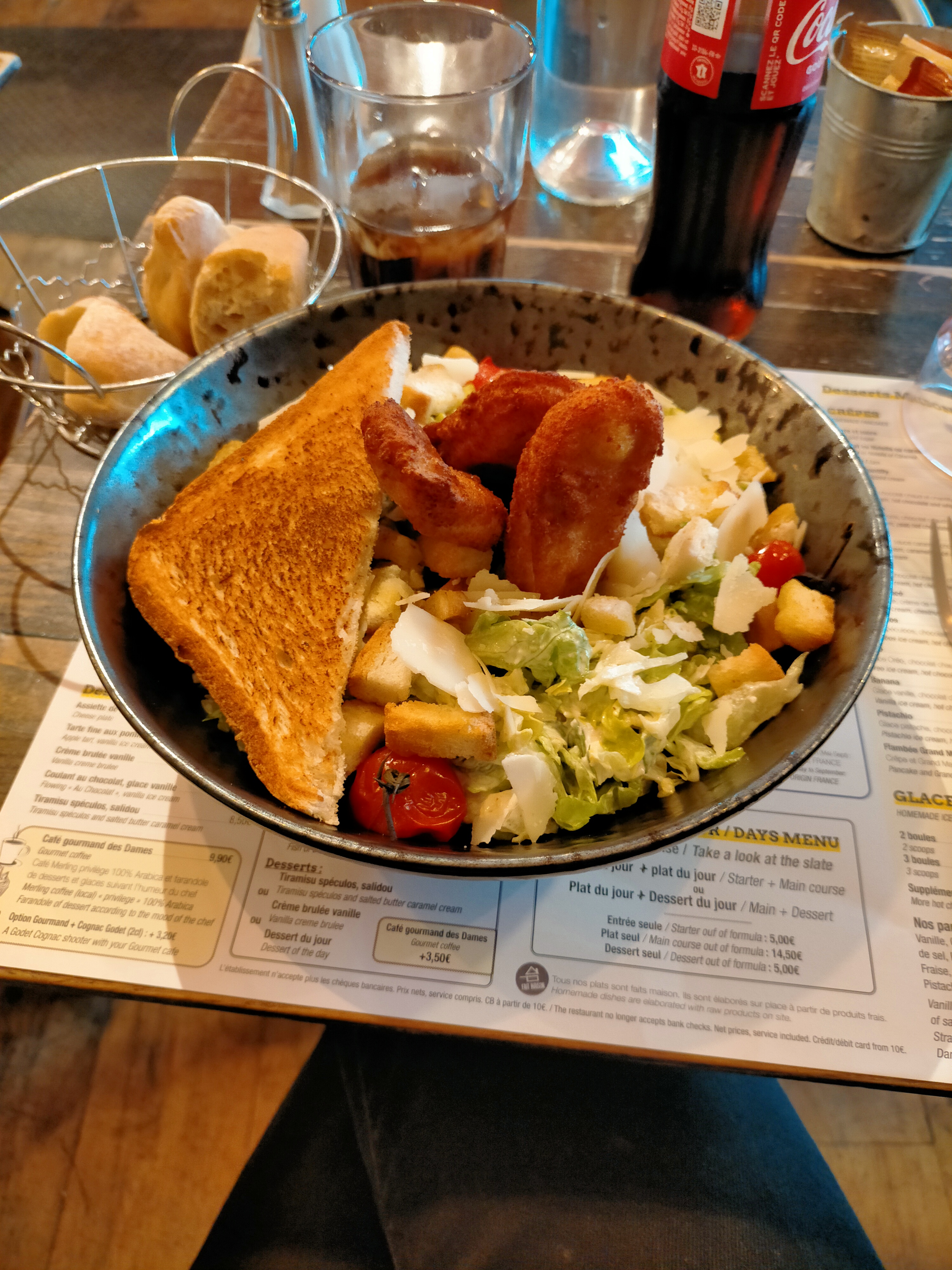 Un menu enfant avec coca mais si on veux fanta c’est en plus… dans le meme menu on ne nous a jamais demander si on voulais un dessert en plus de 20mn d’attente… bref on a payer un menu enfant complet + une boisson « en option » et un dessert inexistant pour que notre enfant se retrouve uniquement avec le plat… pour nous ca a ete moule frite donc rien de compliqué cnest correct. A noter que au moment ou nos boisson d’aperetifs sont arrivé nous avions deja eu la planche a partager 10mn plutot… bref vraiment pas fou. Dommage vu la belle place de cette brasserie….