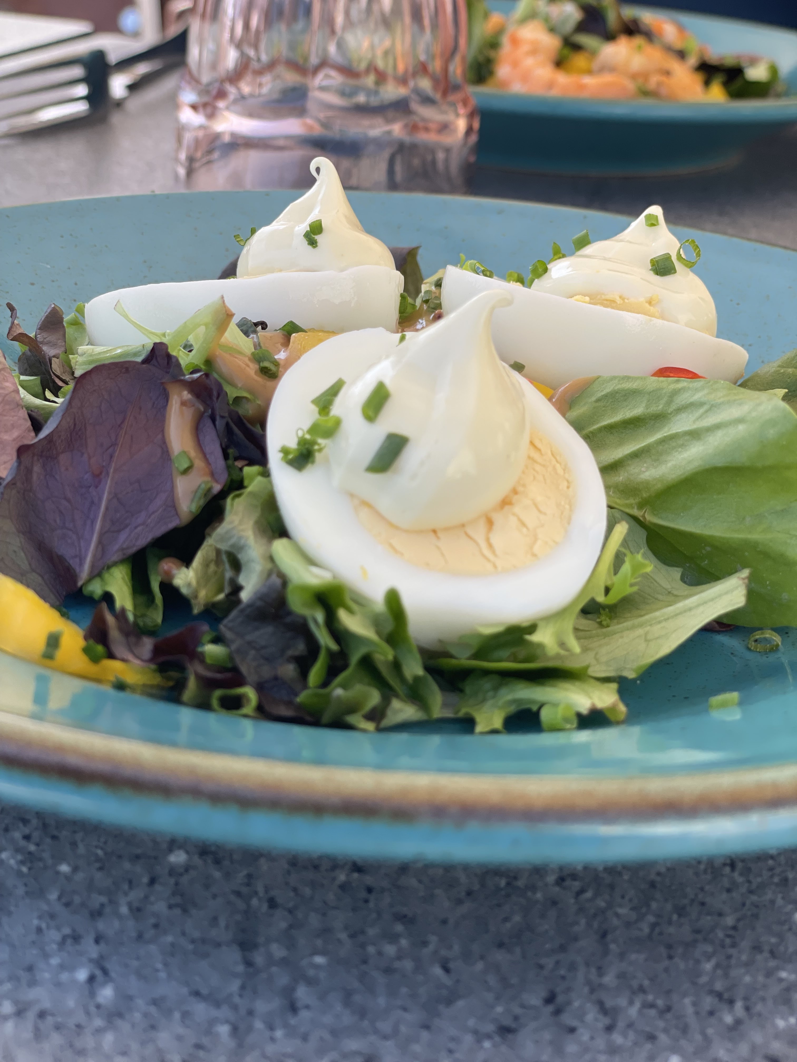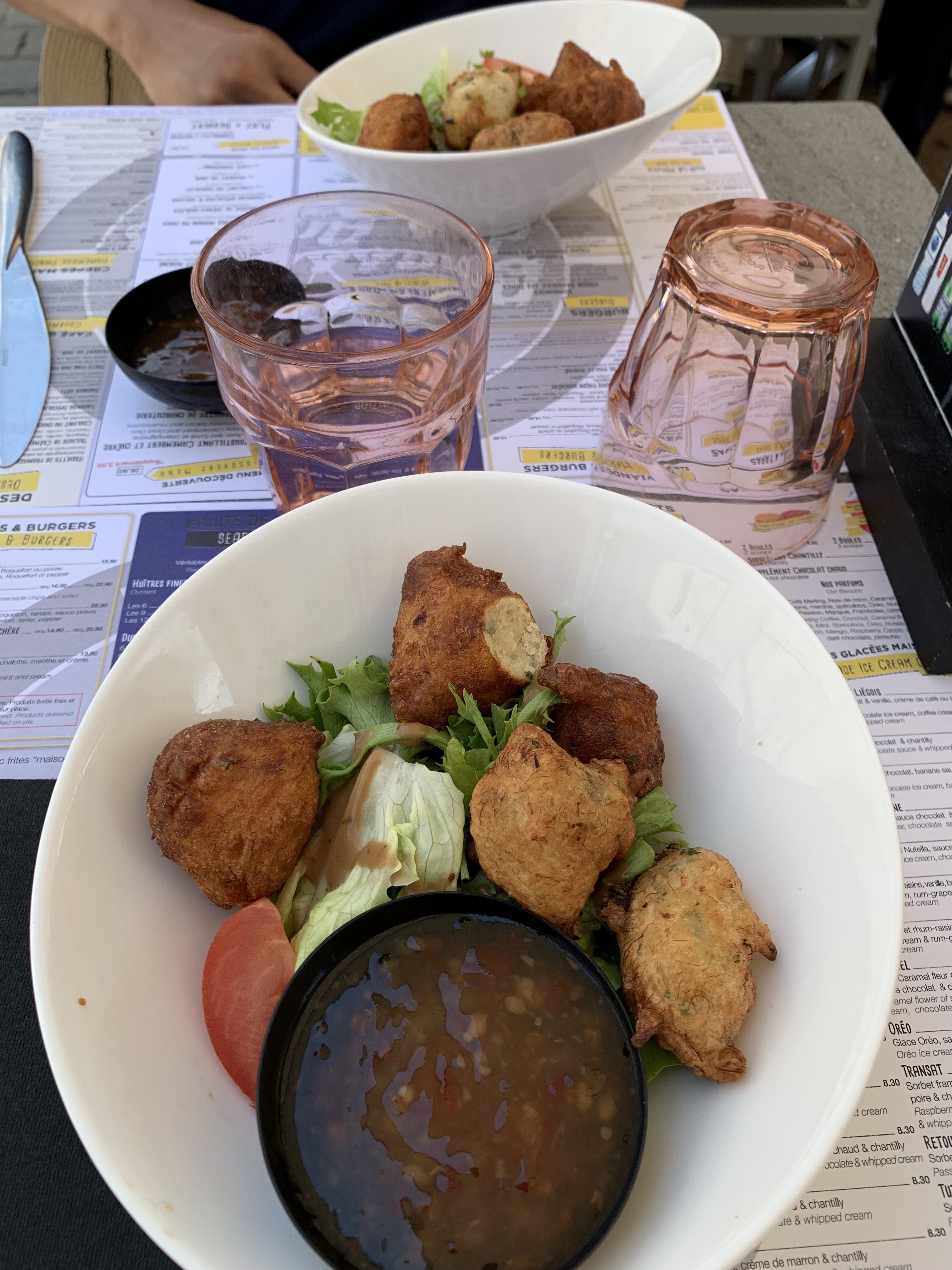 une quenelle de poisson et un.petit bout de pain en entrée. une.petite.cuisse de.poulet avec des frites maison, mais tellement.maison qu on récupère des tout petits.morceaux cramé imamgeables. et Le dessert, une île flottante c est à dire 2 petites médaillons avec un.peu de creme je regrette.mon.choix