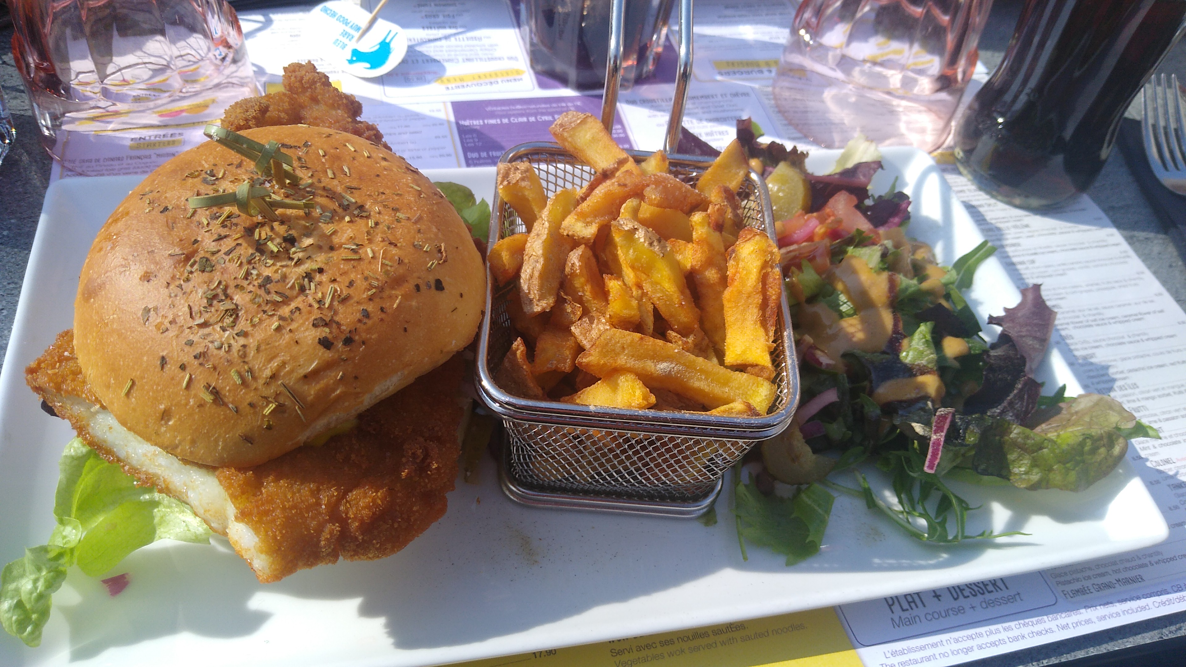 Le croque légumes et le burger fish sont bons. Les frites sont effectivement maison. Par contre le serveur que nous avons eu était aussi aimable qu'une porte de prison. Quel dommage, la politesse ne coûte rien et les clients ne sont pas des bêtes à nourrir. Étant aimable et courtois, on en attendait autant.