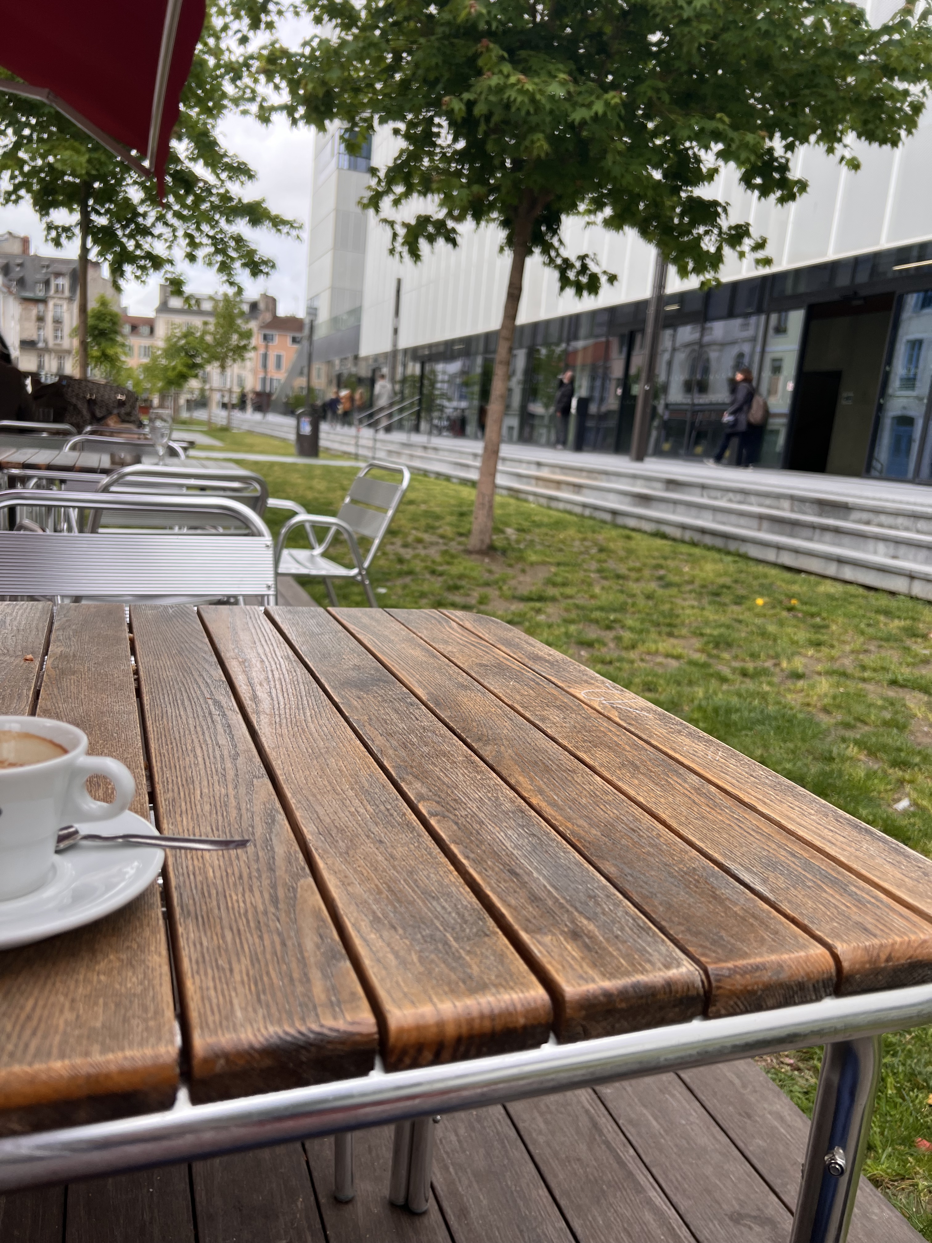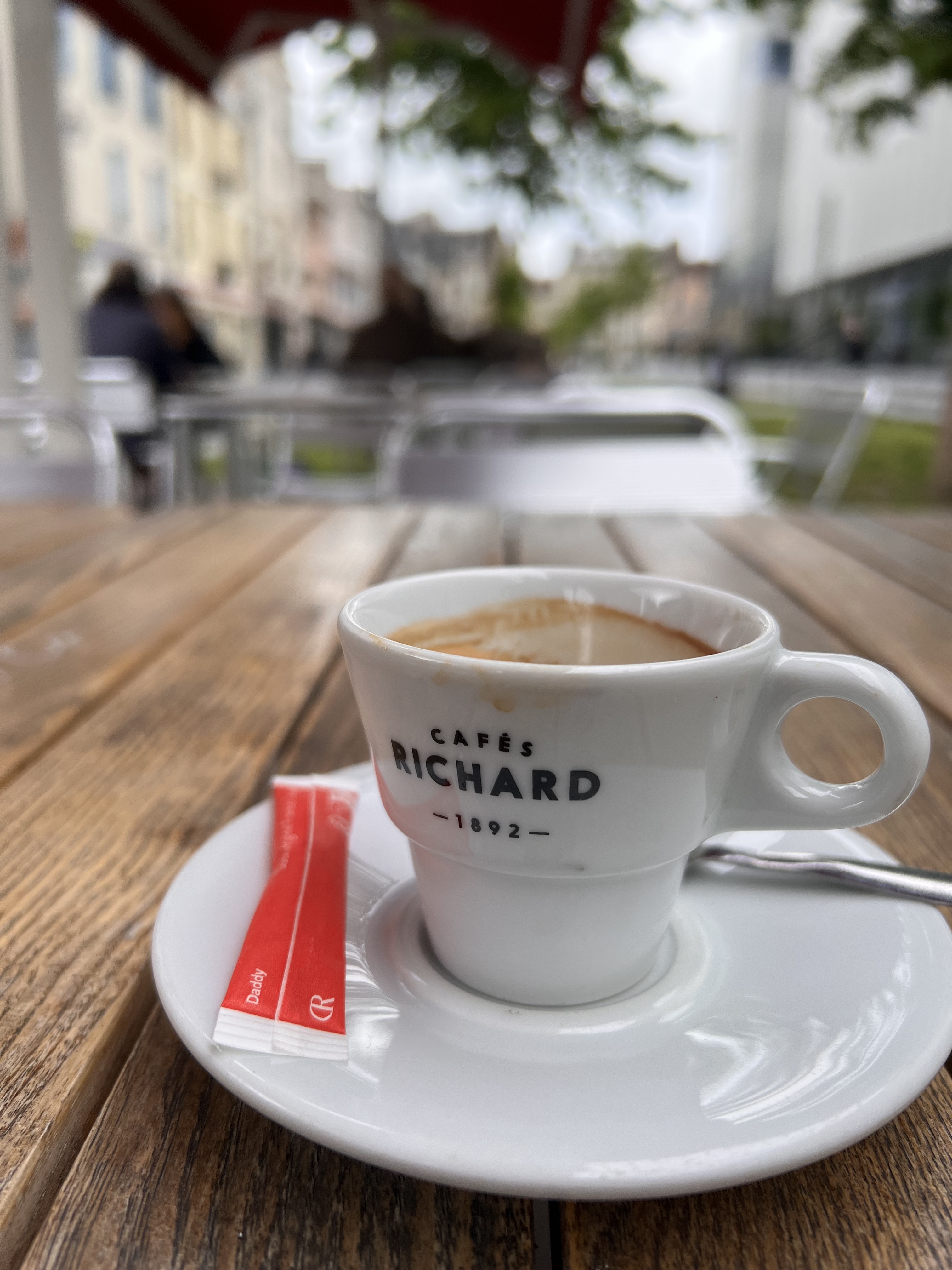 11h30, je m’installe en terrasse confort: siège avec accoudoirs, tables en bois, terrasse avec store mobile pour être protégé du soleil. De l herbe d un côté et une rue demi piétonne de l autre. 11h33 , on prend ma commande 11h34 on me demande à nouveau si on a bien pris ma commande 11h36 mon café arrive mousseux et bine présenté avec portion de sucre en poudre individuelle en sachet café Richard. Le café est bon et surtout Il y a un personnage qui anime à chaque fois le service : il a toujours des remarques incroyables et toujours gentil et bienveillant quand même. Il faut y aller rien que pour ça Je resterai bien mais le service du midi va commencer. Je laisse donc ma place. Je paie 1€40 très raisonnable pour cet environnement plaisant. Je recommande cette brasserie.