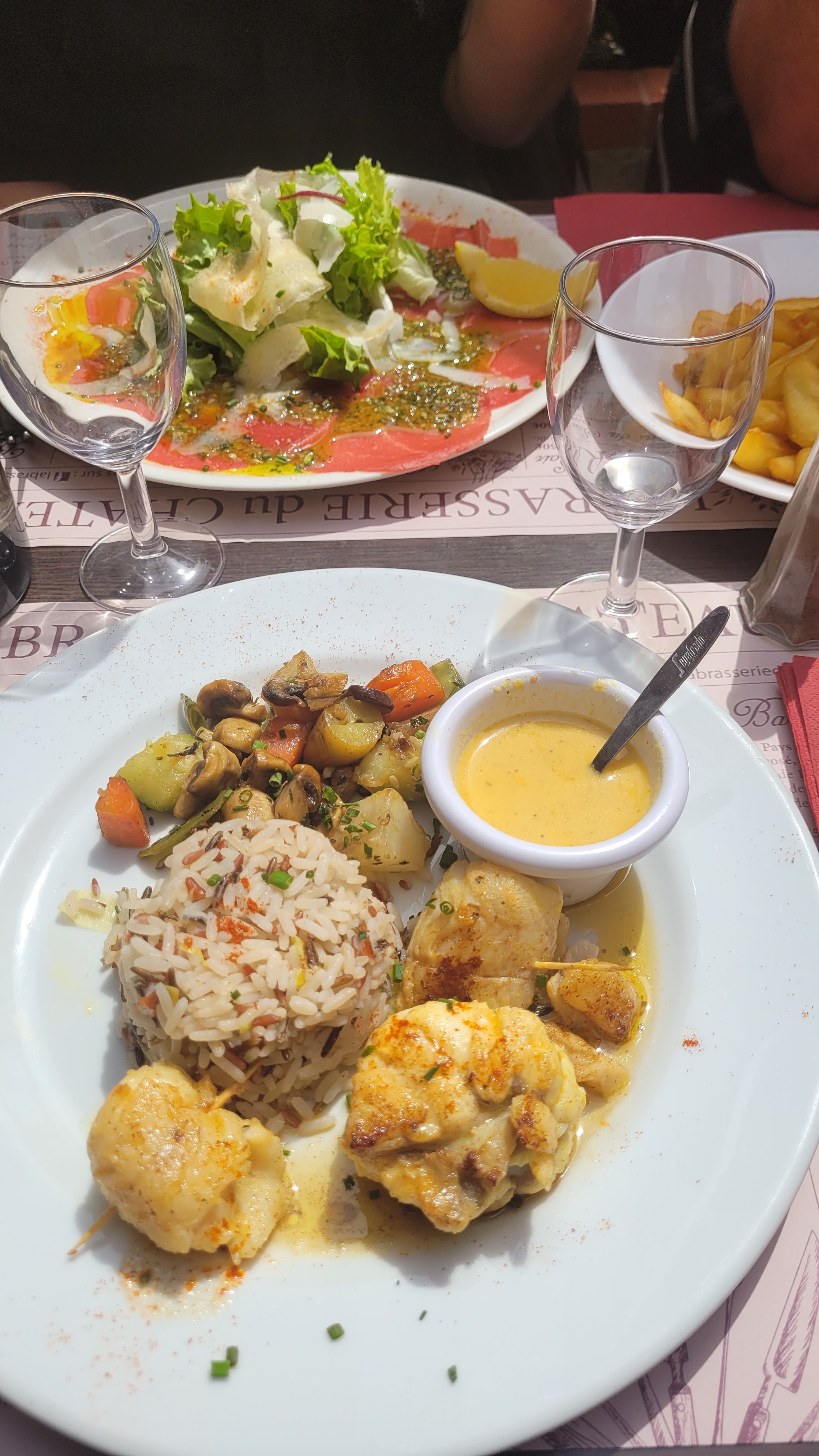 Merci au petit couple d amoureux qui se plie en 2 pour vous servir dans les meilleurs conditions, le tout face au chateau. Bravo au chef la cuisine est bonne !!