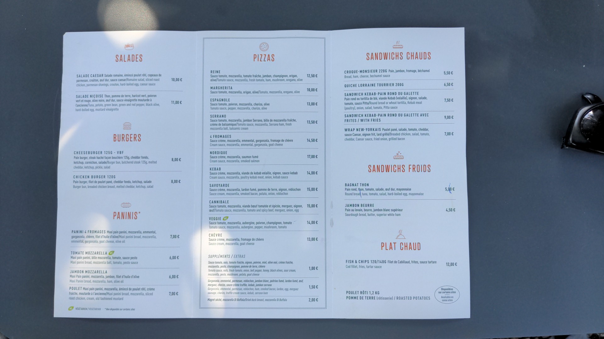 Prix corrects. Attention la carte prise en photo est celle de juillet 2023 et certains prix ont augmenté de 2€. Terrasse très agréable avec notamment des canapés sous très larges palmiers. C'est la brasserie du camping du Kérou, les non-résidents peuvent consommer.