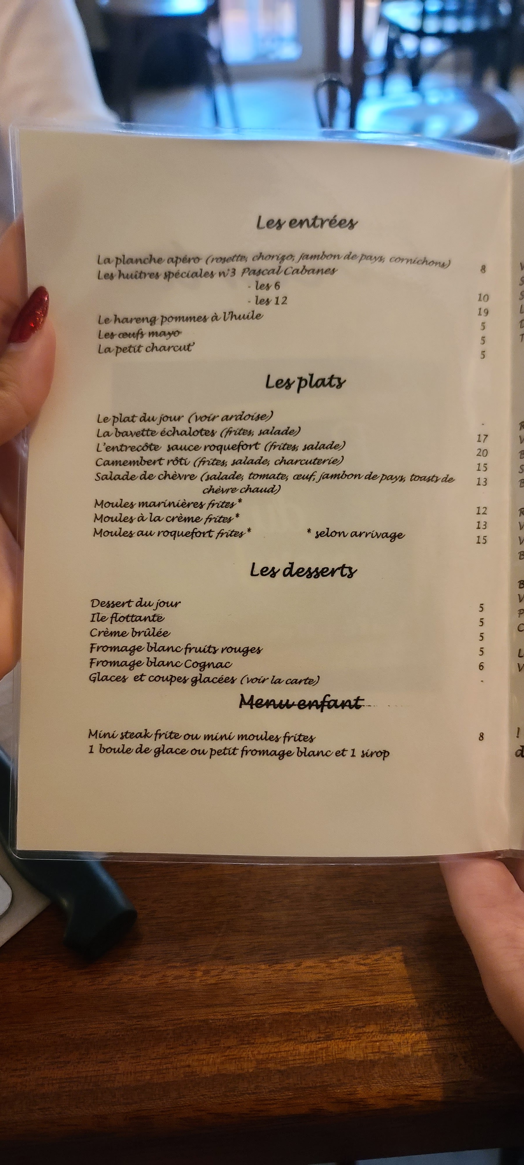 Très bon accueil. Excellente nourriture : Les huîtres étaient fameuses ainsi que les moules à la crème et le poisson du jour. Dommage qu’il n’y ai pas de carte, il faut lire sur différentes ardoises réparties un peu partout. Je ne mets pas les 5 étoiles à cause du prix que je trouve un peu excessif pour un restaurant qui n’est pas en bord de mer.
