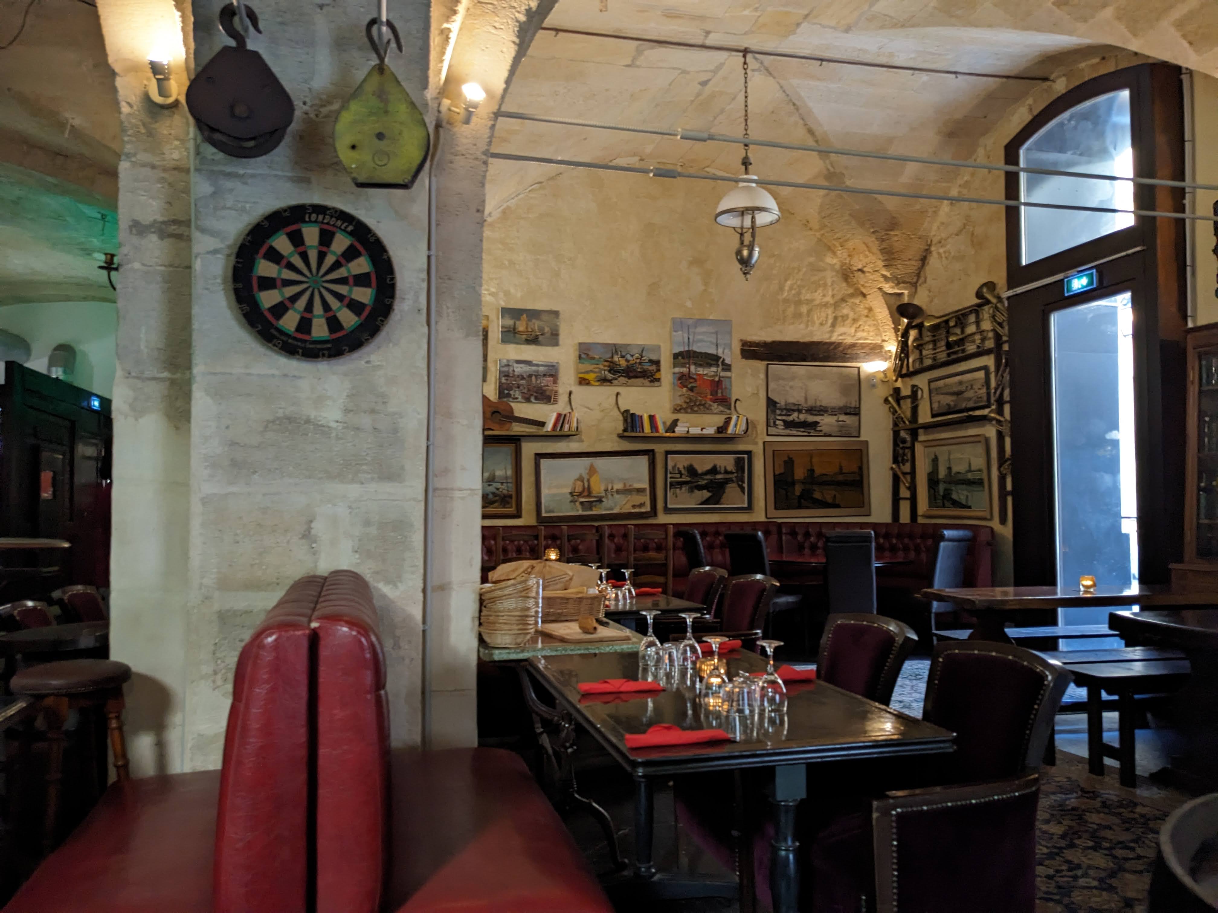 Nous cherchions un endroit pour dîner lors de notre première nuit à Bordeaux et avons trouvé cet endroit. Il était un peu tôt pour le dîner, nous avons donc pris un verre en attendant. Nous n'étions pas sûrs de dîner dans un bar, mais je suis content que nous soyons restés. La décoration montrait beaucoup d'histoire et était soignée. Notre serveur, Jefferson, était très sympathique et attentif à notre table. La nourriture était vraiment délicieuse - les saveurs étaient saines et tout dans l'assiette se complétait. Nous avons eu le burger de bœuf, le filet de canard et la salade du chef ce soir-là. En regardant le menu, tout semblait assez simple, mais lorsque nous avons mangé, nous avons été très impressionnés. C'était vraiment de grande qualité, de bonnes portions et rien ne manquait. Nous vous recommandons vivement de dîner à La Brasserie Du Port.