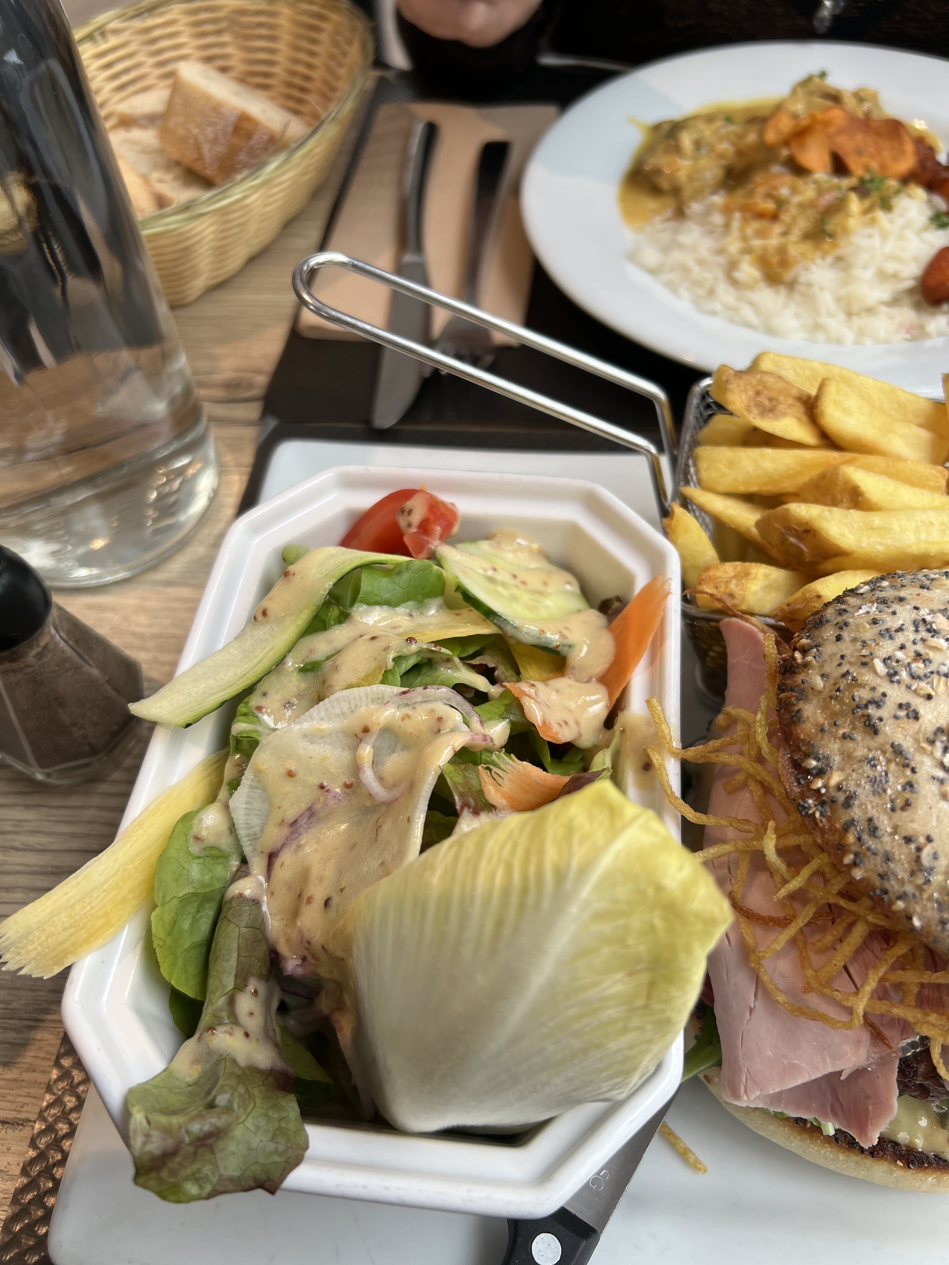 Pour une 1ére c’était bien sympa. Un menu complet (entrée, plat, dessert, café) à 17€, et quoi d’autre? Et bien une carte fort sympathique, et comme on est venu un peu tard et que le plat du jour est victime de son succès, on a pris des salades : copieuses et bonnes. La prochaine fois on réserve la place et le plat du jour😉