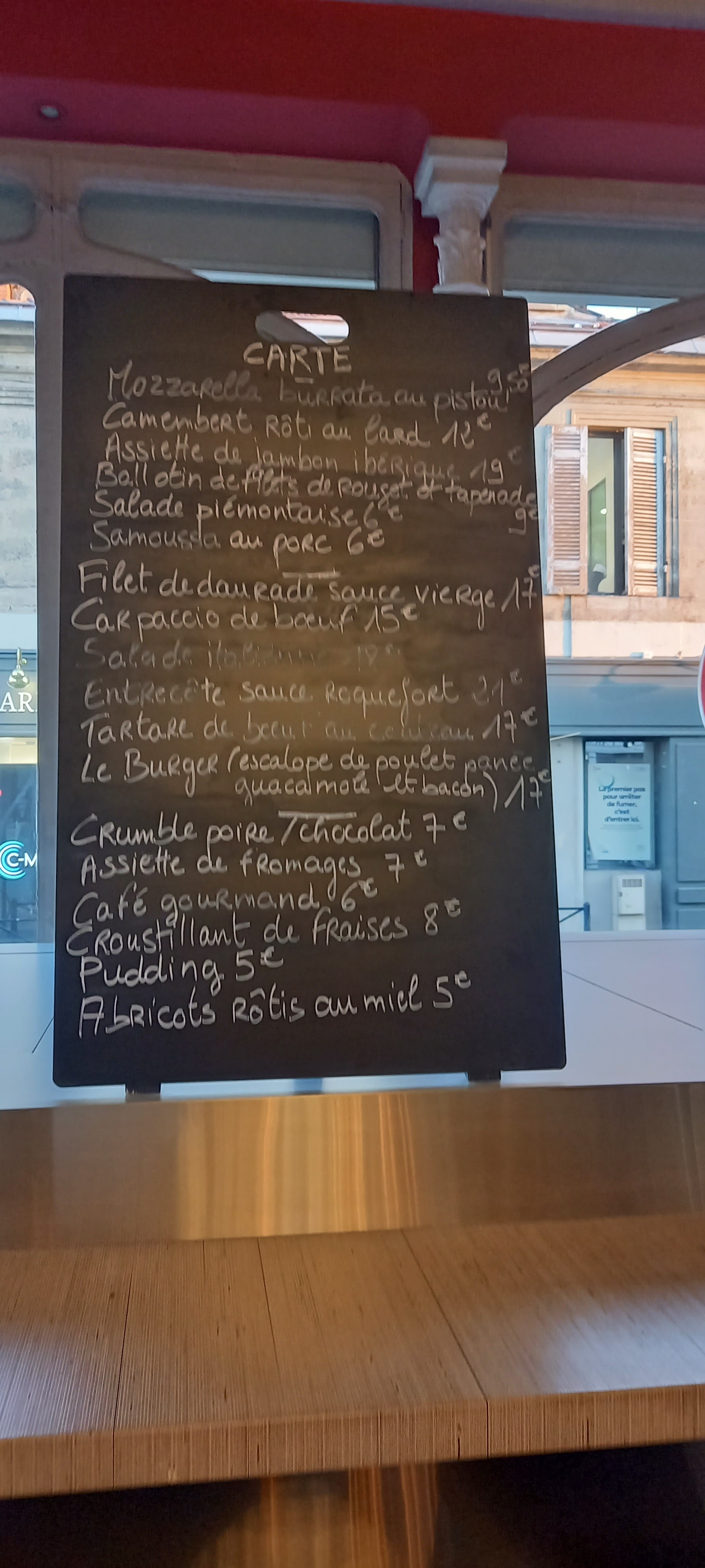 Carte simple mais sympathique. Un plat du jour très agréable, poulet champignons et écrasée de pomme de terres maison accompagné pour finir par un café gourmand qui change de ce que l'on trouve dans les autres brasseries. Tout ce qui proposé à la carte est fait maison. Un endroit sympathique pour déjeuner le midi.
